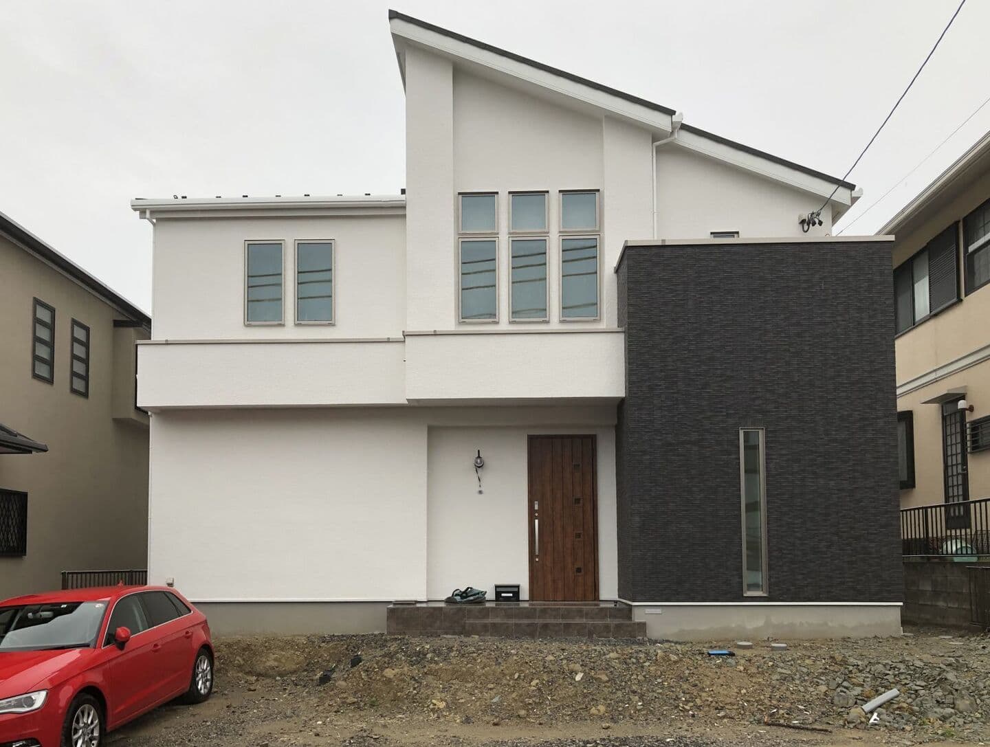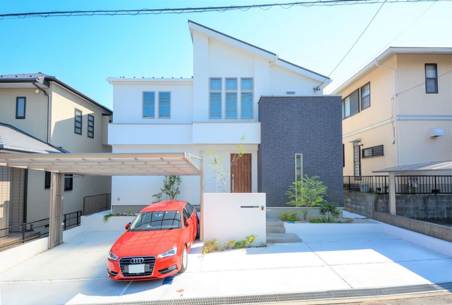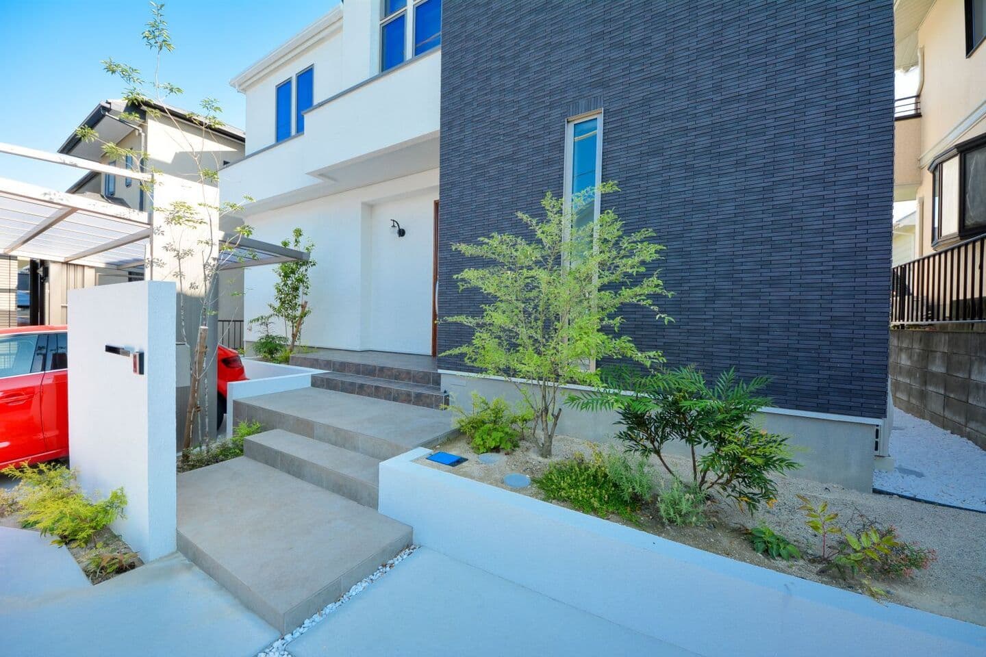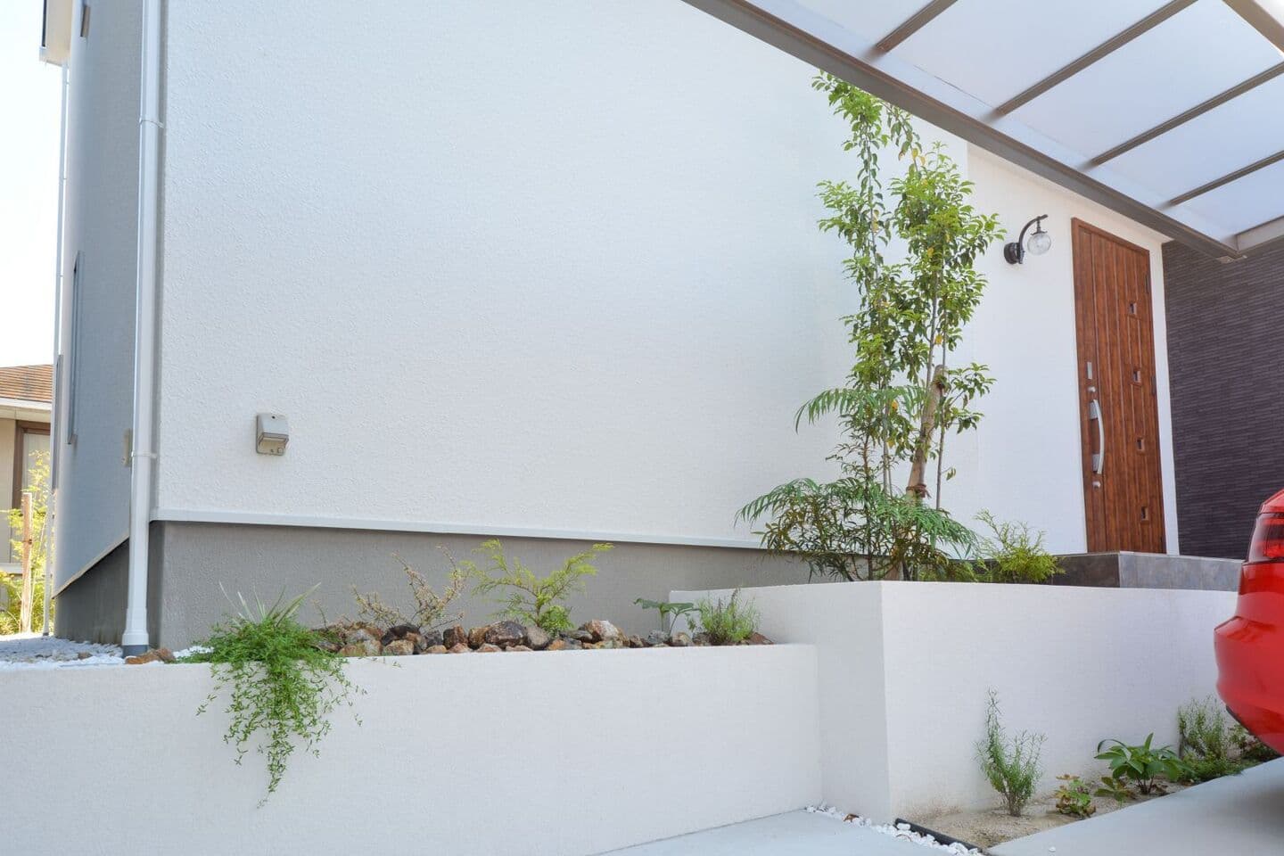 建物は白色がメインのため、それに合わせて白を基調としポイントでグレーのタイルや緑を使い、シンプルな外構をご提案しました。
