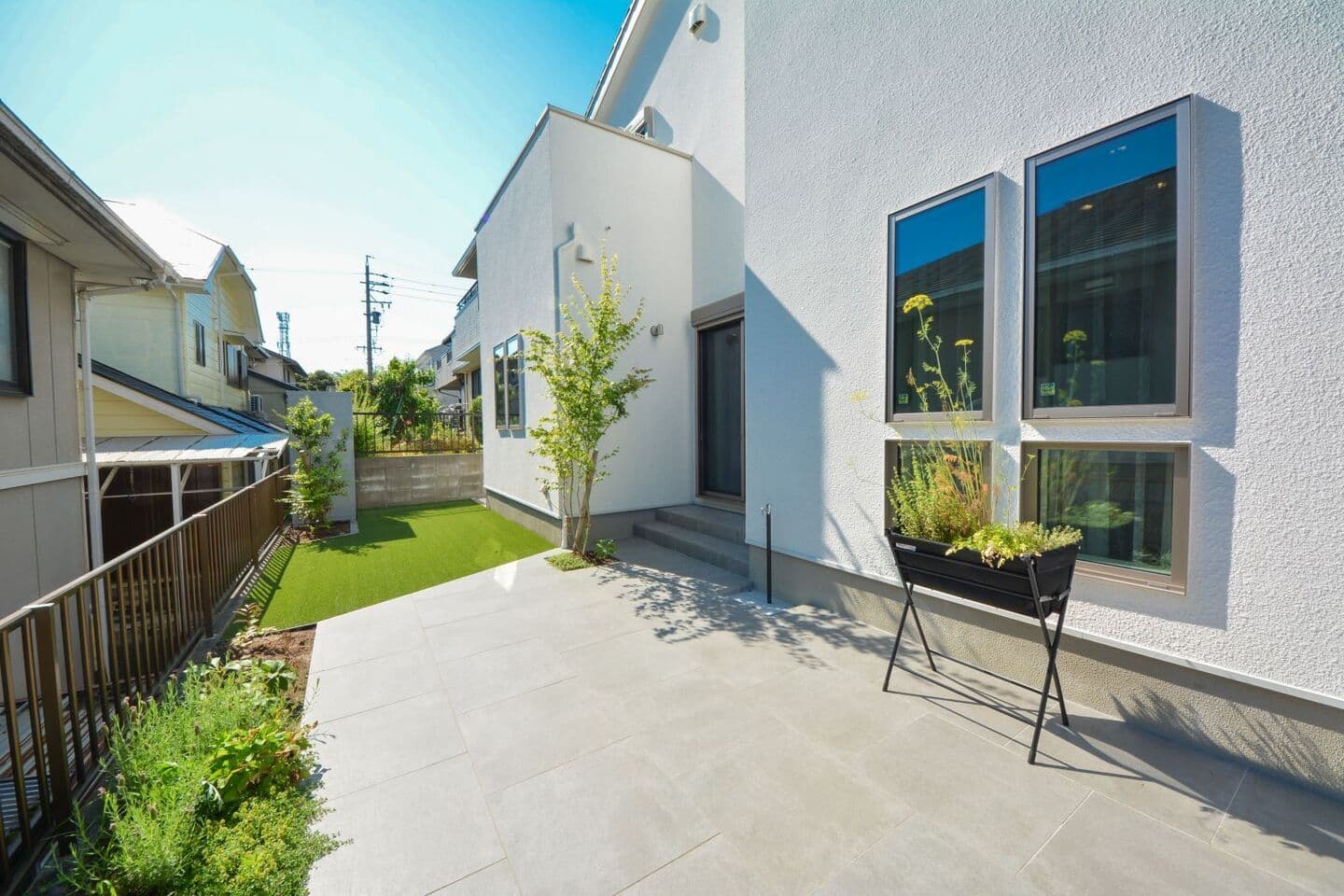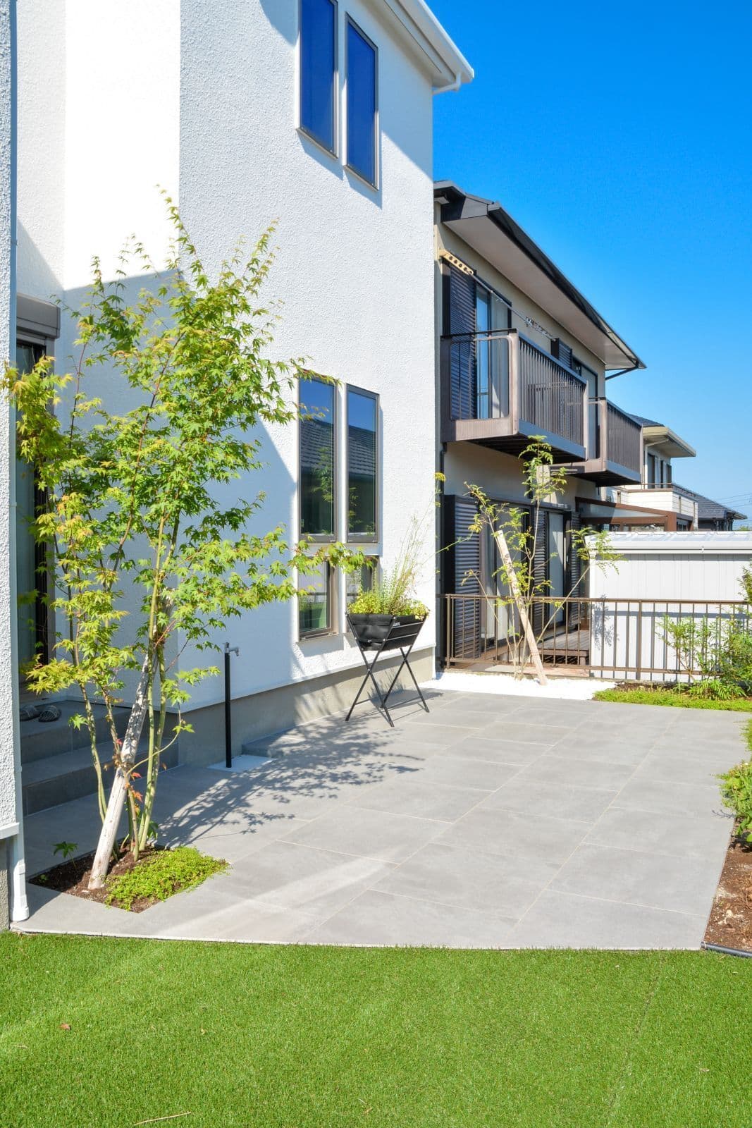 お庭側はグレーのタイルテラスを中心に植栽を配置。家の中から見たときもお庭で過ごすときも緑が感じられるようなデザインにしました。