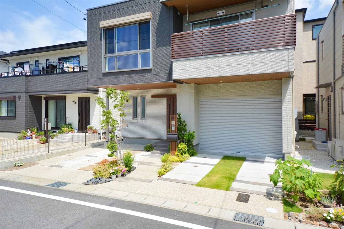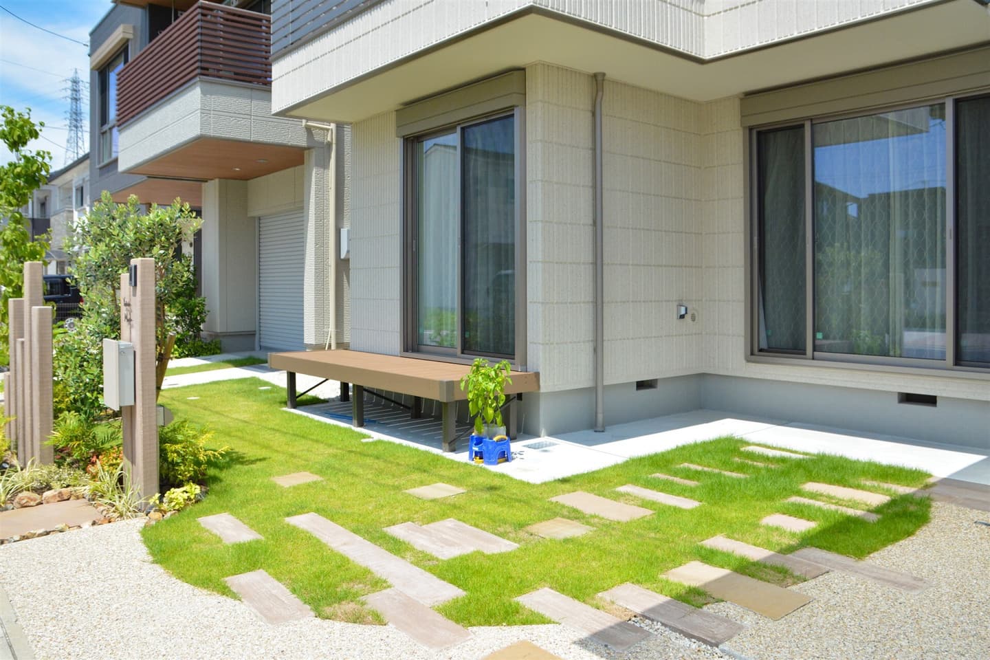 お好みの素材のコンクリート製枕木や石材、洗い出しコンクリート、芝生などを使って統一感を出し、つながりを感じられるようにデザインしました。