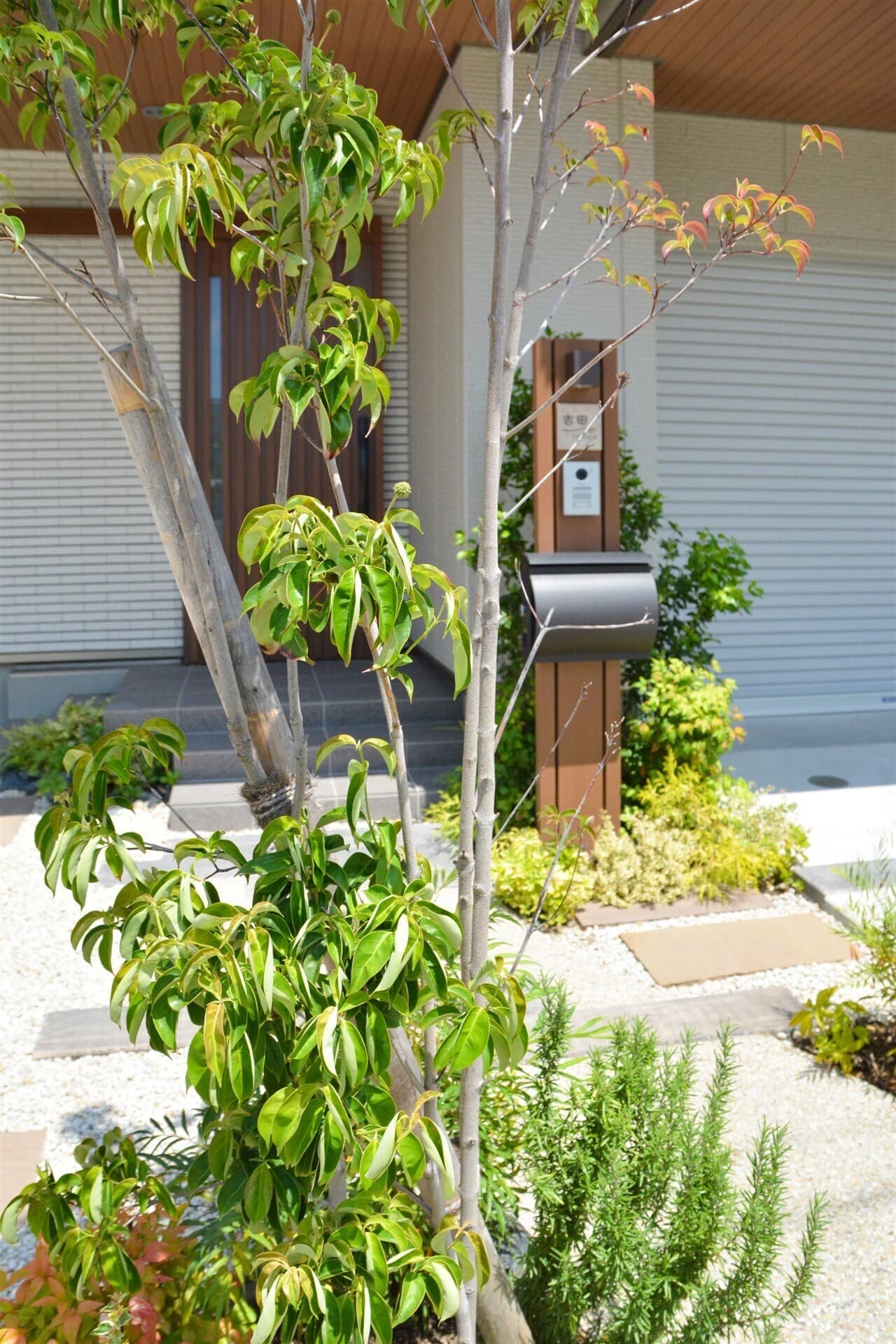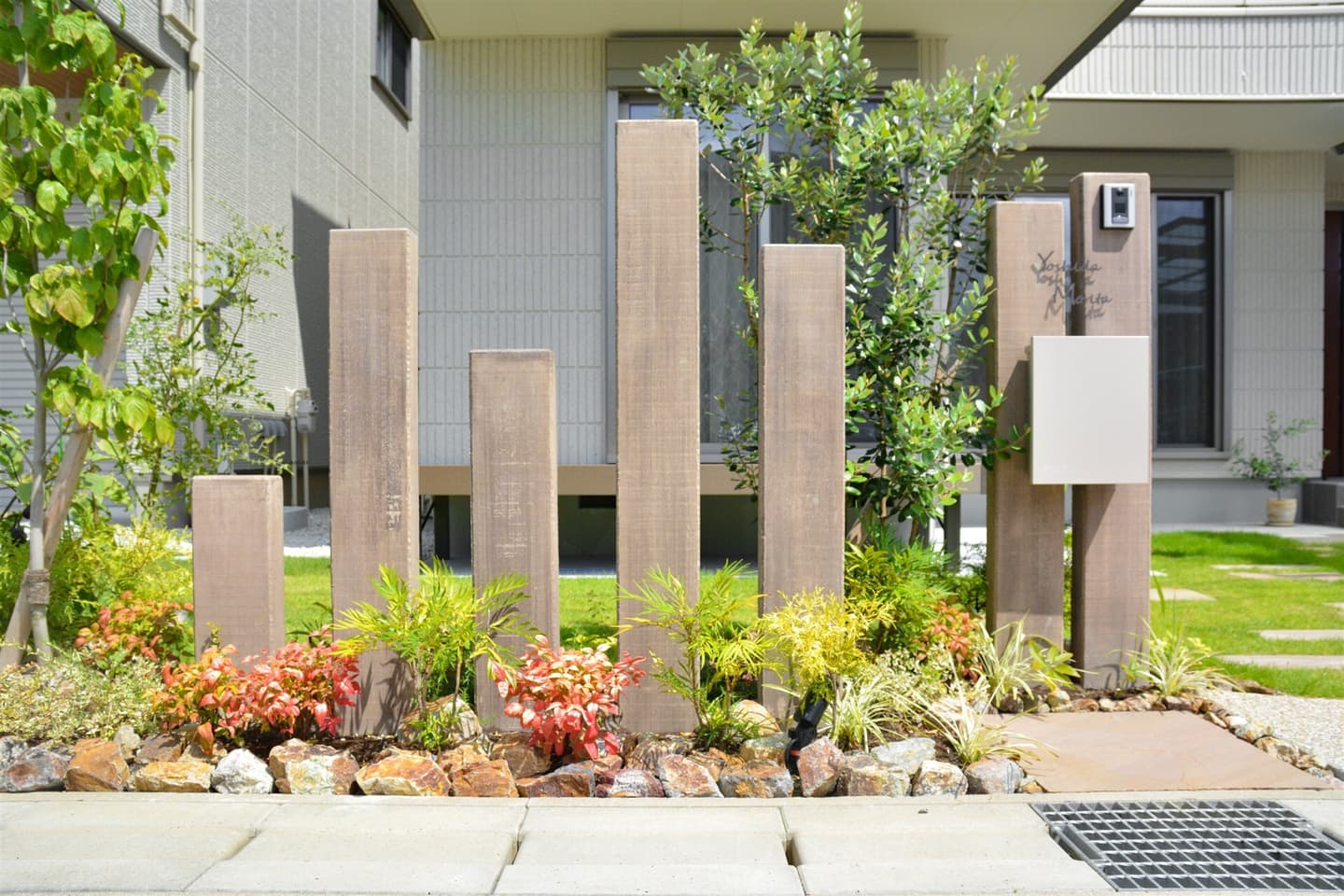 道路沿いには門柱と同じ素材の枕木と植栽を配置し、お庭と駐車場をやさしく区切るようにしました。