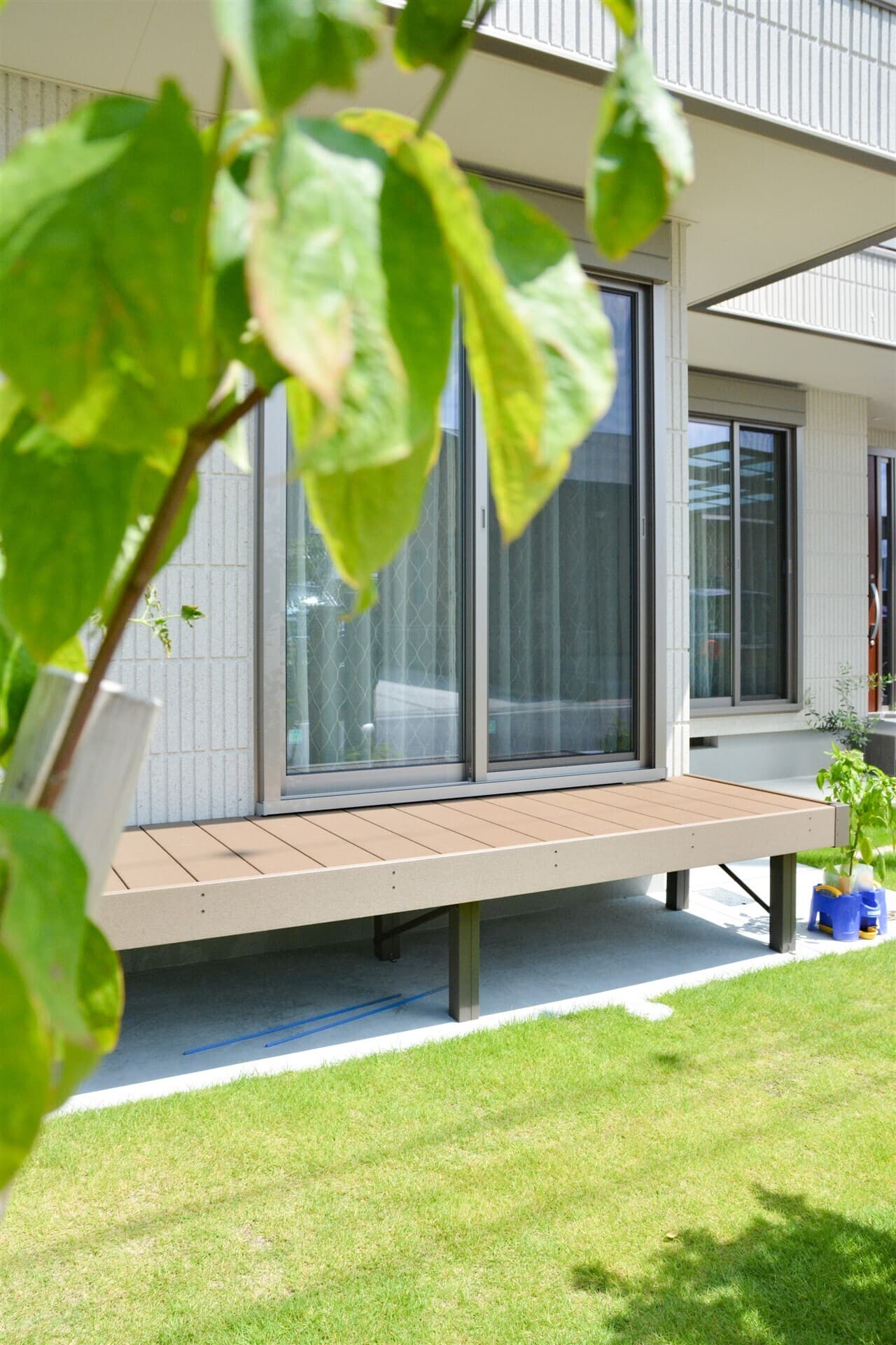 お庭はご両親と娘さんご夫婦が共有で使える空間とし、なるべく広くとれるようにプランしました。掃き出し窓前のデッキを中心としたお庭で、ゲスト用の駐車スペースも普段はお庭として使えるように、轍部分に枕木や石材を並べています。