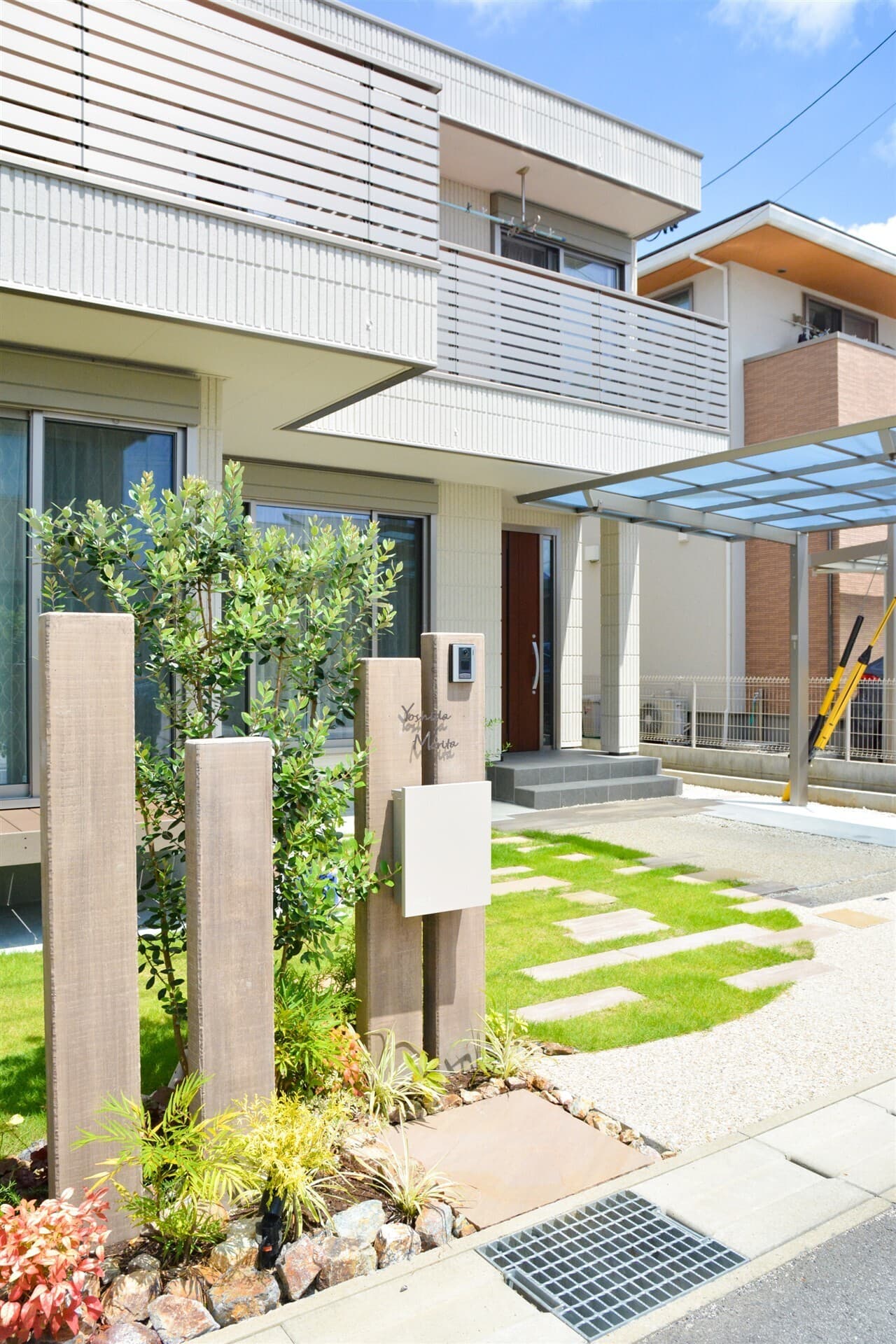 一台用のカーポートは玄関へアクセスしやすい場所に配置。アプローチは建物近くを通らないように、道路沿いの門柱部分からカーポート近くを通るような動線にしました。