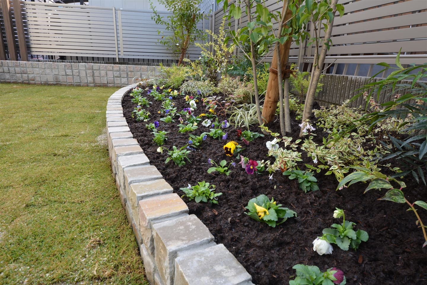 ご家族で一緒に季節のお花を植えたり家庭菜園ができるようにピンコロで大きな花壇を作成。冬の季節、きれいに花を咲かせてくれるビオラやパンジーを植えました。