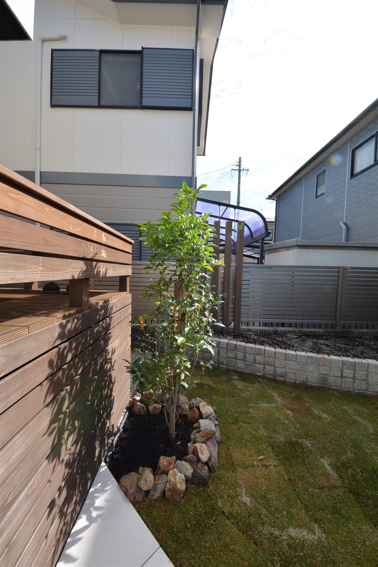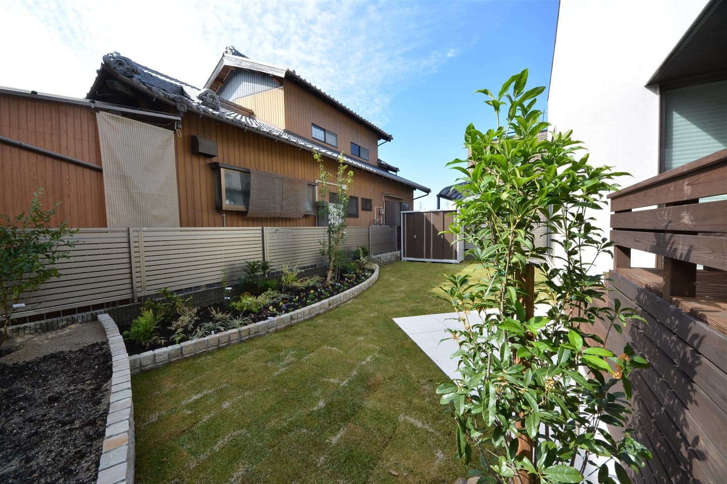 花壇以外のところはまだ小さいお子様がのびのびと遊べるように芝生を敷きました。