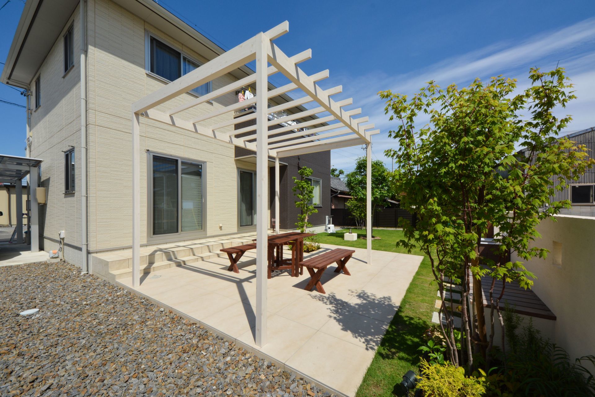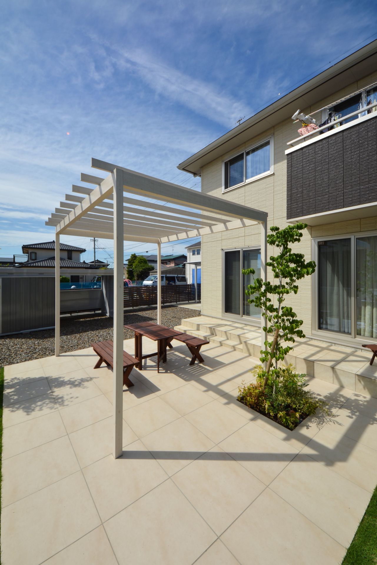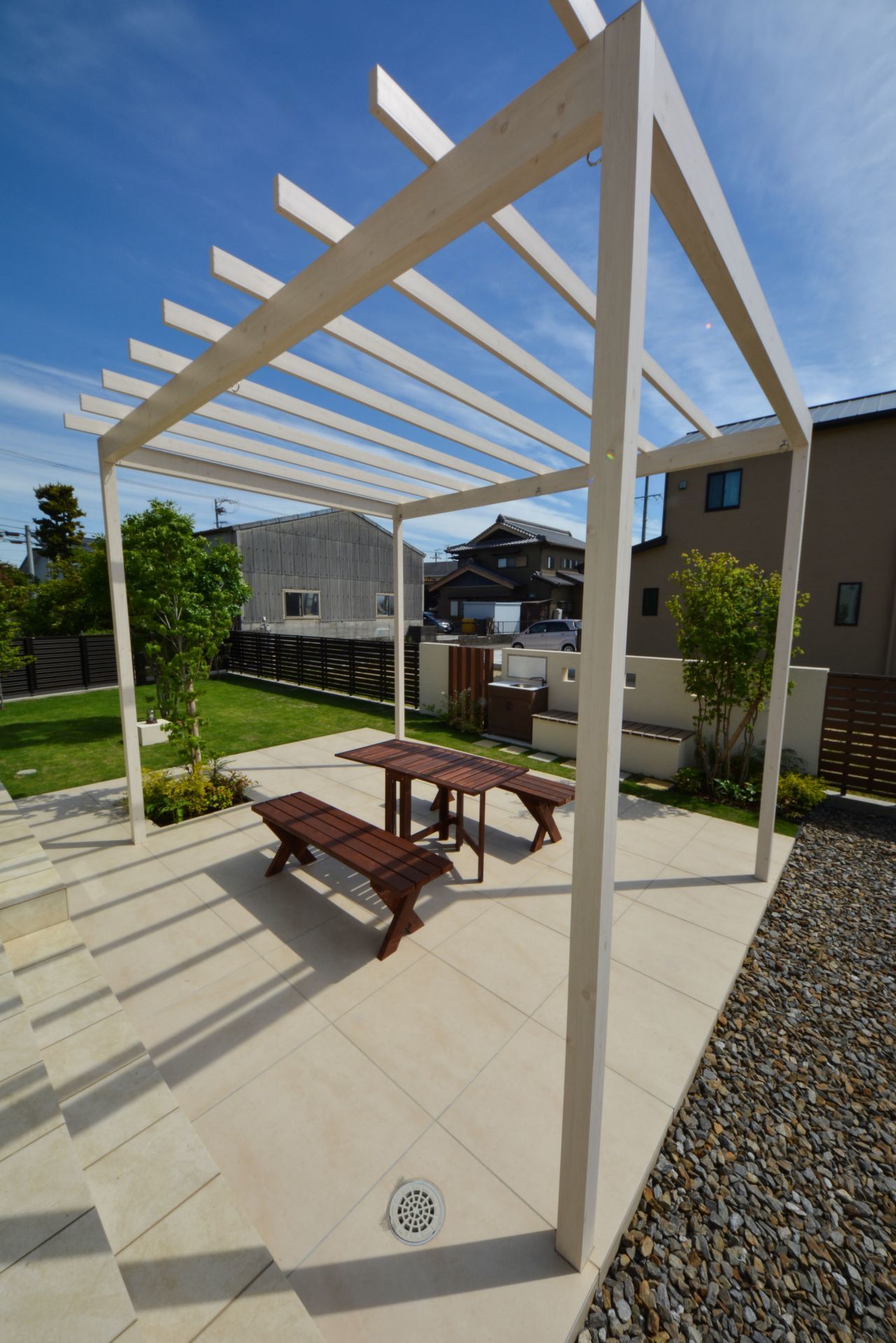 土のままだったお庭には、使い勝手が良く、管理が楽ちんなタイル敷きスペースと、お子様が走り回って遊べる芝生のスペースをつくりました。パーゴラのあるタイル敷きスペースは、ご家族が自然と集まる、団らんの空間にもなります。