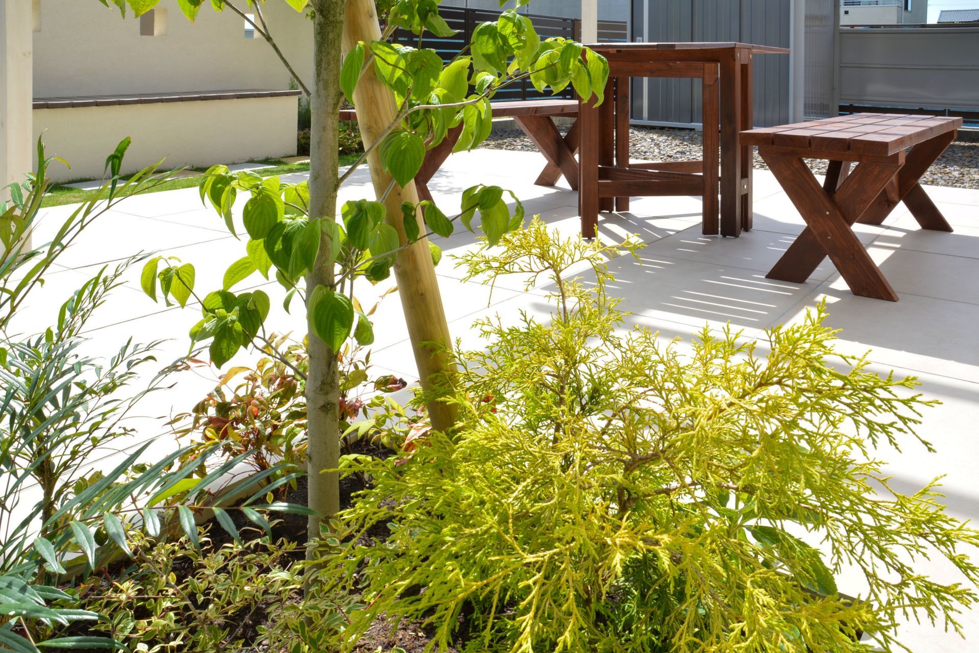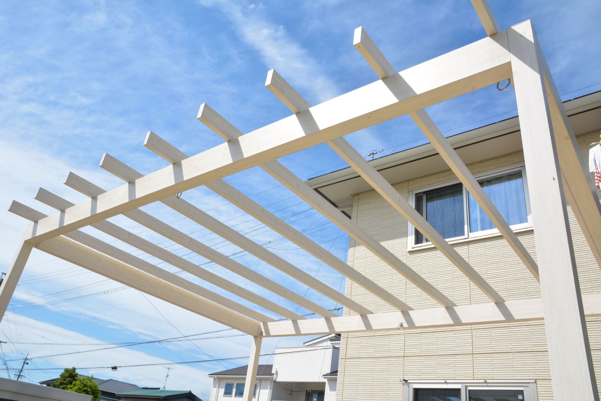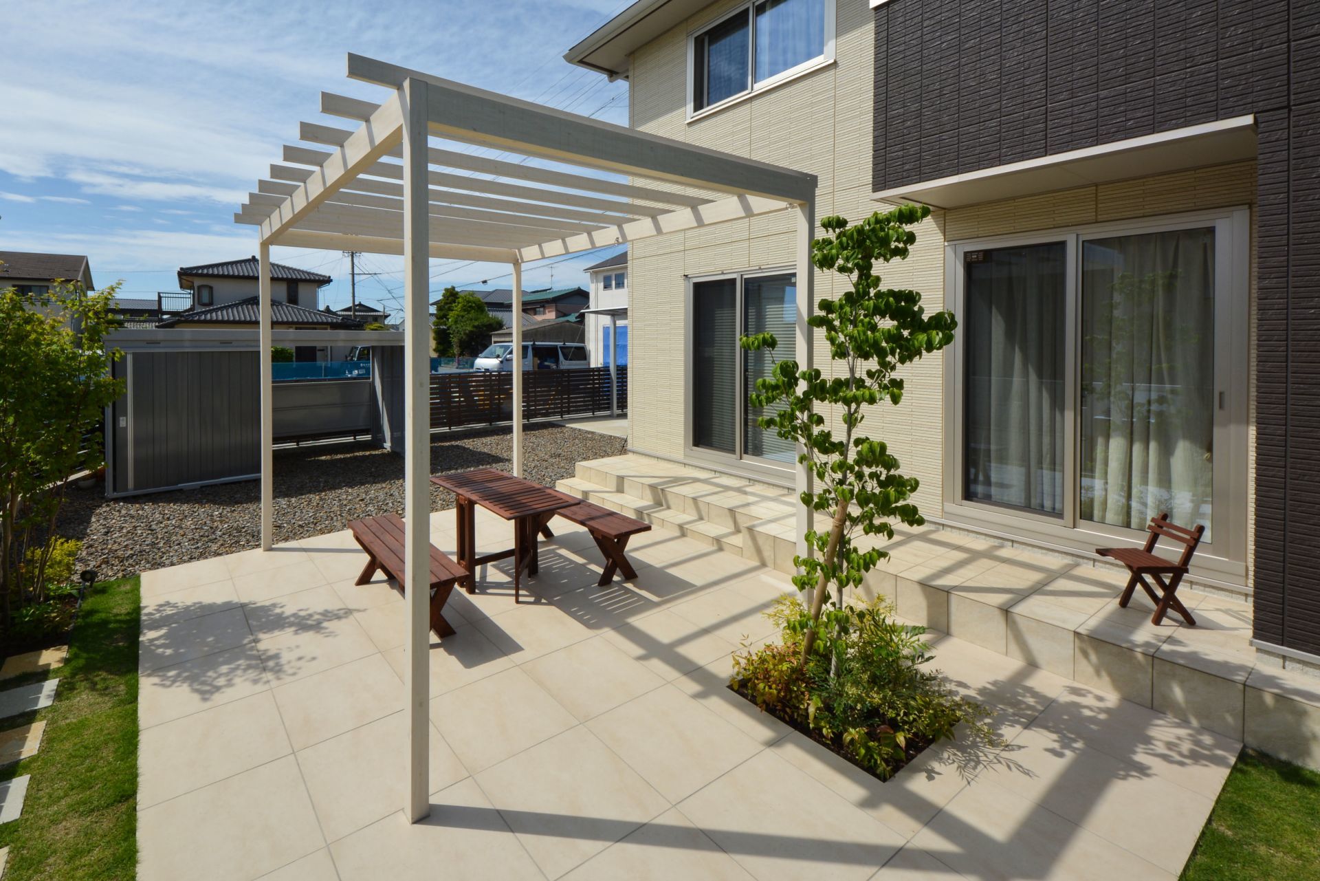 土のままだったお庭には、使い勝手が良く、管理が楽ちんなタイル敷きスペースと、お子様が走り回って遊べる芝生のスペースをつくりました。パーゴラのあるタイル敷きスペースは、ご家族が自然と集まる、団らんの空間にもなります。
