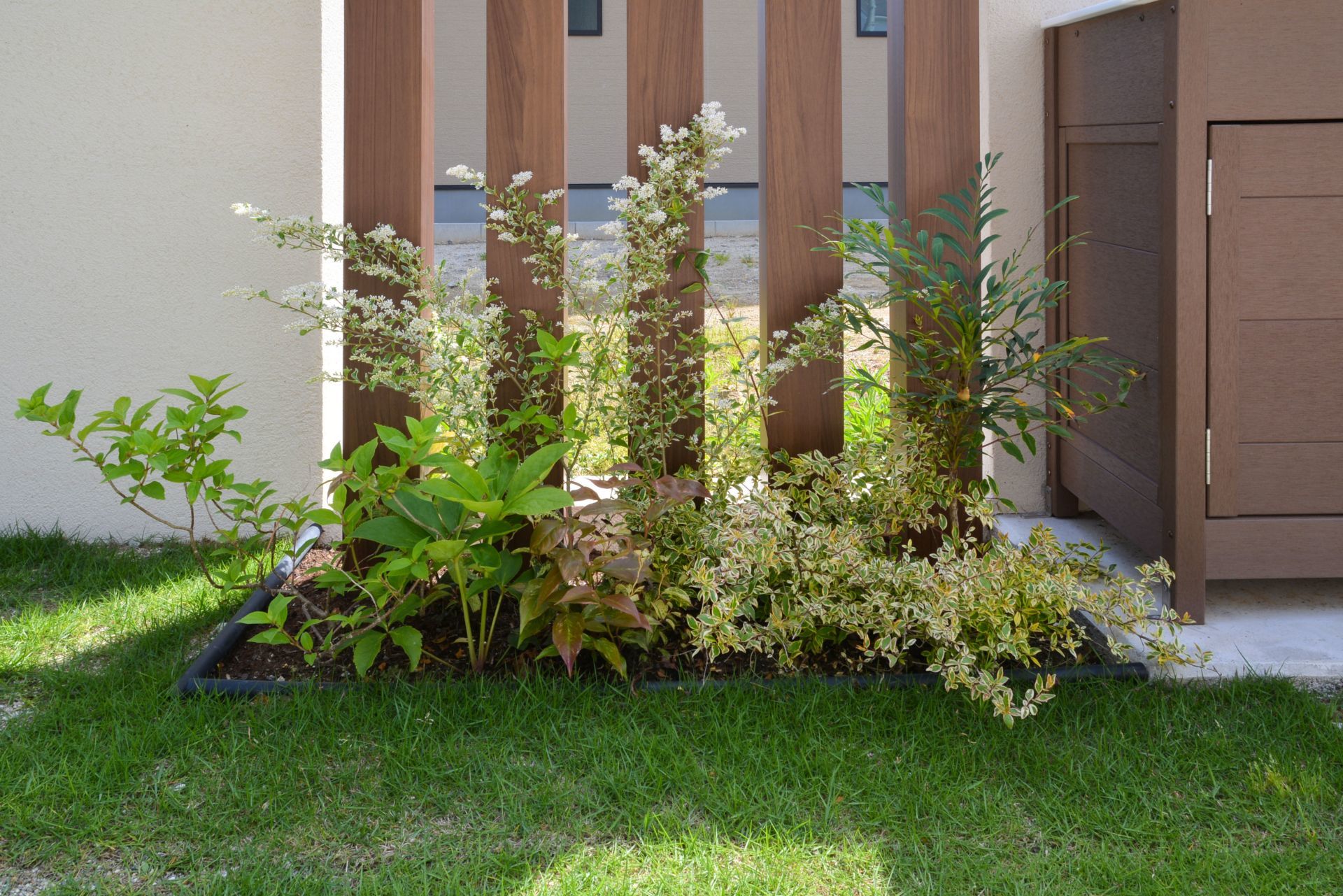 境界まわりは塗り仕上げの飾り壁、木調ポールやアルミフェンスを組み合わせて、周囲からの視線が気にならないようにしました。室内からも良く見える場所に、ポイントとなる飾り壁を設けることで、室内から眺めても楽しめるように配慮しました。