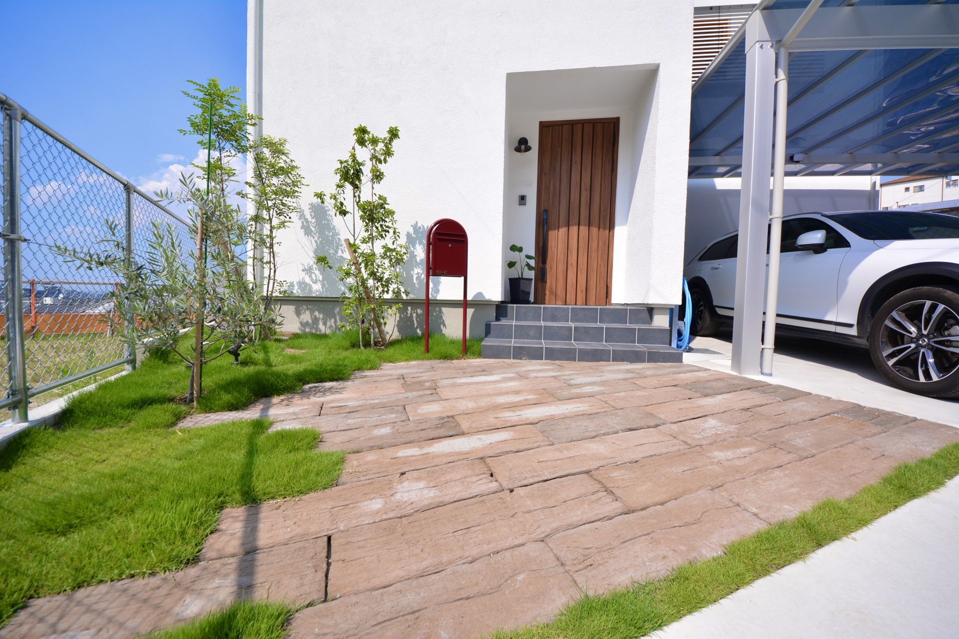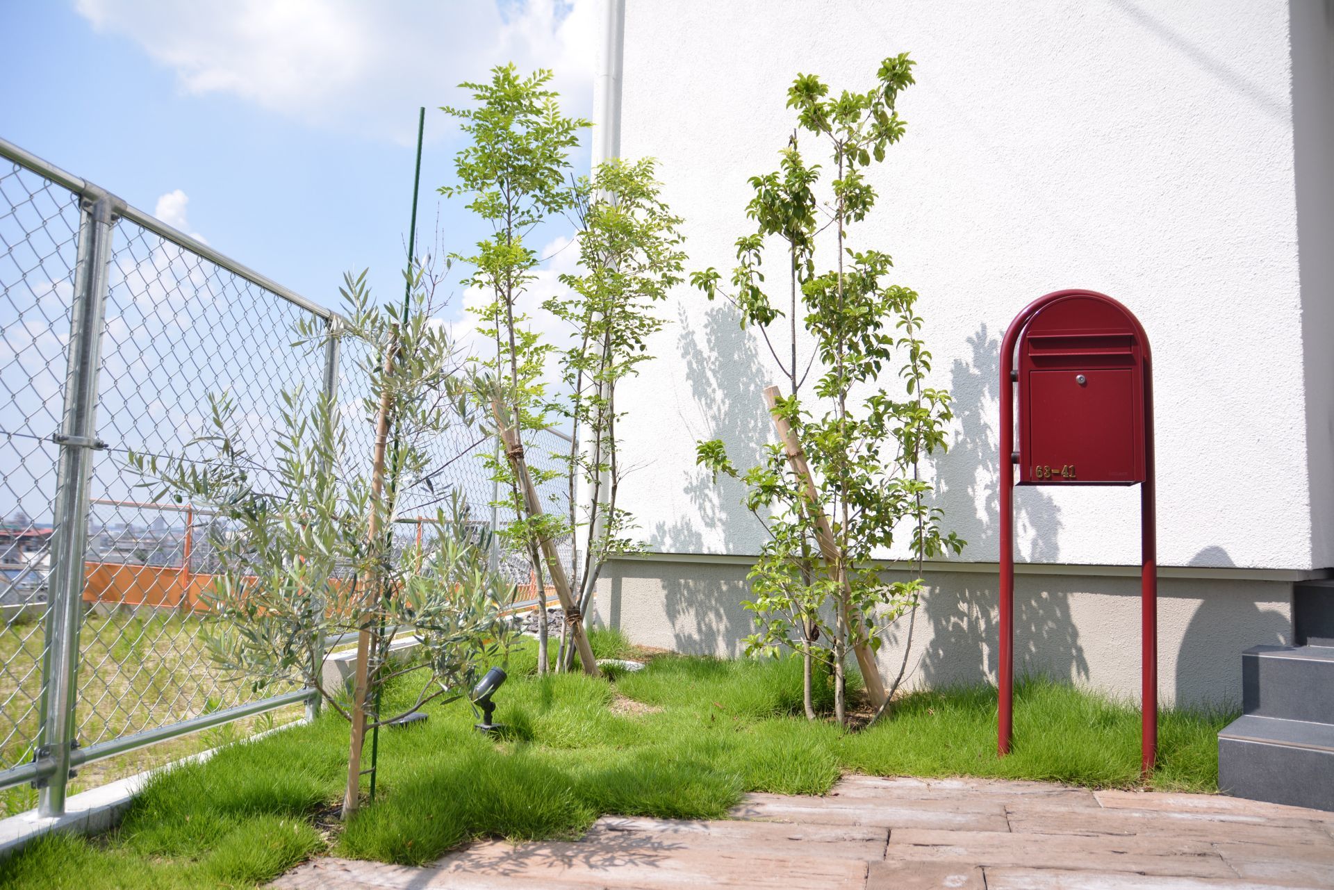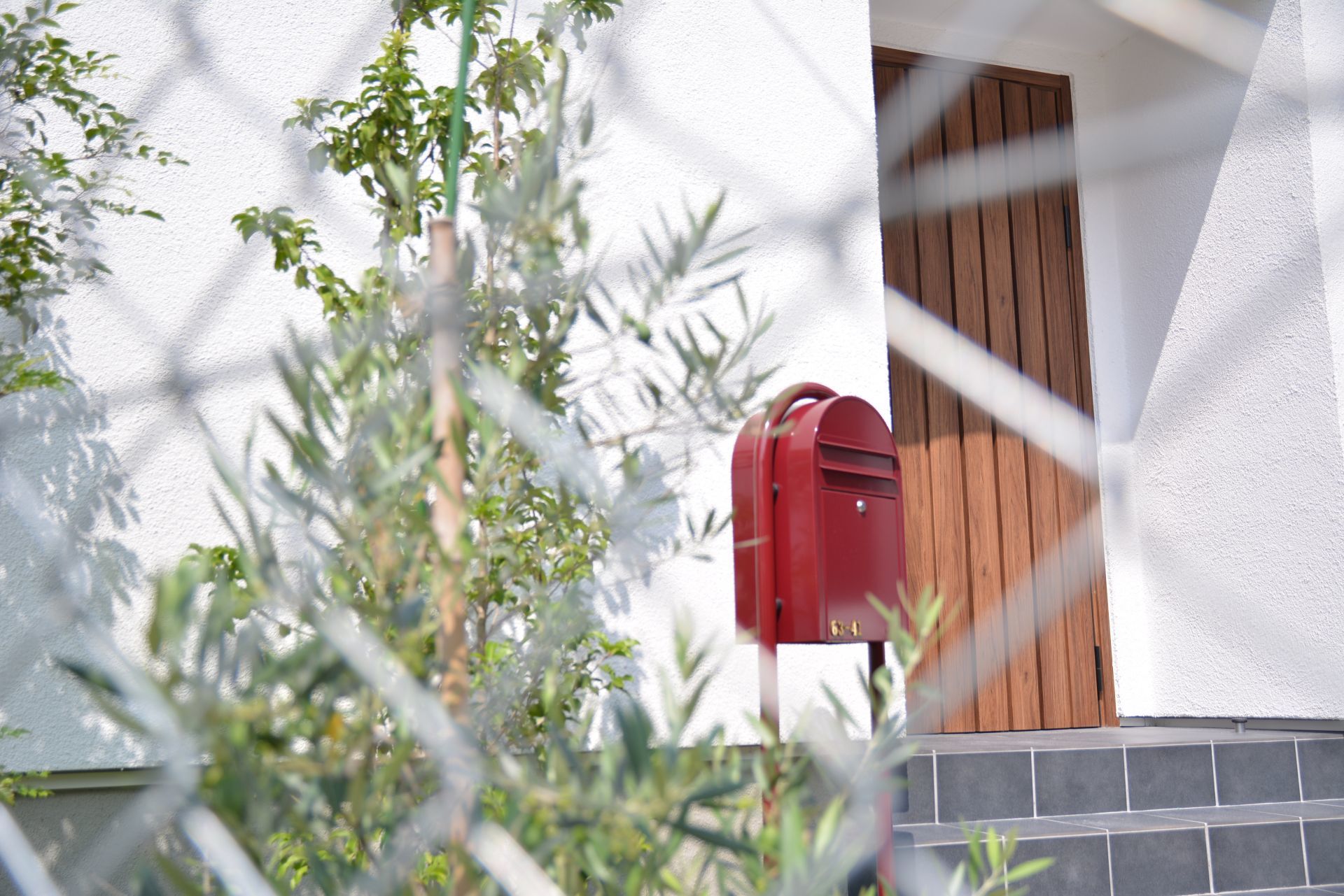 門周りはグリーンやポイントとなる赤いポストを入れ、白く美しい家と青空に良く似合う素敵なファサードになりました。