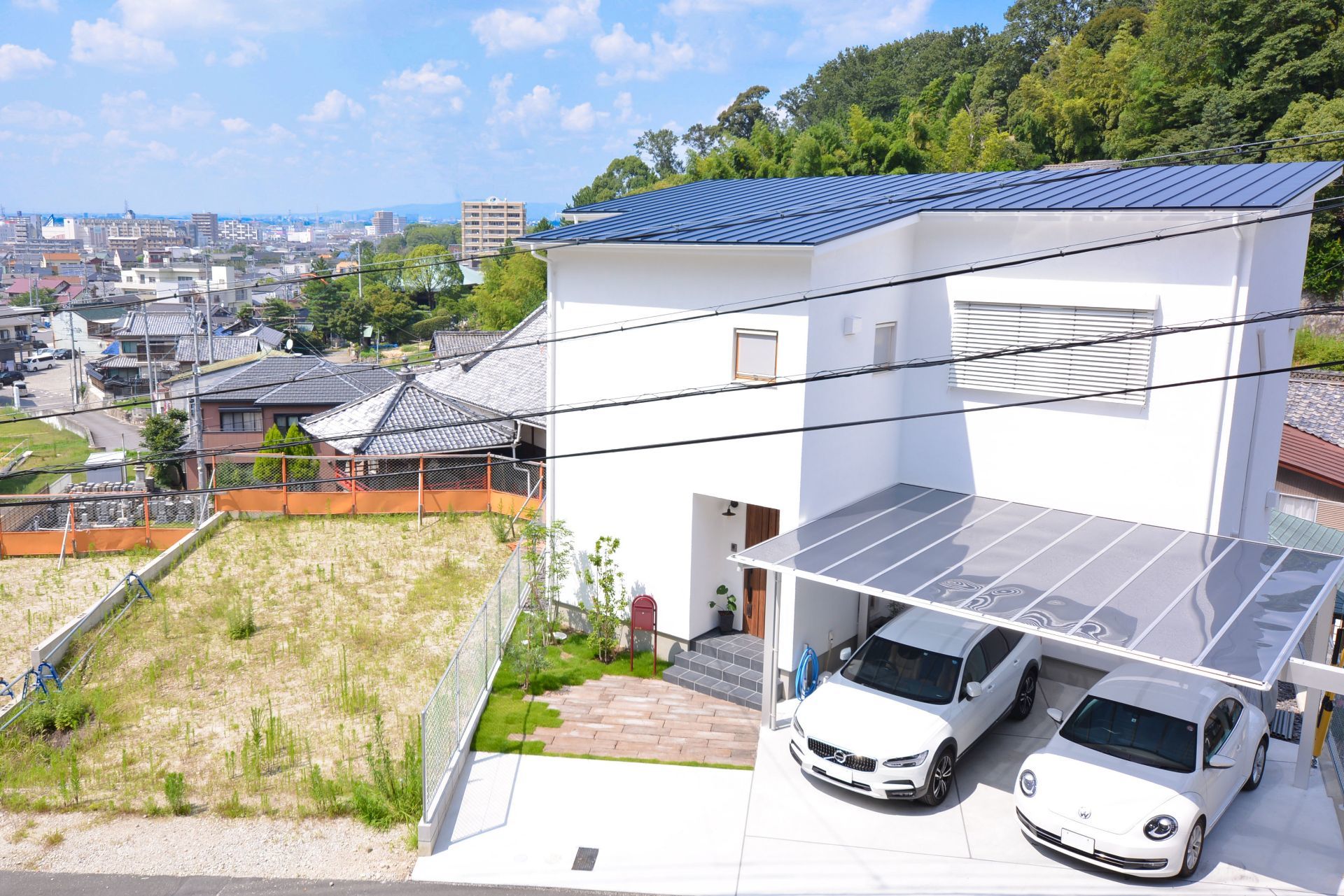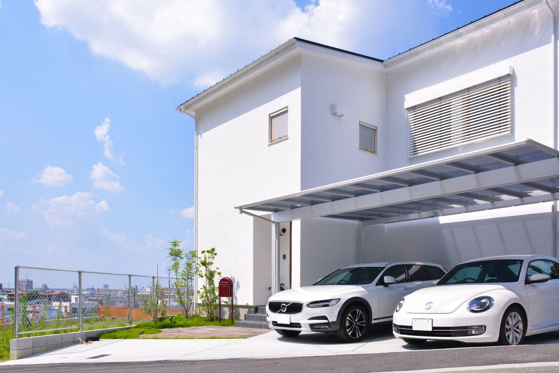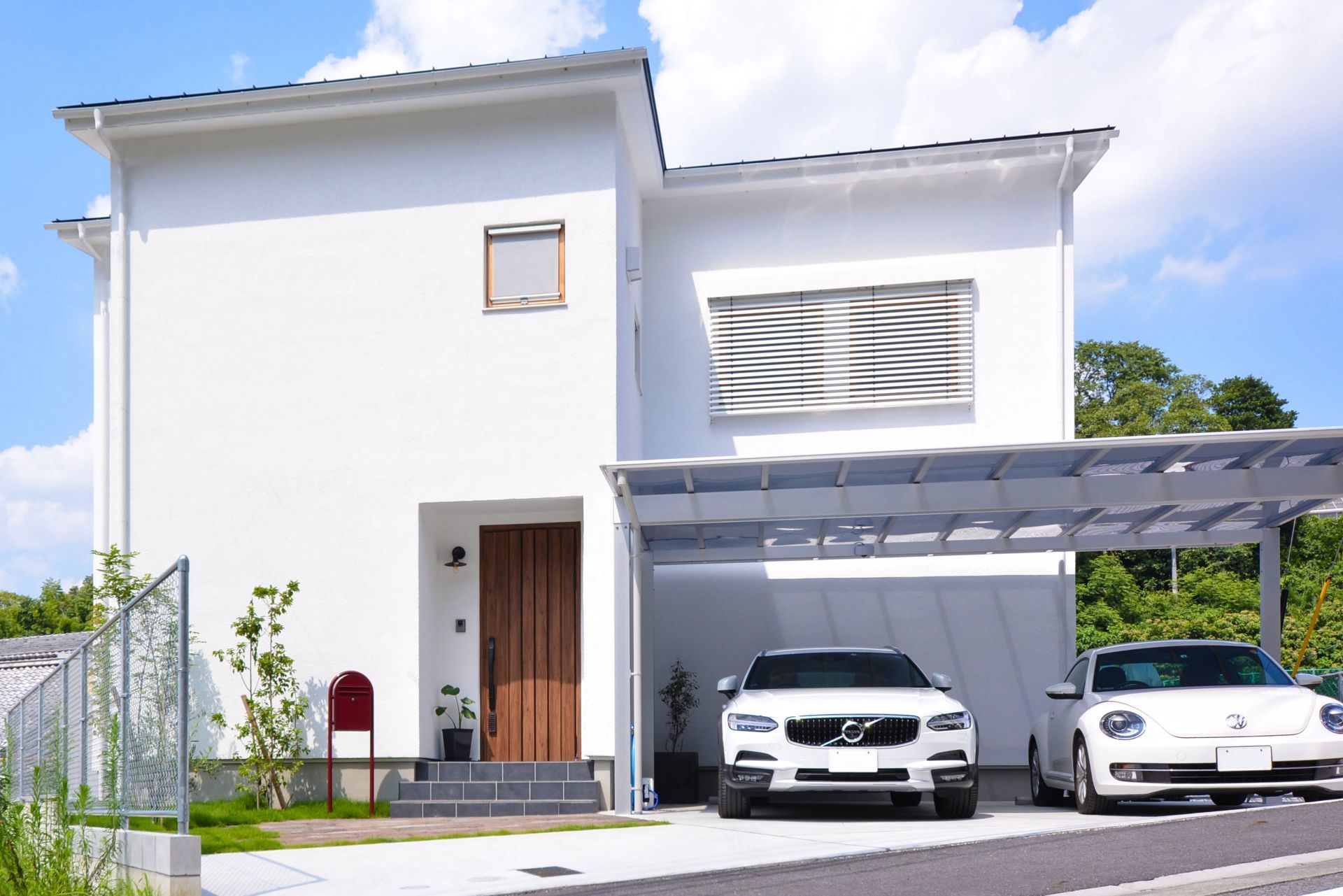 門周りはグリーンやポイントとなる赤いポストを入れ、白く美しい家と青空に良く似合う素敵なファサードになりました。