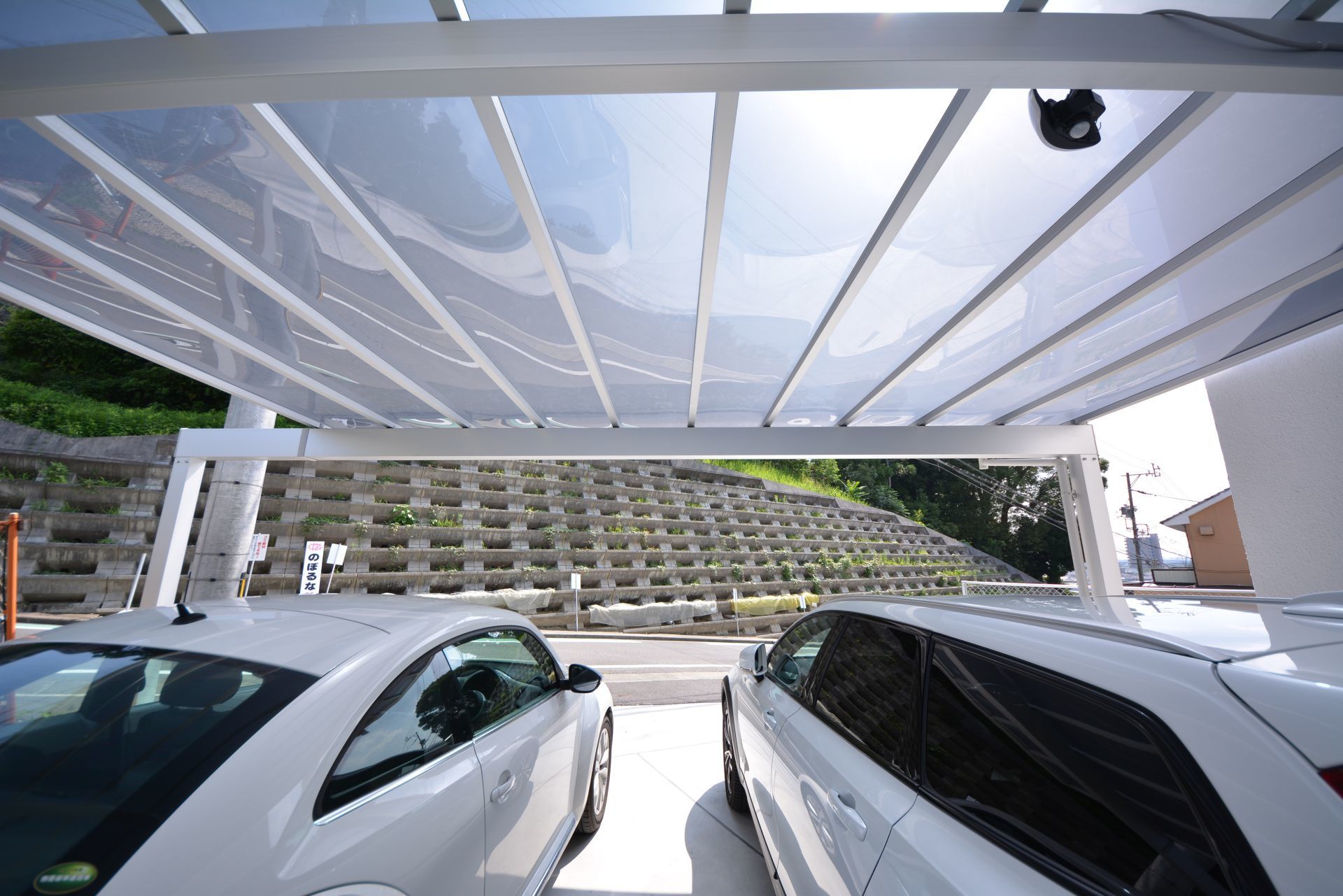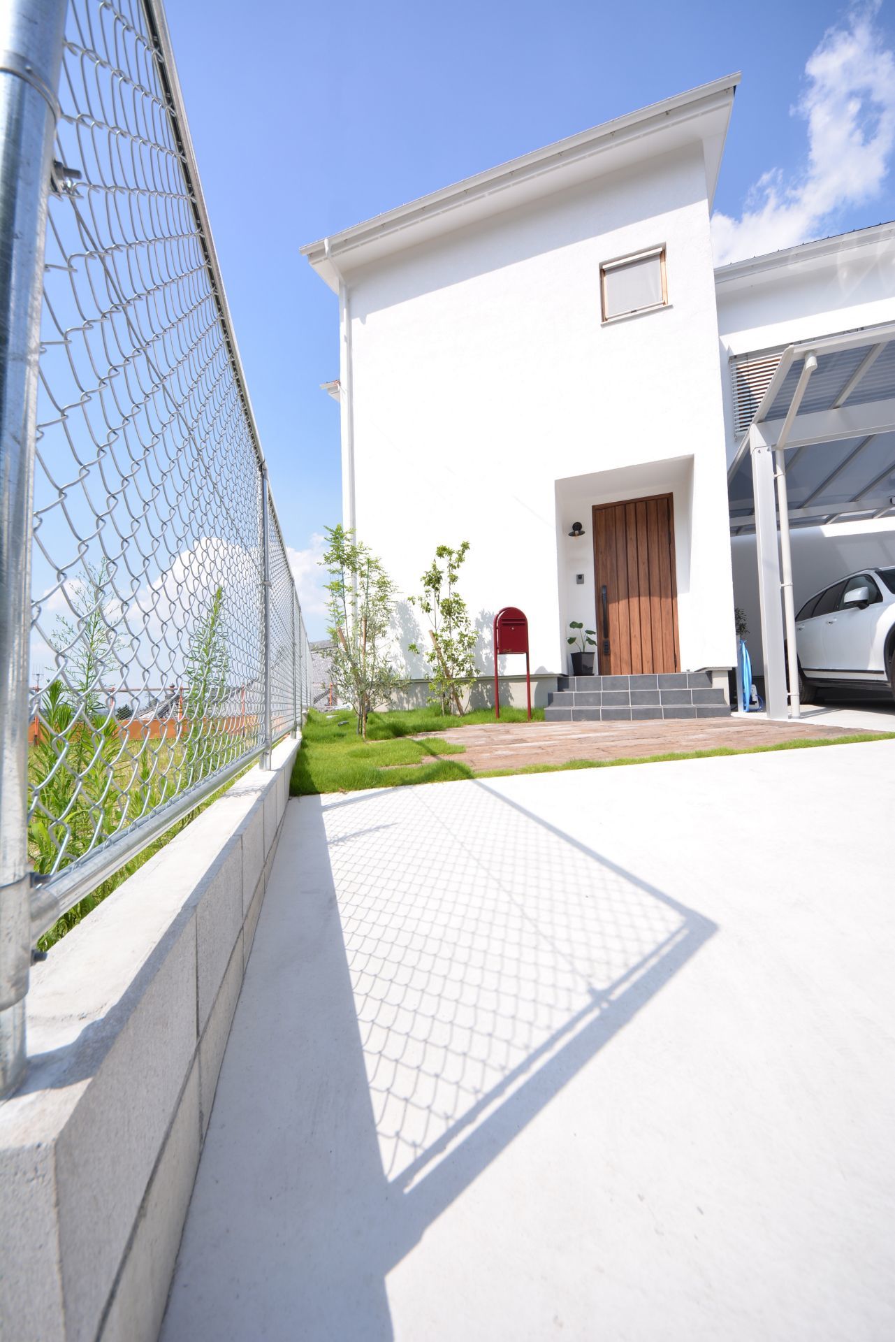 旅行好き、外遊び好きな若いご夫婦が立てた、白い建物に似合うお庭をデザインさせていただきました。ベーシックなひし形のPCフェンスで建物の回りを囲いました。この先、フェンスの新品らしい装いが剥がれてくすんできたら、パンジーをたくさん並べて飾り付けをしたい!と話してくださいました。