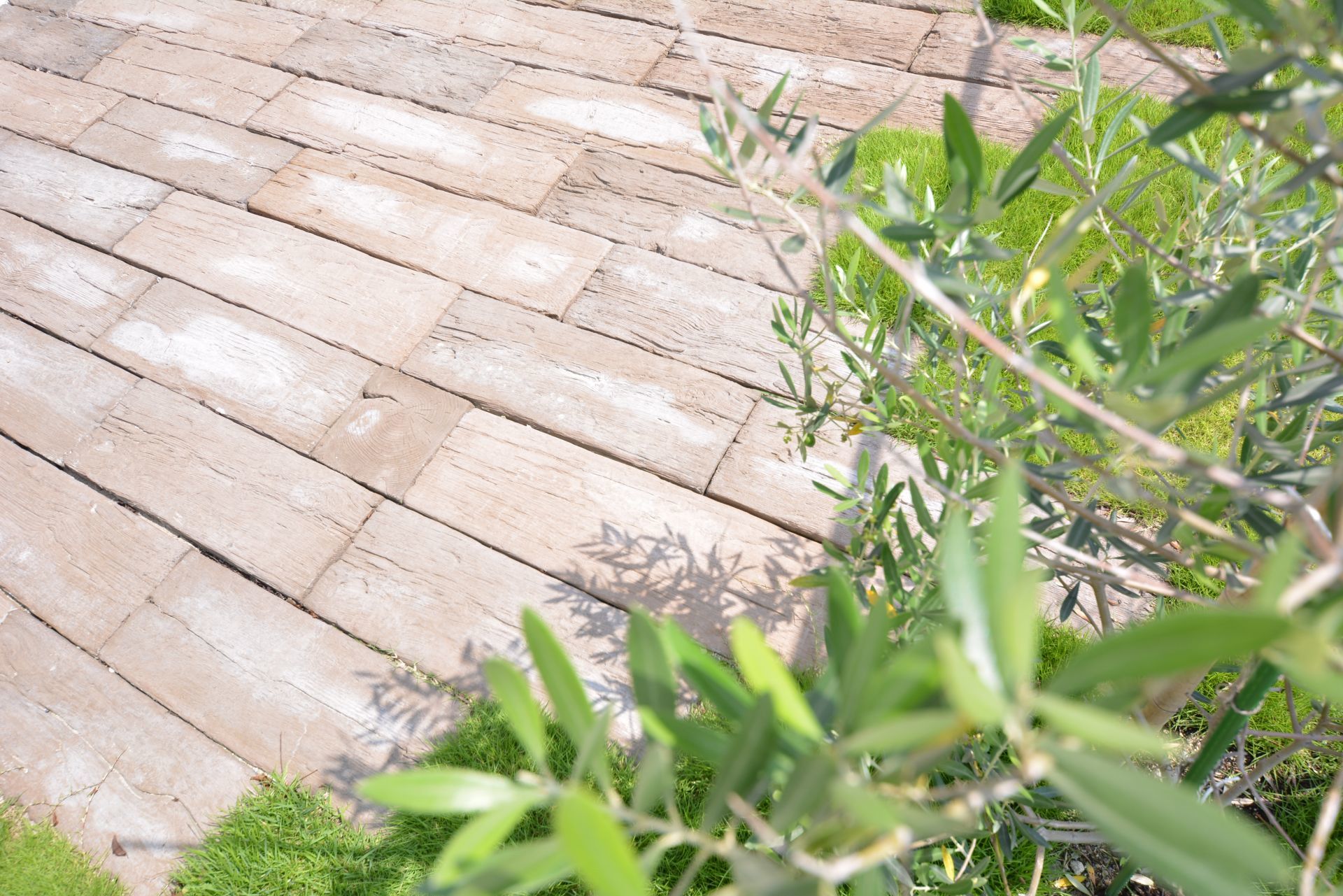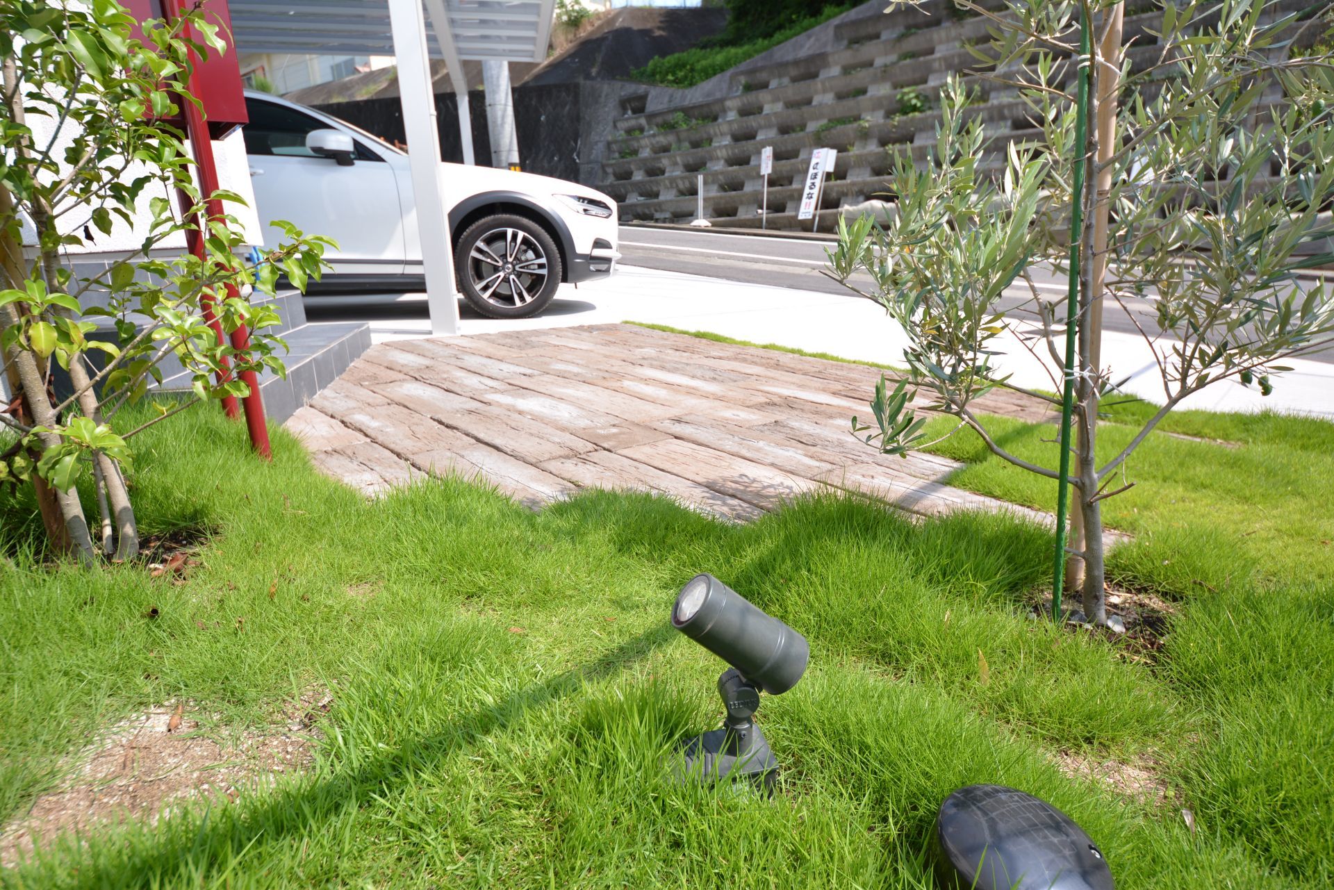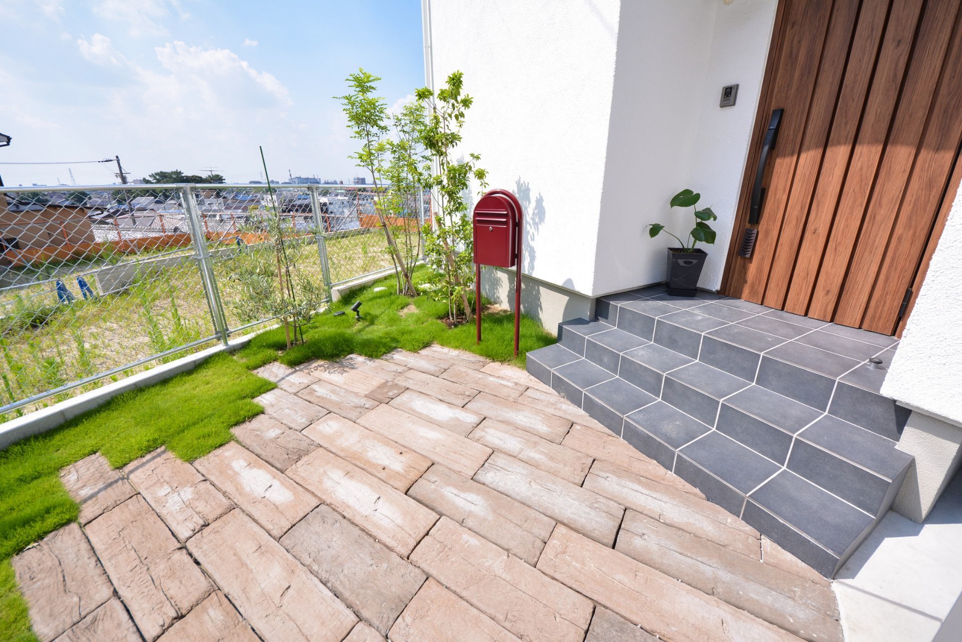 駐車場やアプローチは斜めの土地と同じラインで作成しました。これにより枕木敷きや目地の入れ方に動きが生まれ、シンプルながら遊び心のあるデザインになりました。ゆくゆくは枕木の周りに芝が侵食し、混ざり合うことで、自然なものとして家に馴染んでいくことと思います。