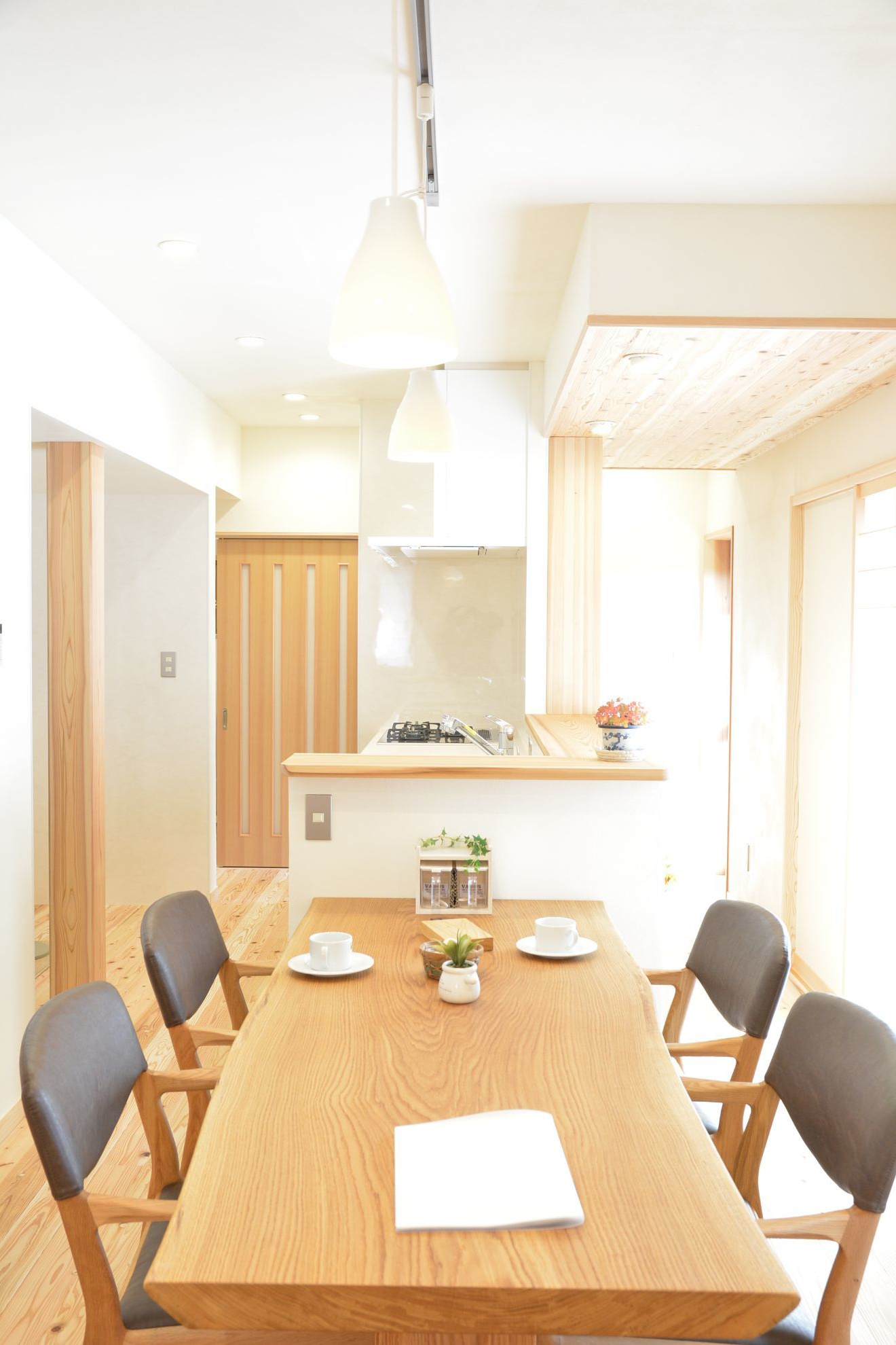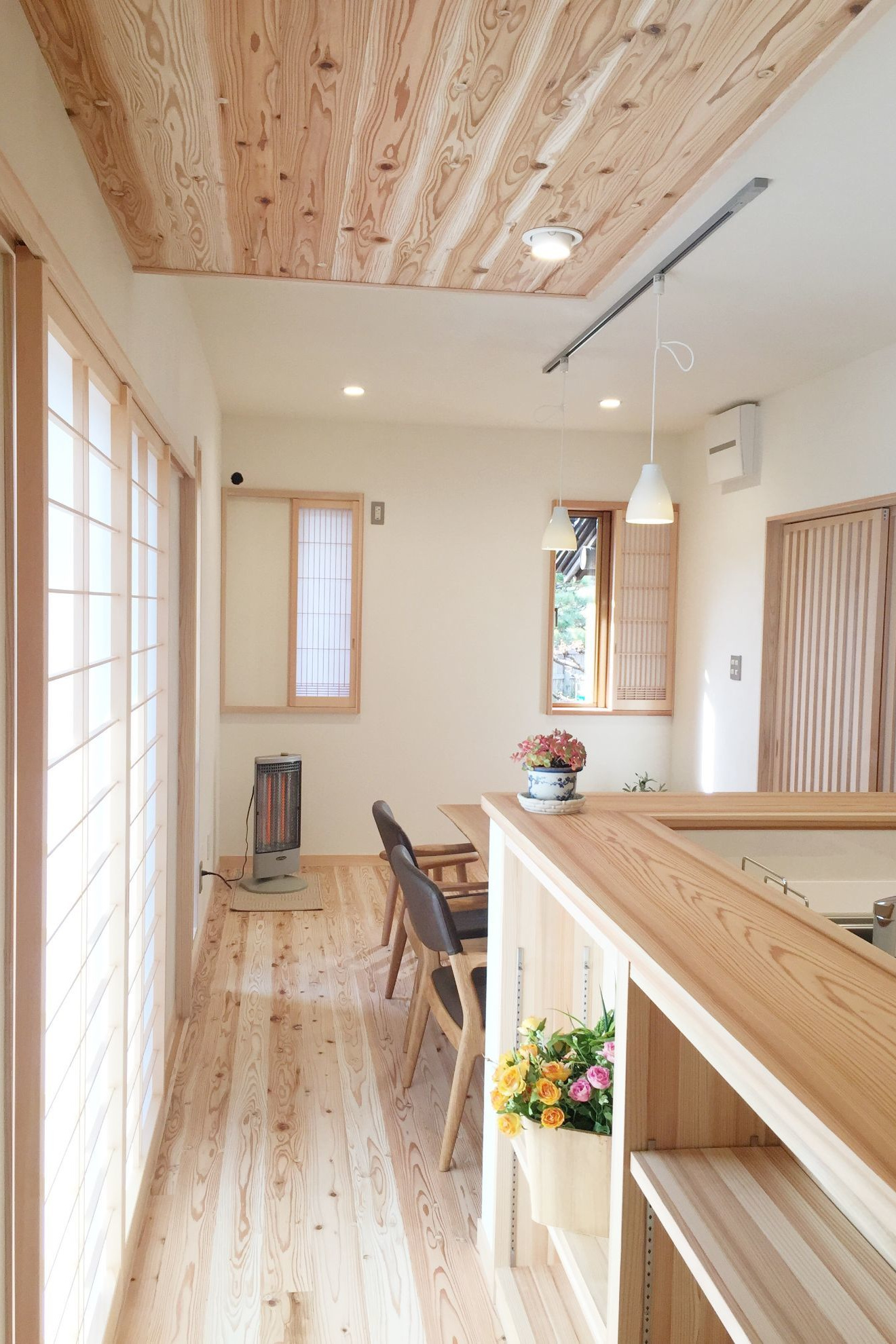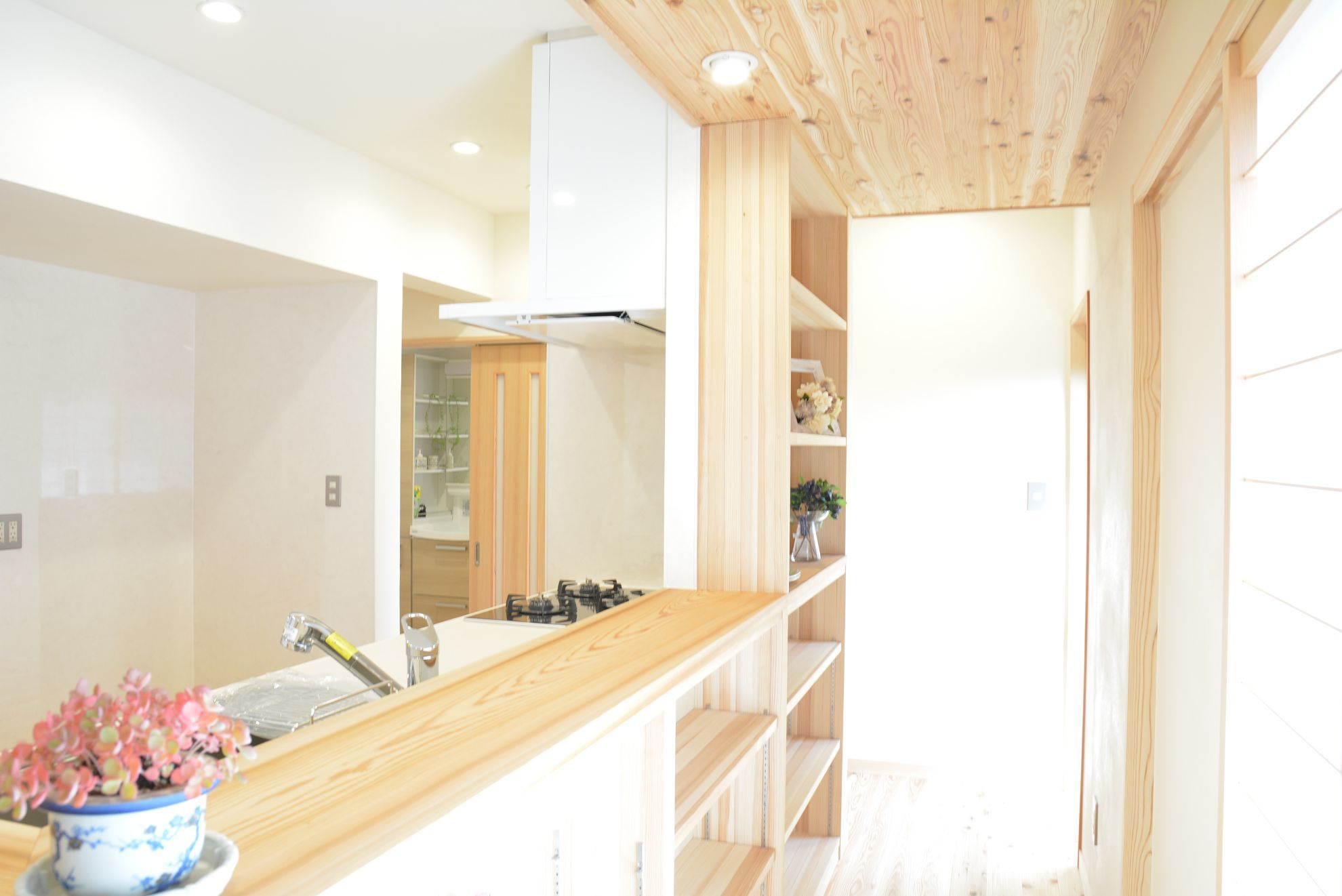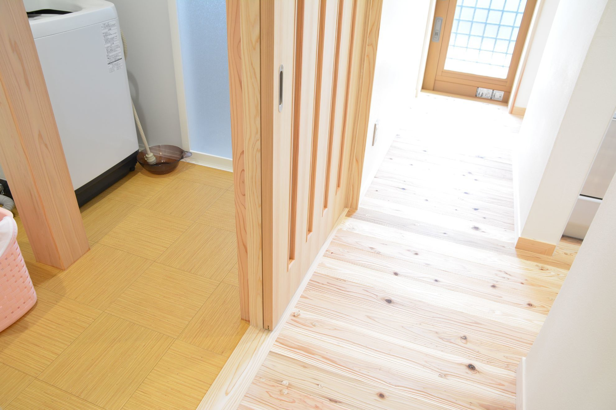 キッチン対面の天井には、床の仕上げにも使用した杉の浮造り材を貼った下がり天井を設けました。床と天井に同じ素材を使用したことで、統一感のある空間に仕上がりました。洗面室やキッチン回りでどうしても取ることができなかった柱には、化粧の薄板を張ることできれいに表面を仕上げました。キッチン、浴室、洗面所の空間に新しくトイレを追加。トイレは杉の腰壁を張り、床材も無垢材で仕上げ、爽やかな空間になりました。