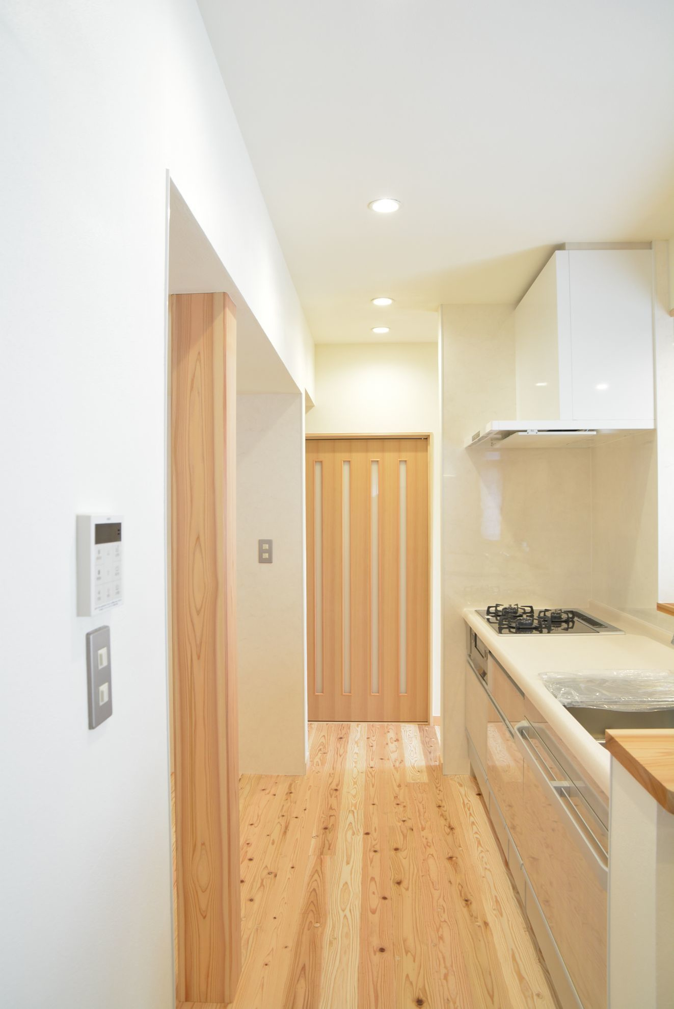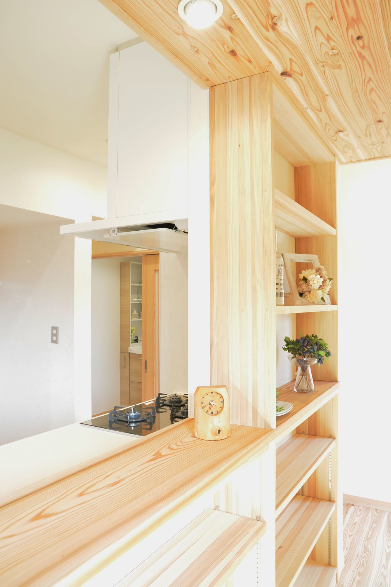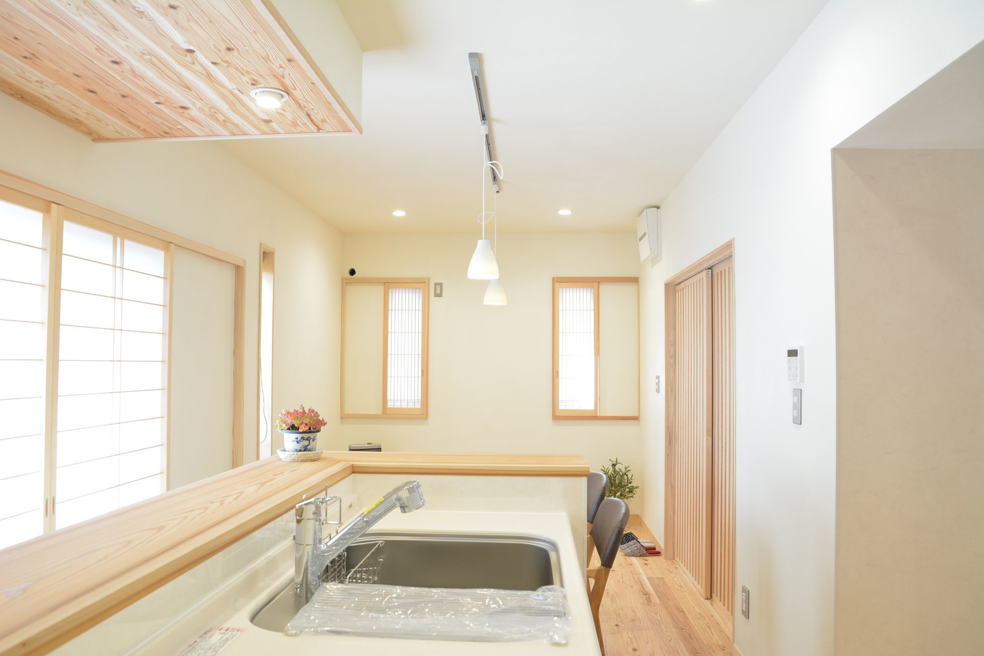 キッチン対面の天井には、床の仕上げにも使用した杉の浮造り材を貼った下がり天井を設けました。床と天井に同じ素材を使用したことで、統一感のある空間に仕上がりました。洗面室やキッチン回りでどうしても取ることができなかった柱には、化粧の薄板を張ることできれいに表面を仕上げました。キッチン、浴室、洗面所の空間に新しくトイレを追加。トイレは杉の腰壁を張り、床材も無垢材で仕上げ、爽やかな空間になりました。