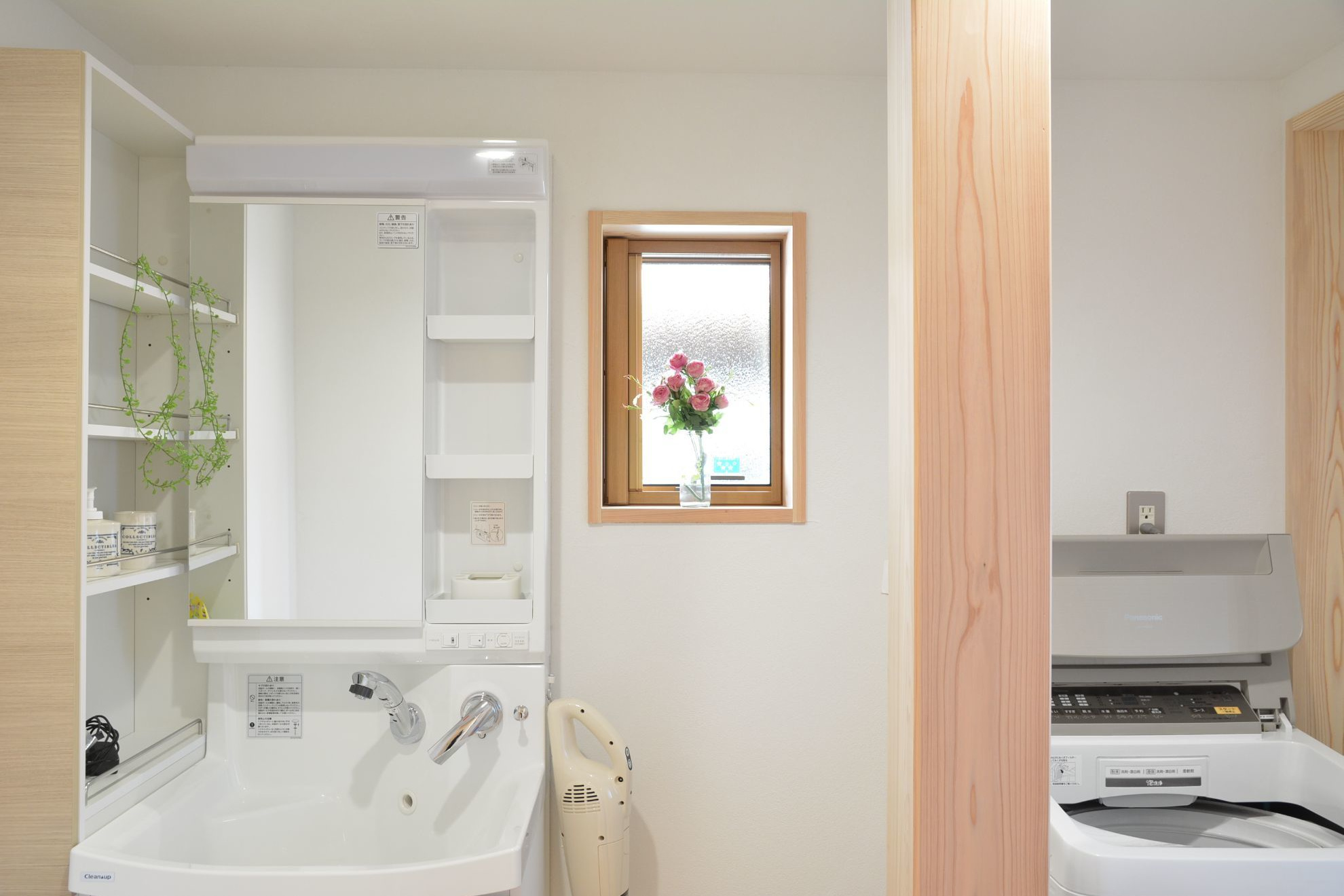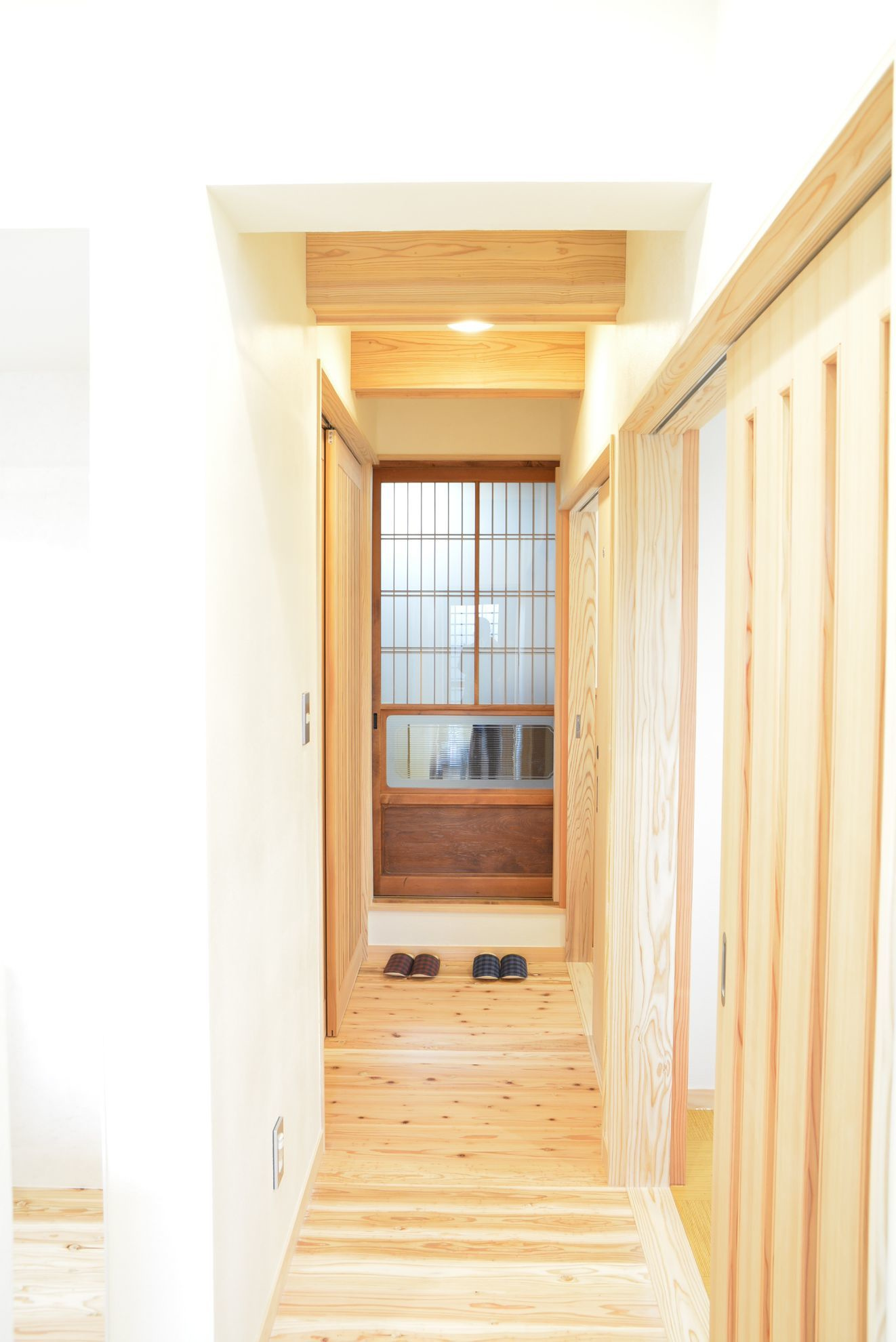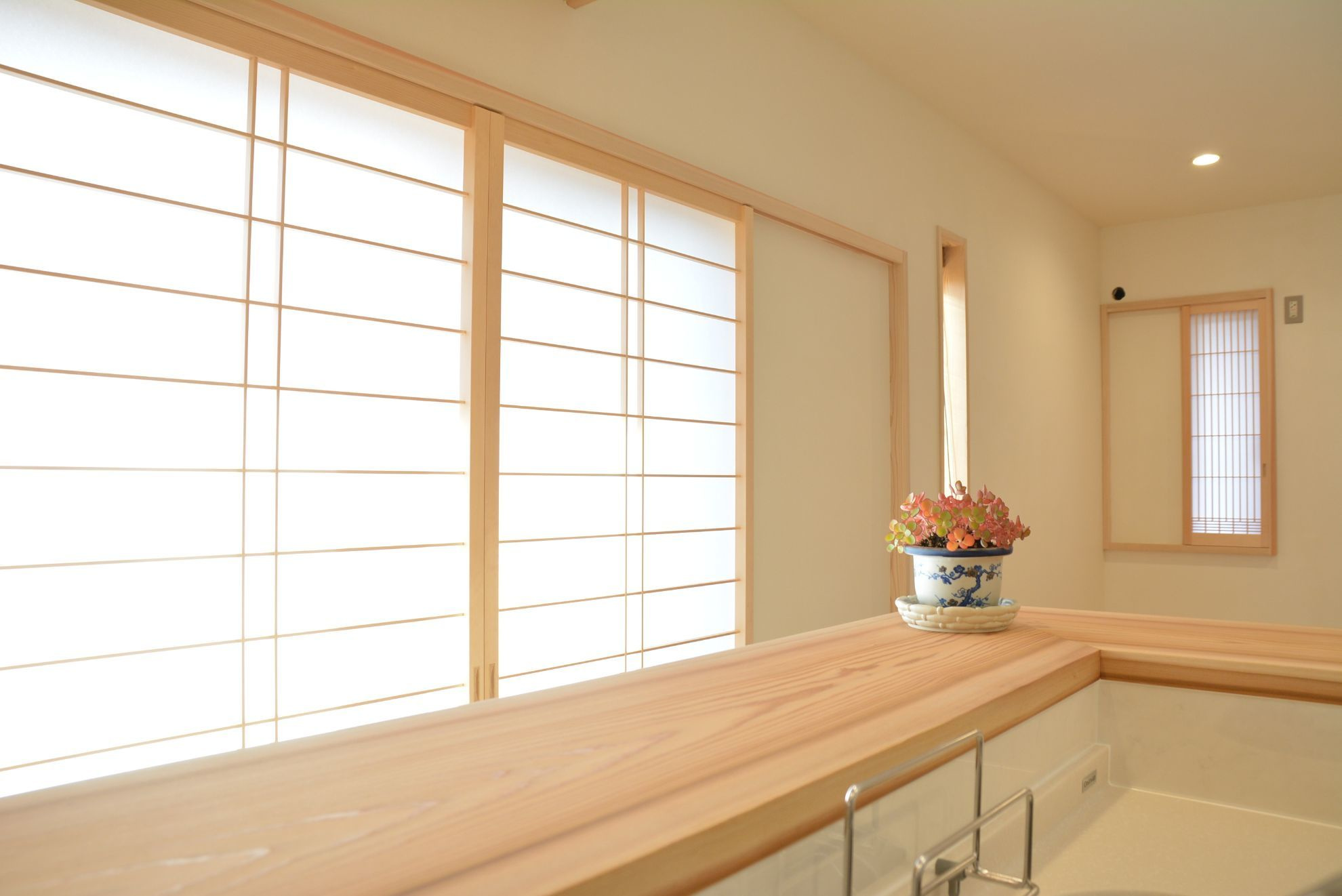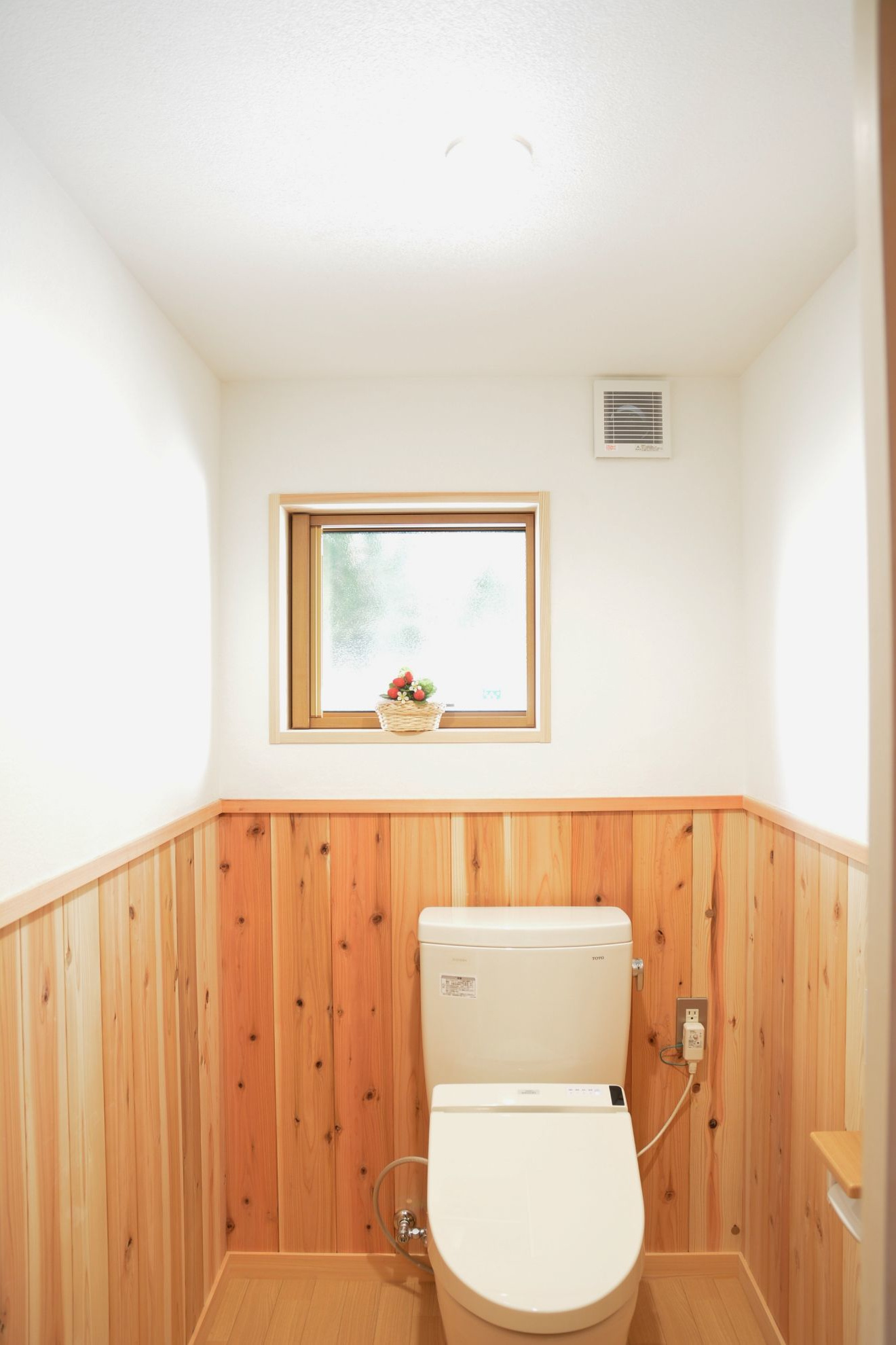 キッチン対面の天井には、床の仕上げにも使用した杉の浮造り材を貼った下がり天井を設けました。床と天井に同じ素材を使用したことで、統一感のある空間に仕上がりました。洗面室やキッチン回りでどうしても取ることができなかった柱には、化粧の薄板を張ることできれいに表面を仕上げました。キッチン、浴室、洗面所の空間に新しくトイレを追加。トイレは杉の腰壁を張り、床材も無垢材で仕上げ、爽やかな空間になりました。