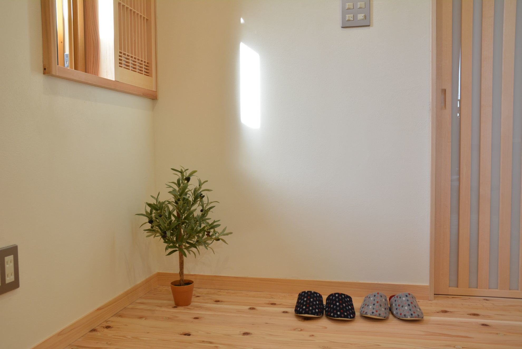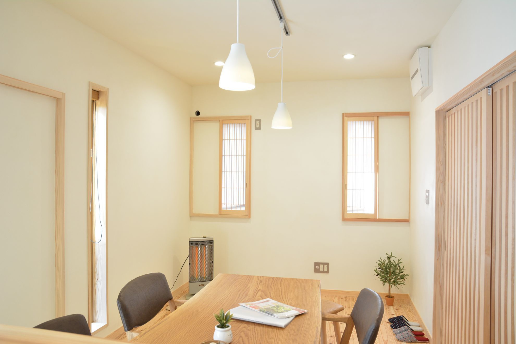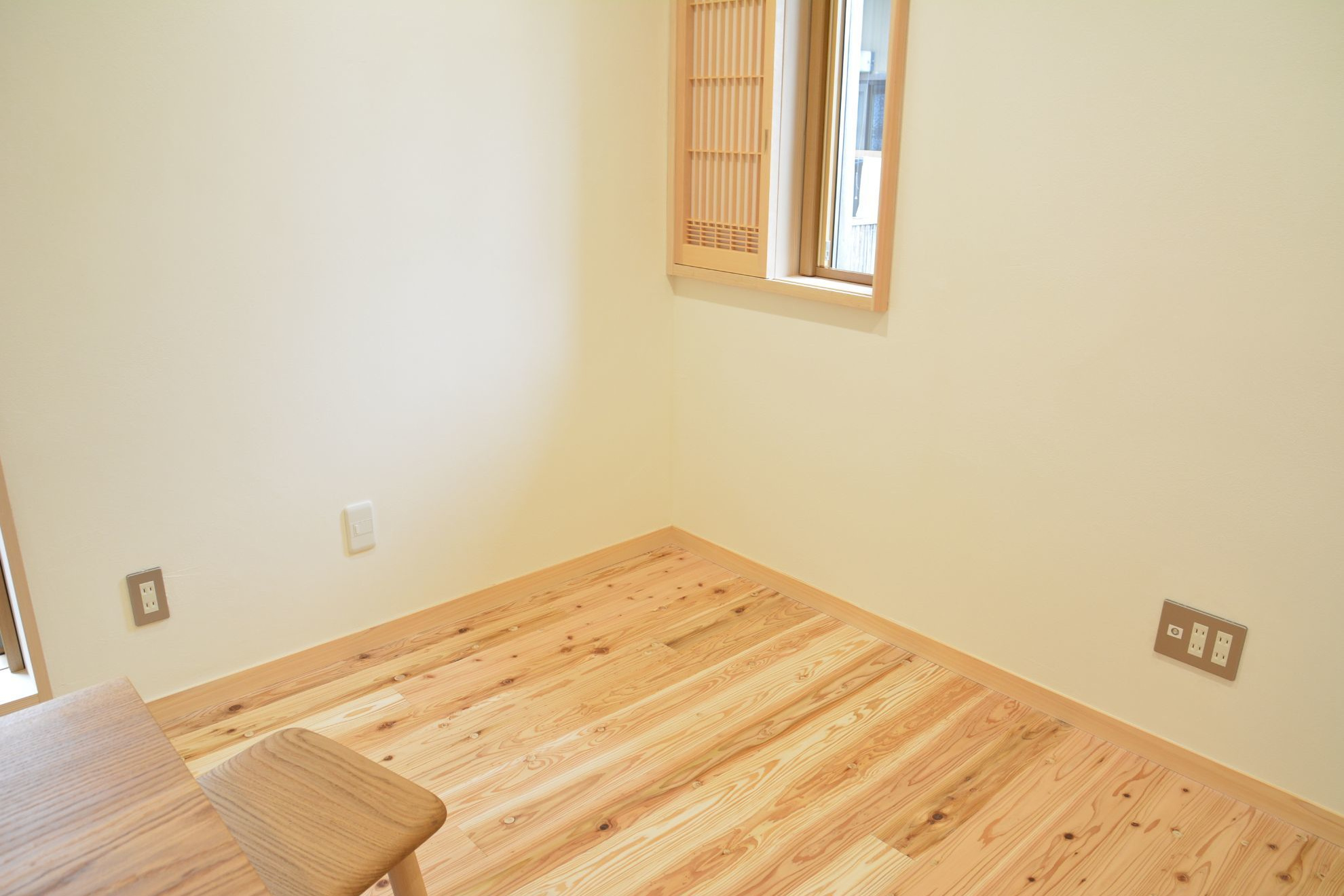 仕上げが自然素材であることや、断熱材及び気密性能にこだわってリノベーションしました。仕上げの床材は触り心地良く加工された杉の浮造り材を、壁・天井に調湿効果と健康改善効果のある珪藻土を使用しました。天然木や珪藻土を使用することで、室内の湿度を調整でき、夏は涼しく、冬は暖かい部屋になりました。