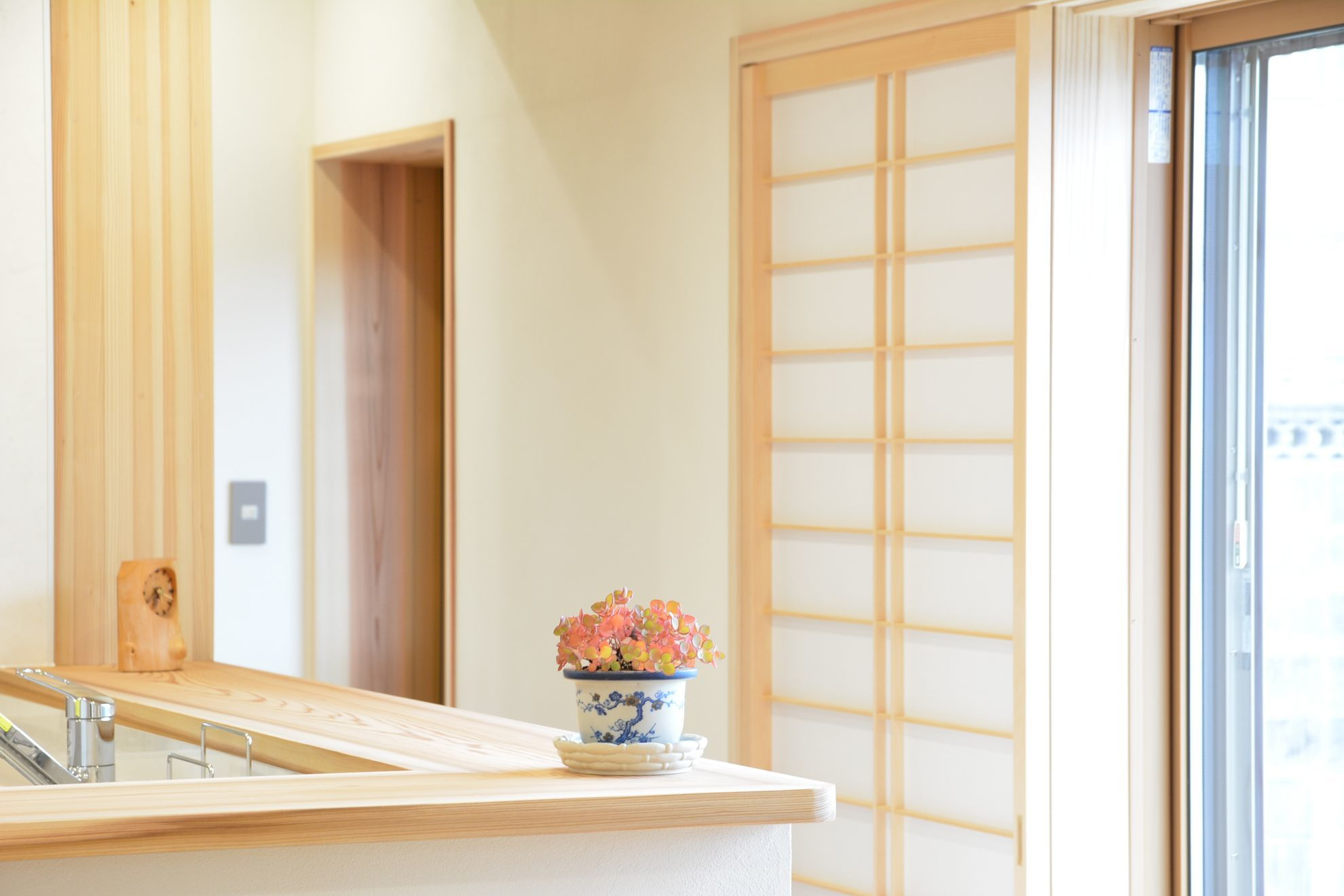 特長:浮造り杉床材、珪藻土、杉腰壁、無垢建具、