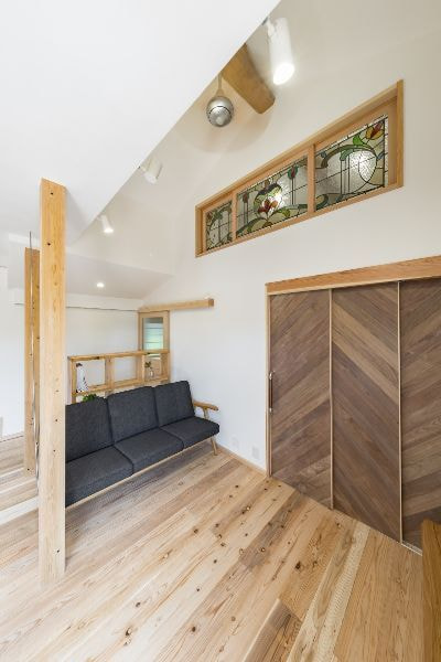 特徴:バリアフリー、床杉材、漆喰、古梁、イタウバデッキ、ステンドグラス、ロフト