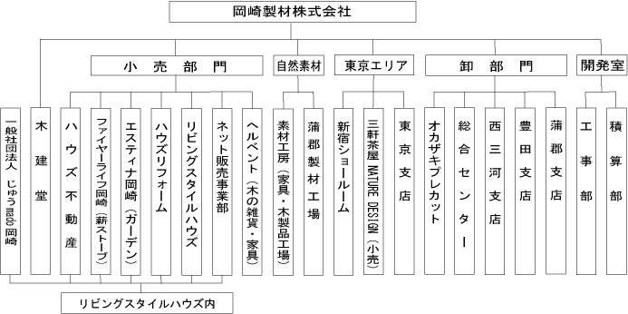 沿革 | 1917年(大正6年)創業 1946年(昭和21年2月)岡崎製材株式会社設立 1968年(昭和43年)豊田支店新設 1980年(昭和55年10月)蒲郡支店新設 1983年(昭和58年6月)「リビングセンターハンズ」オープン 1989年(昭和62年12月)有限会社たくみ産業設立 1992年(平成4年)岡崎総合センター新設 1997年(平成9年4月)岡崎プレカット事業部設立 2001年(平成13年10月)岡崎総合センター、たくみ産業を業務統合 輸入部を独立、銘木部を自然素材部に改組 2003年(平成14年12月)西三河支店新設 2003年(平成15年10月)大陸工房を新設 2004年(平成16年2月)リビングセンターハンズをリビングスタイルハウズへ名称変更 2005年(平成17年)大陸工房、中国上海にギャラリー「空」オープン 2005年(平成17年10月) 輸入部、外商部、大陸工房、HELL-BENTを本社営業部に統合 2005年(平成17年11月)オカザキプレカットにてISO9001の認証取得 2008年(平成20年3月)ネイチャーデザイン新宿ショールーム オープン 2009年(平成21年10月)東京支店 三軒茶屋ショールーム オープン 2011年(平成23年1月)プロ専用現金問屋「木建堂」オープン 2011年(平成23年9月)豊田支店移転オープン 2012年(平成24年9月)ファイヤーライフ岡崎(リビングスタイルハウズ内)オープン 2013年(平成25年1月)ハウスドゥ蒲郡店オープン |