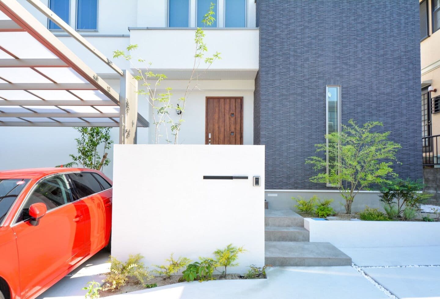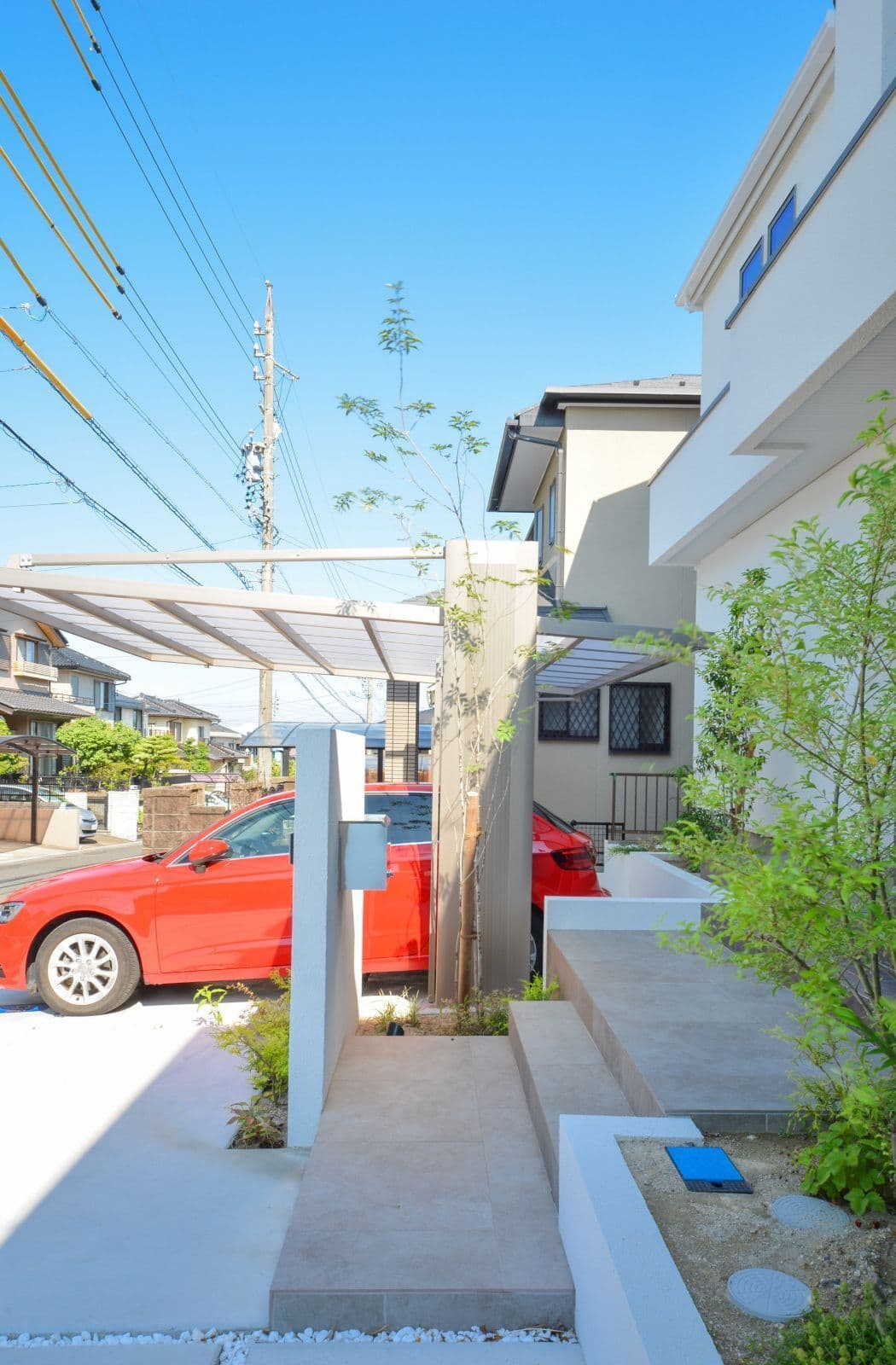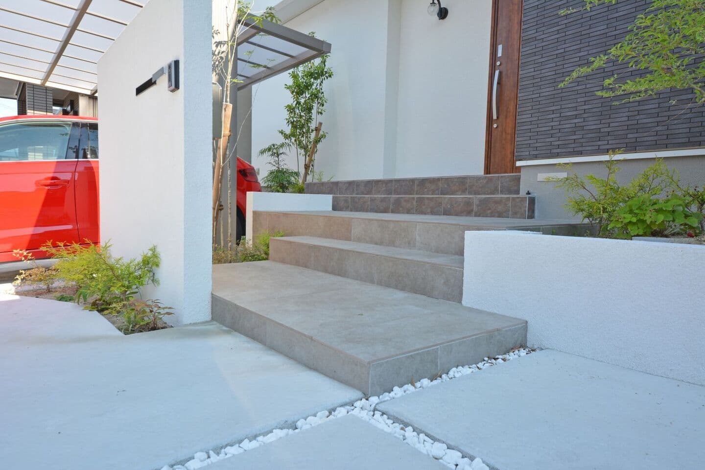 建物は白色がメインのため、それに合わせて白を基調としポイントでグレーのタイルや緑を使い、シンプルな外構をご提案しました。
