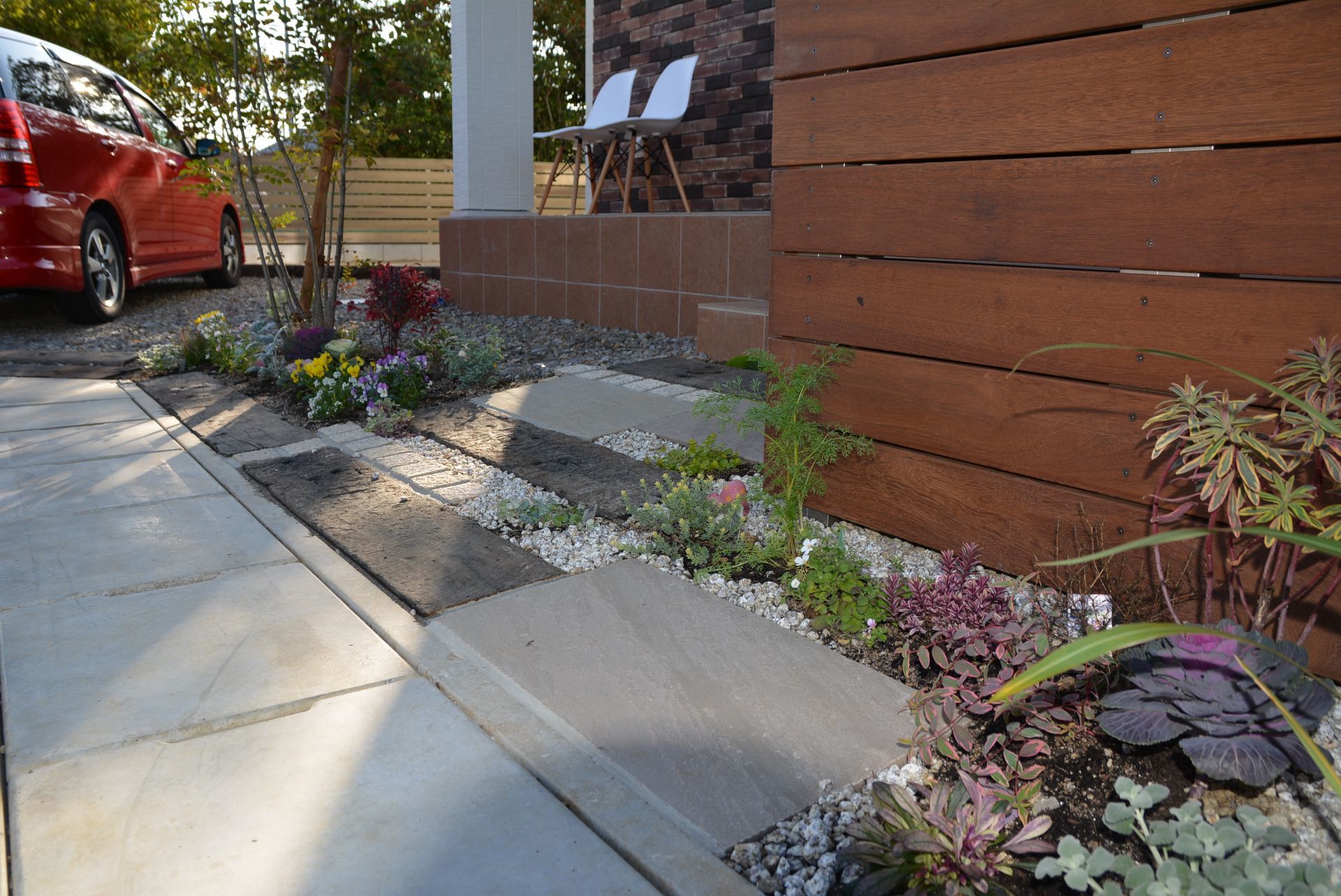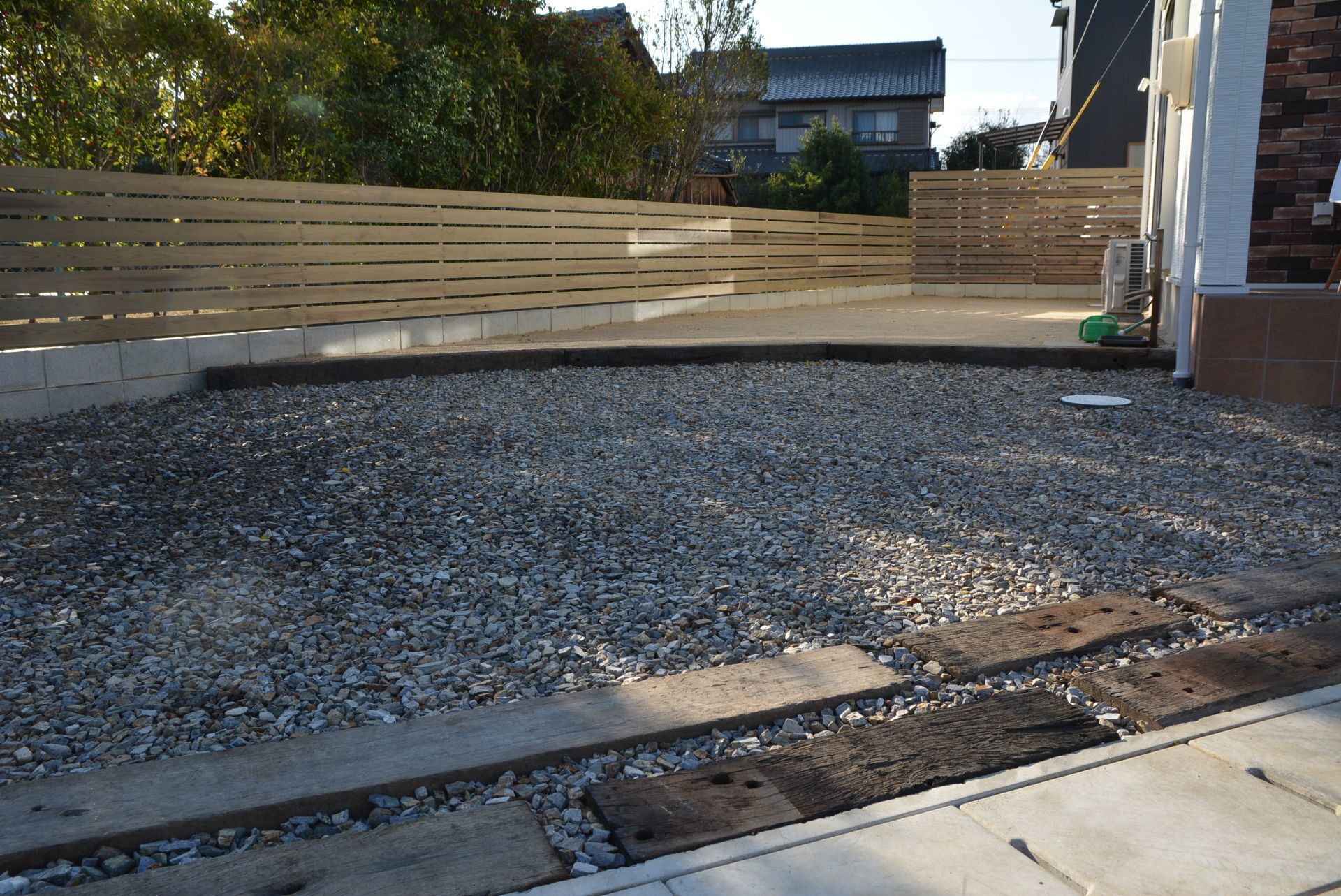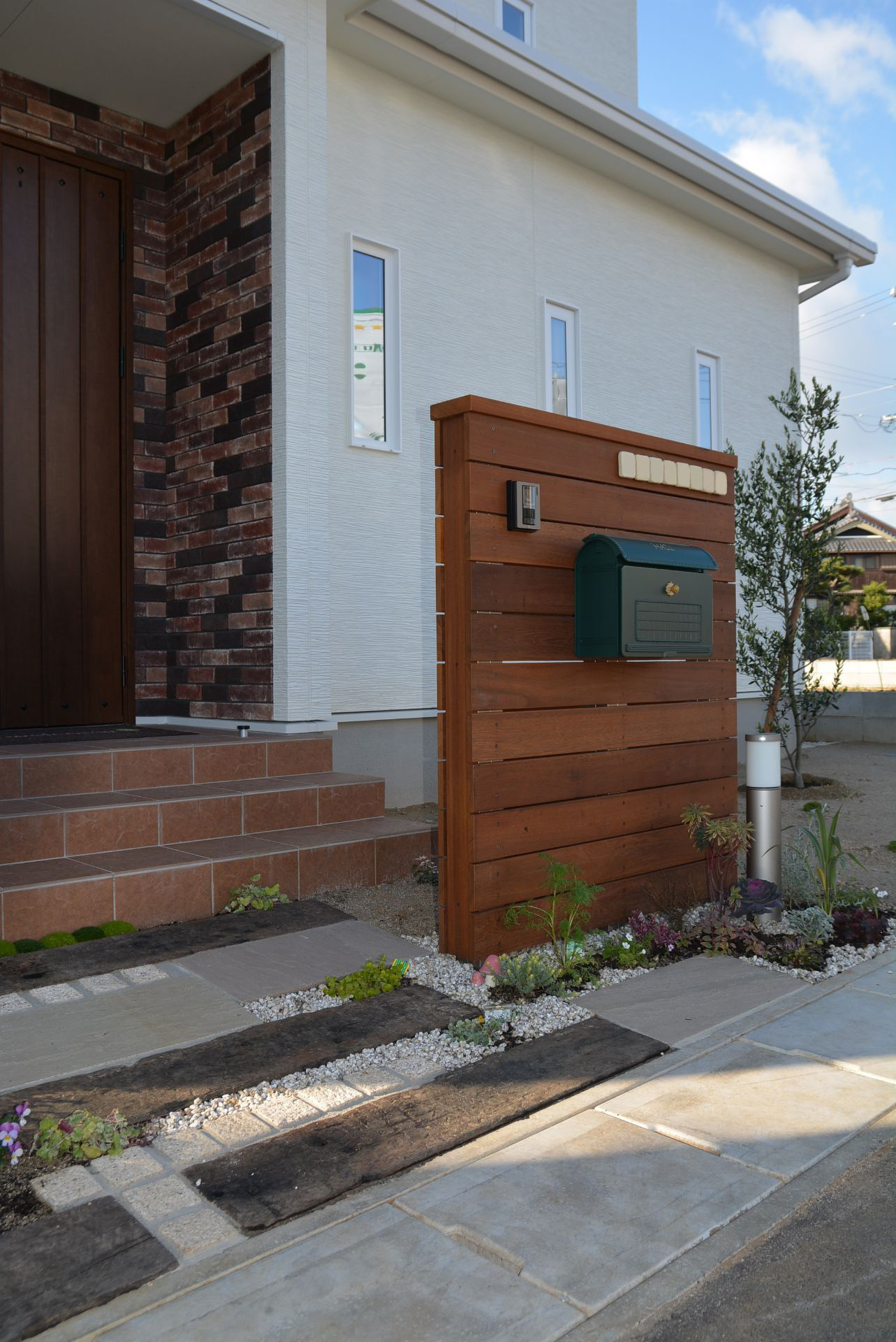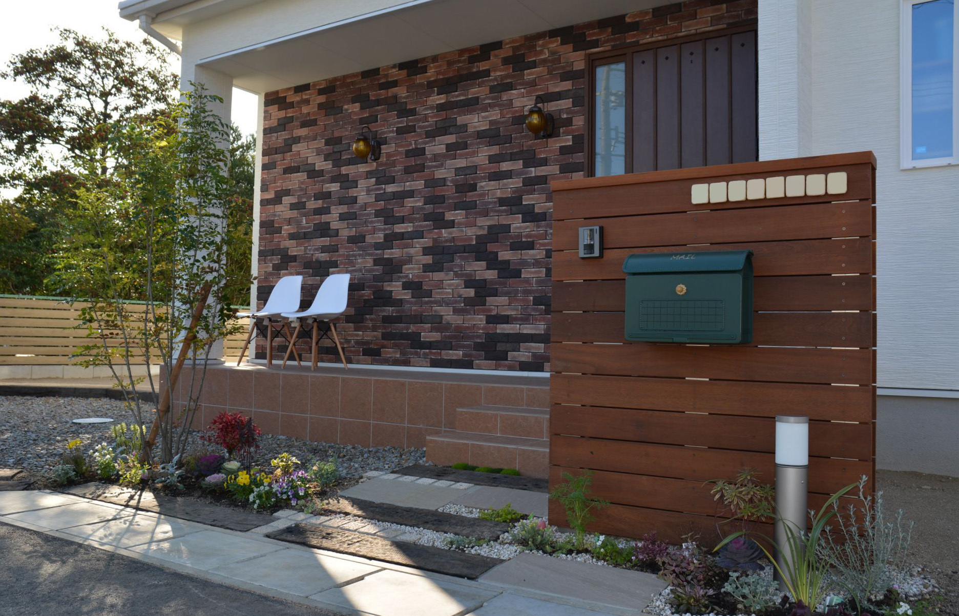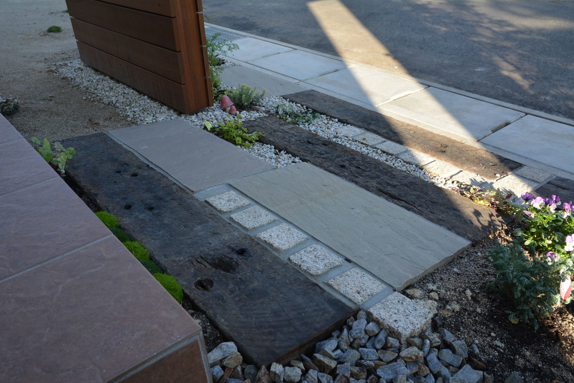 新築したご自宅の四角い外観やタイル壁がおしゃれで、外構についてもこだわりをお持ちだったお客様。耐久性のあるウリン材でできた門柱や天然のヴィンテージの枕木と2種類の石材、国産杉材の目隠しフェンス等、自然素材をあちらこちらに散りばめた、理想のお庭が実現しました。