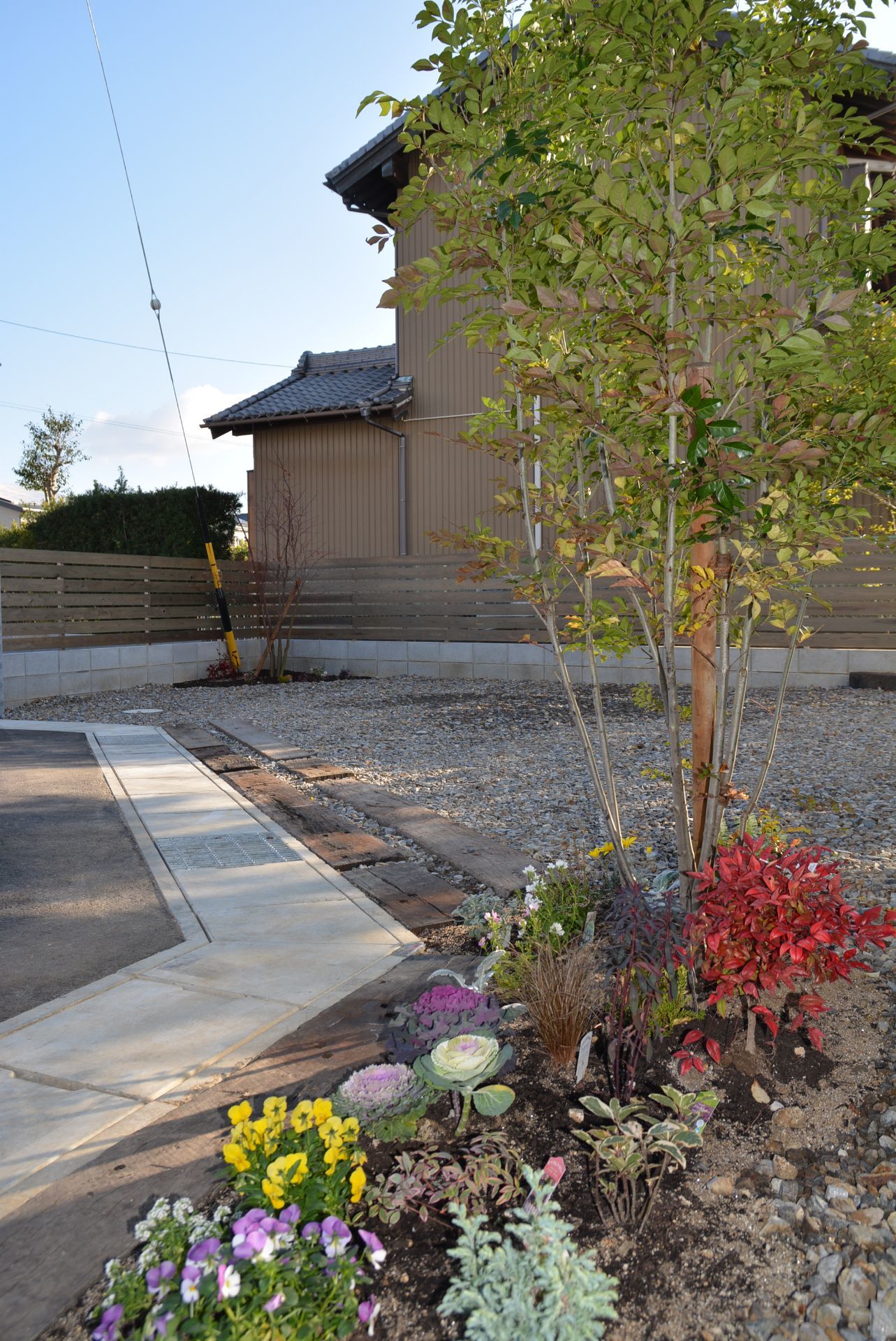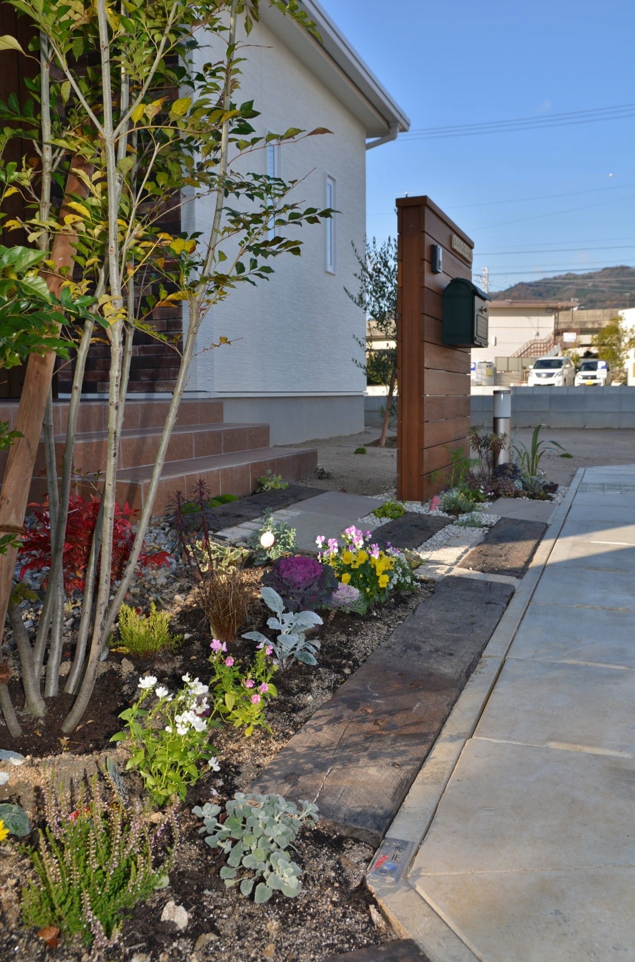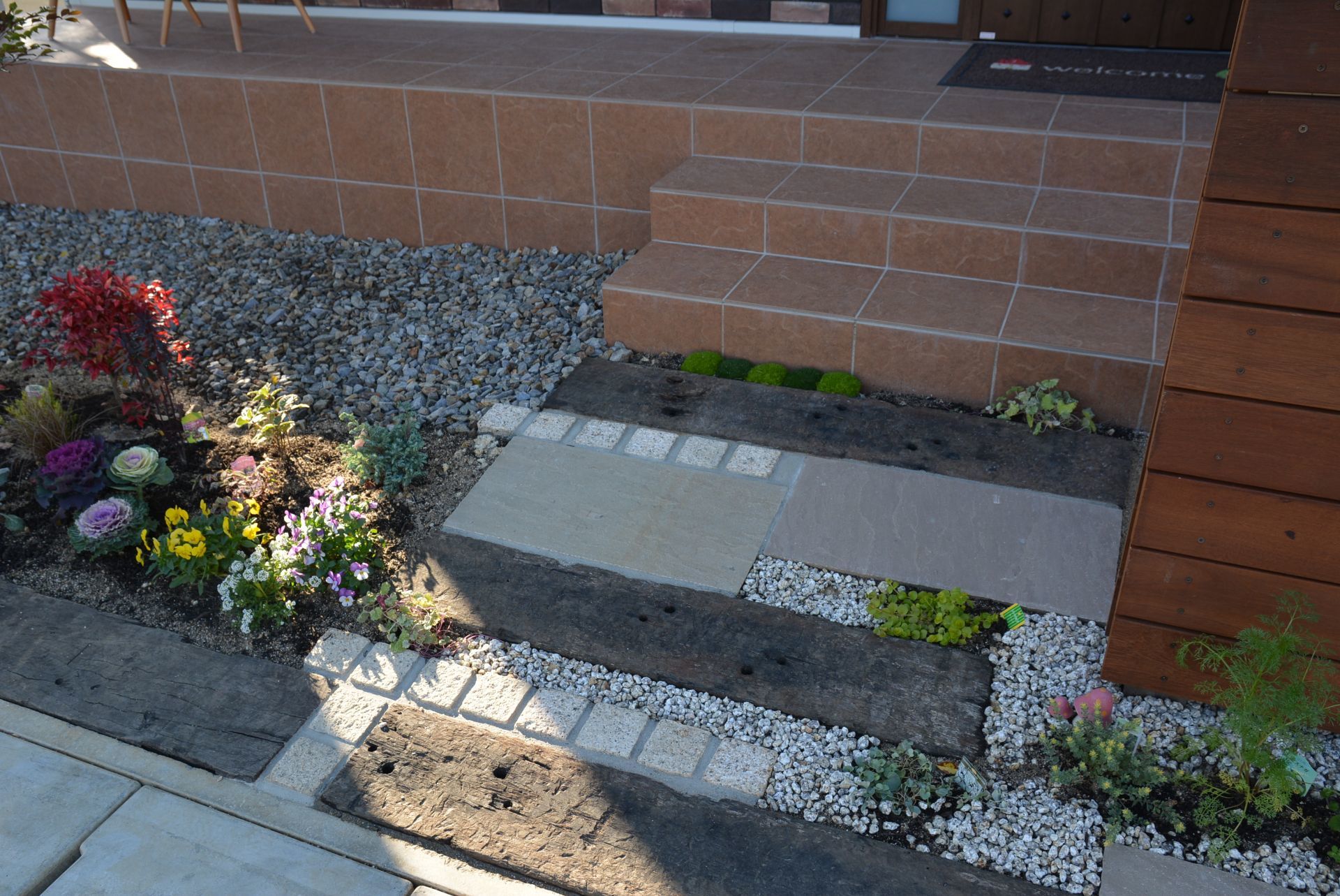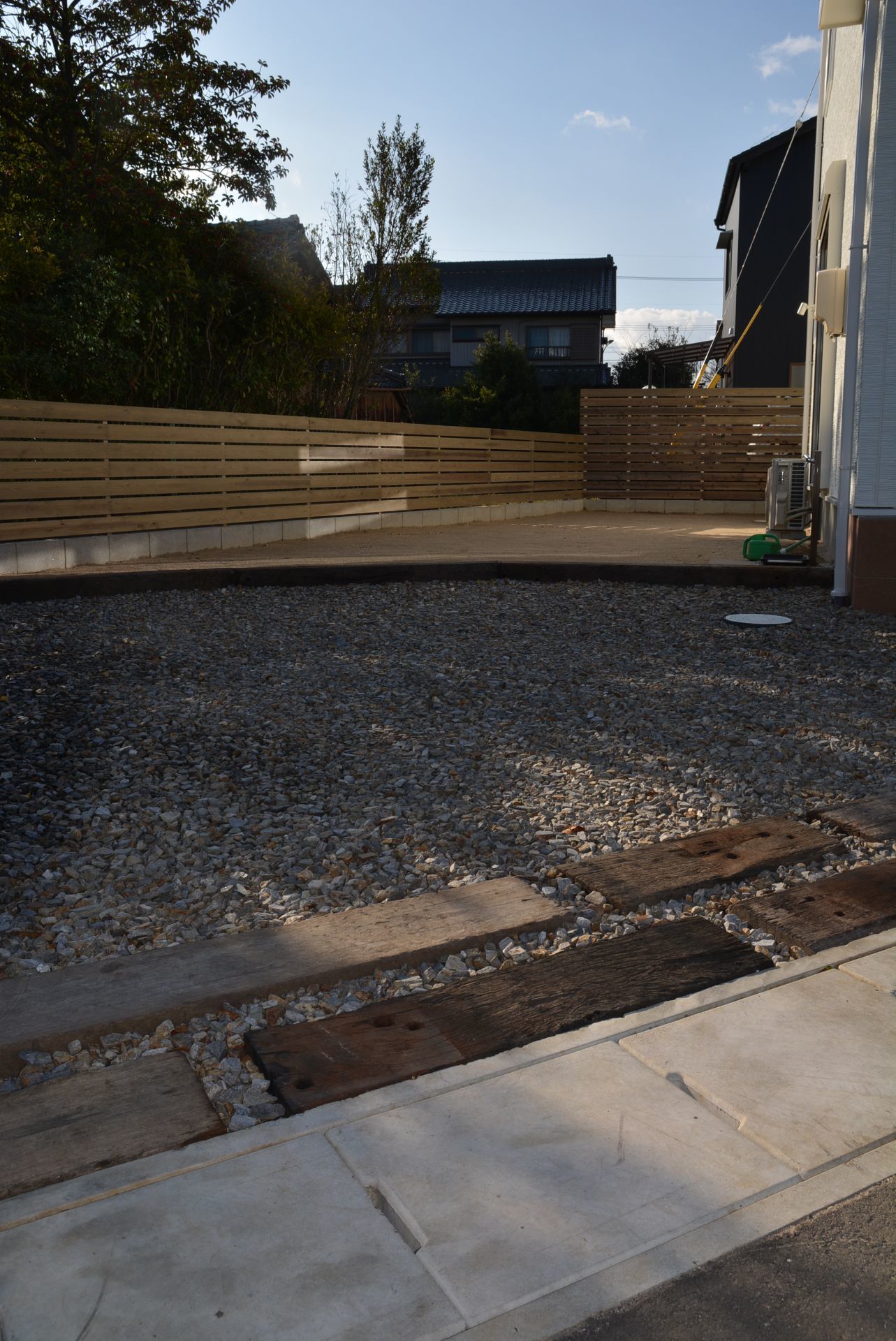新築したご自宅の四角い外観やタイル壁がおしゃれで、外構についてもこだわりをお持ちだったお客様。耐久性のあるウリン材でできた門柱や天然のヴィンテージの枕木と2種類の石材、国産杉材の目隠しフェンス等、自然素材をあちらこちらに散りばめた、理想のお庭が実現しました。