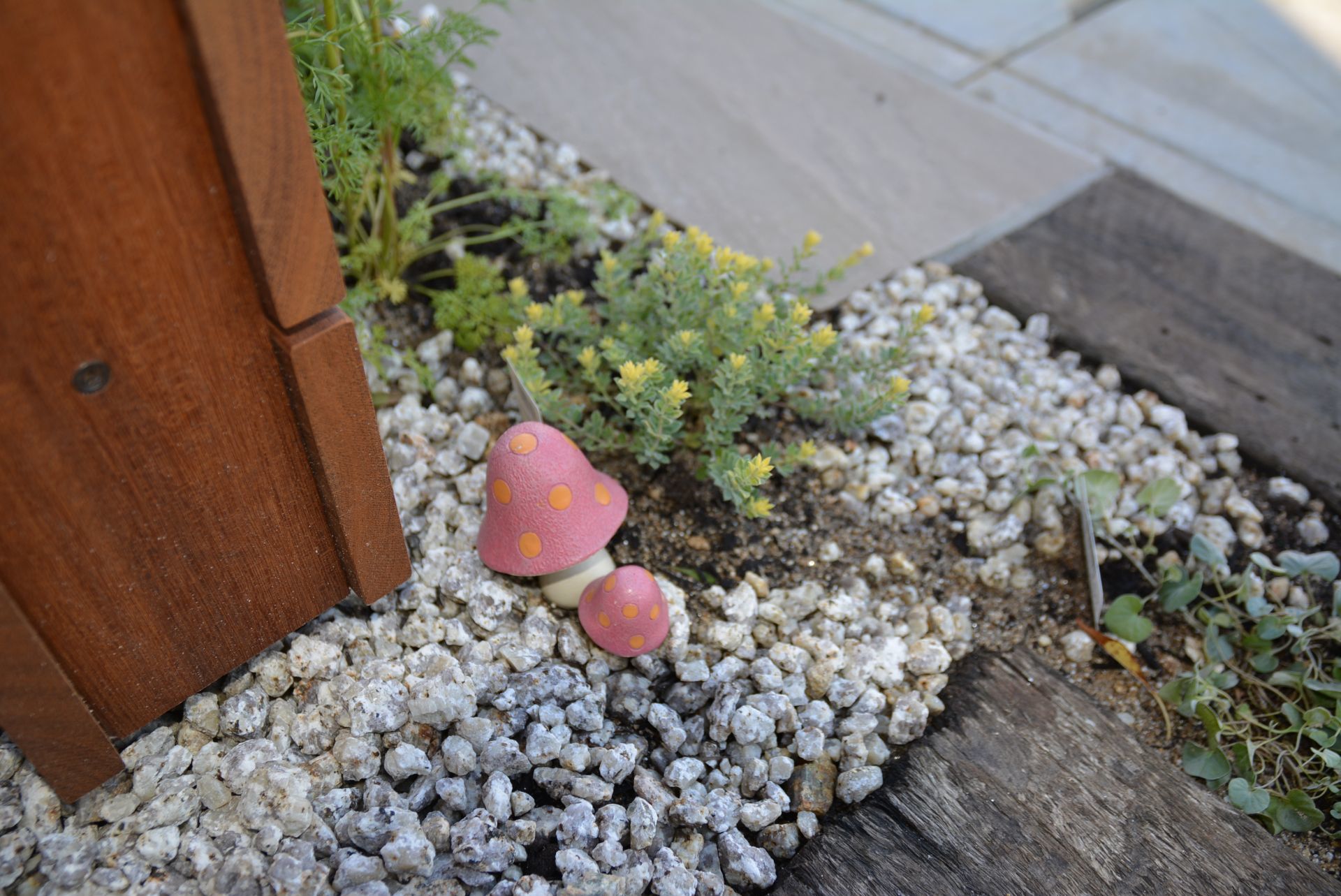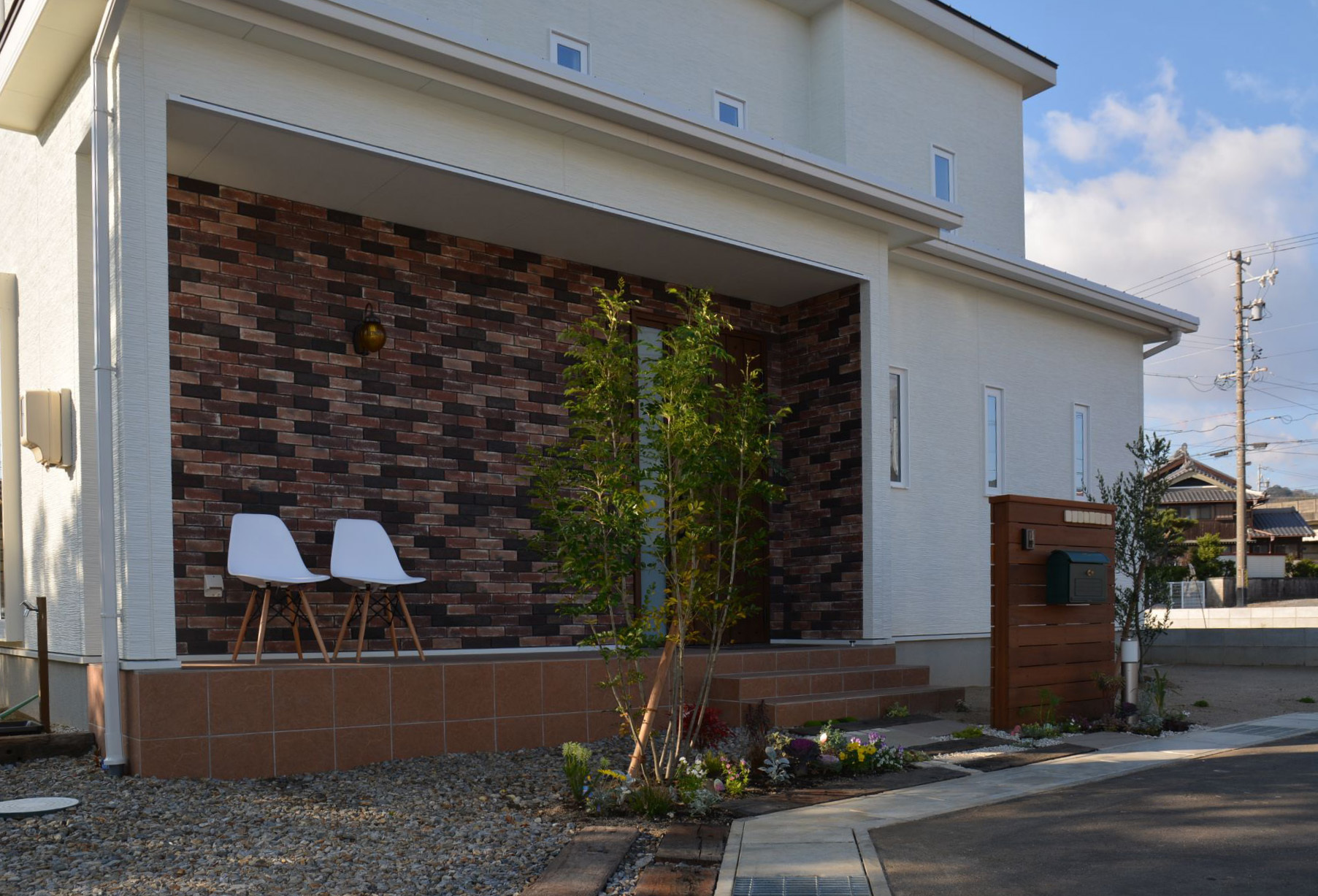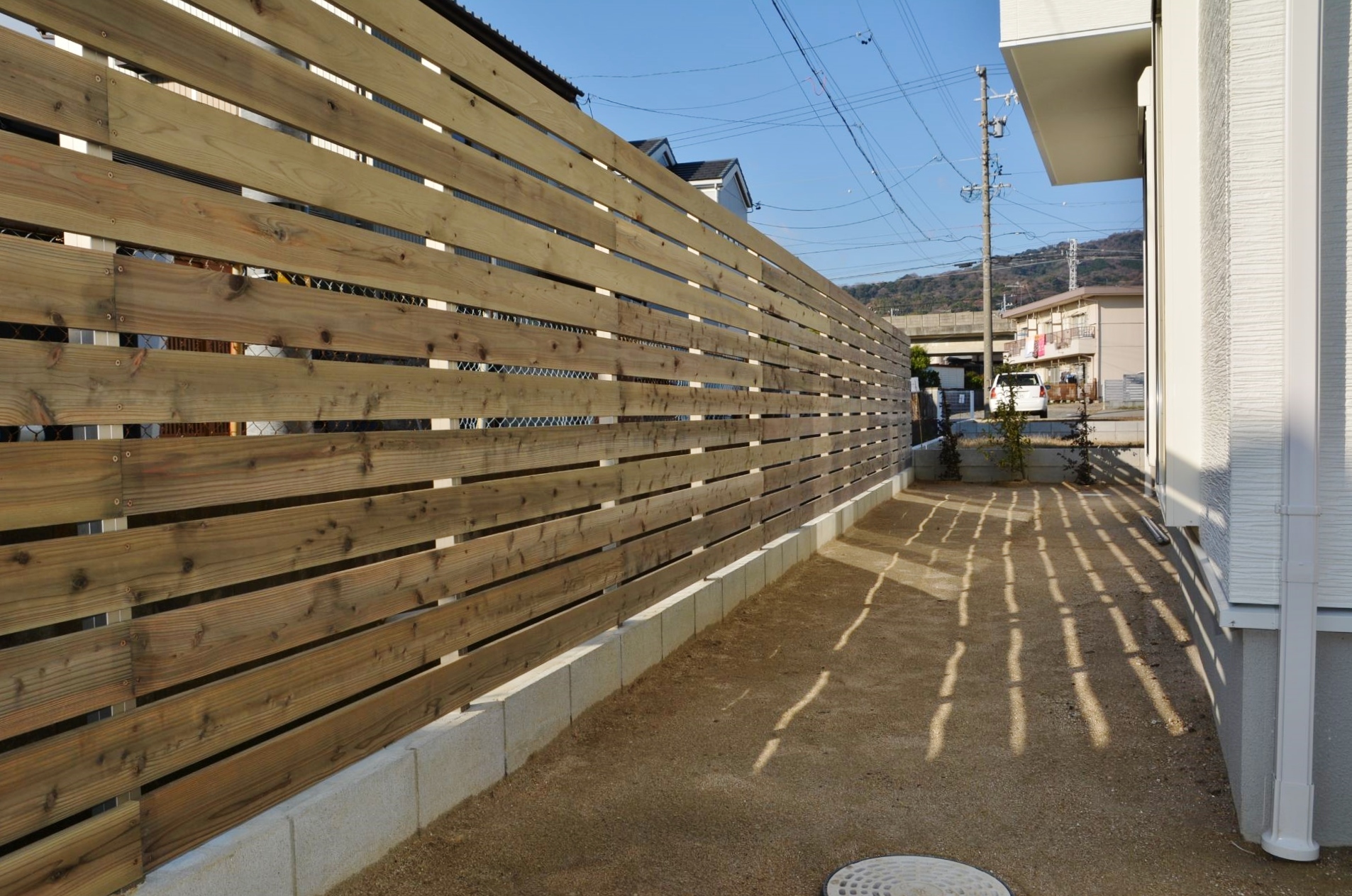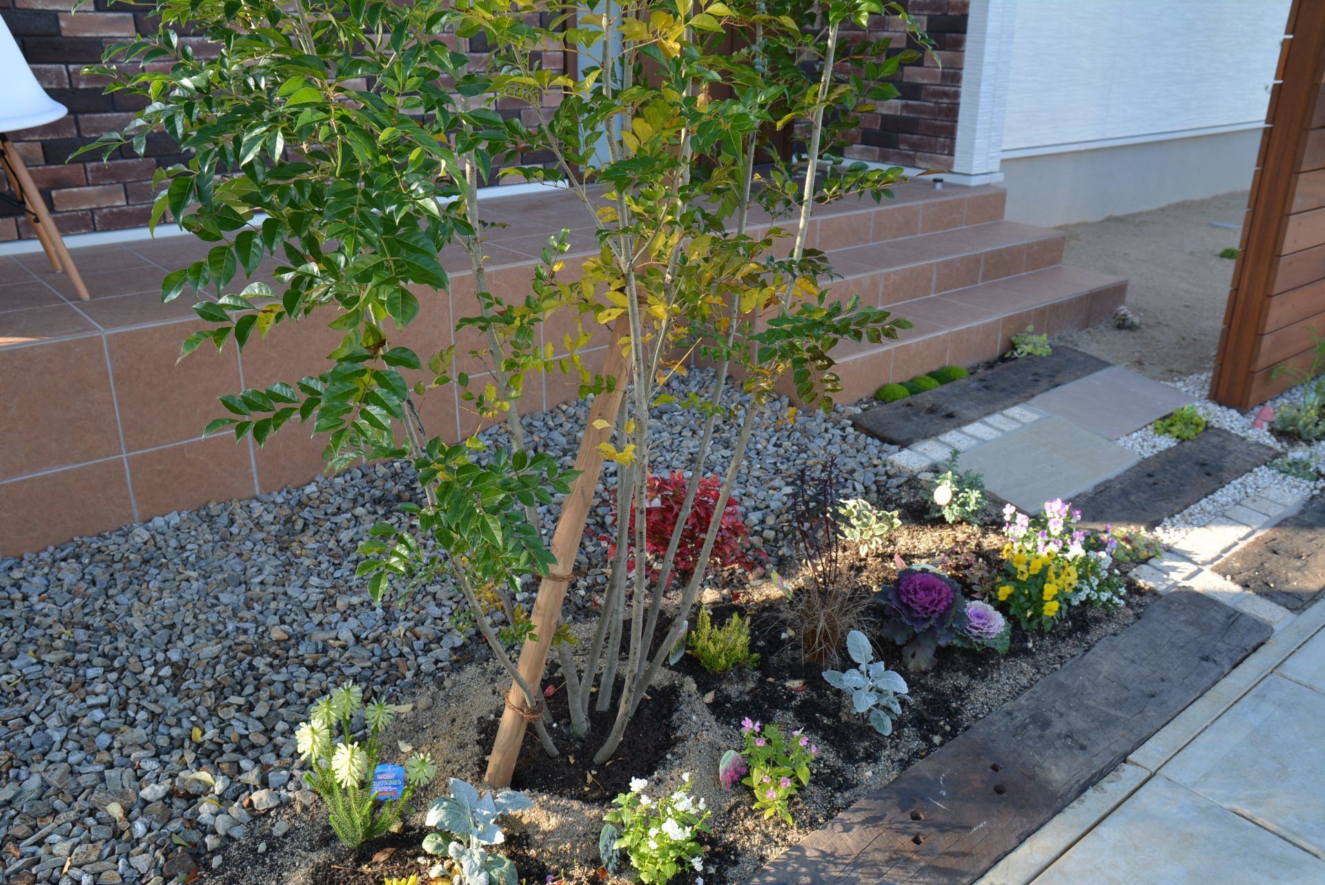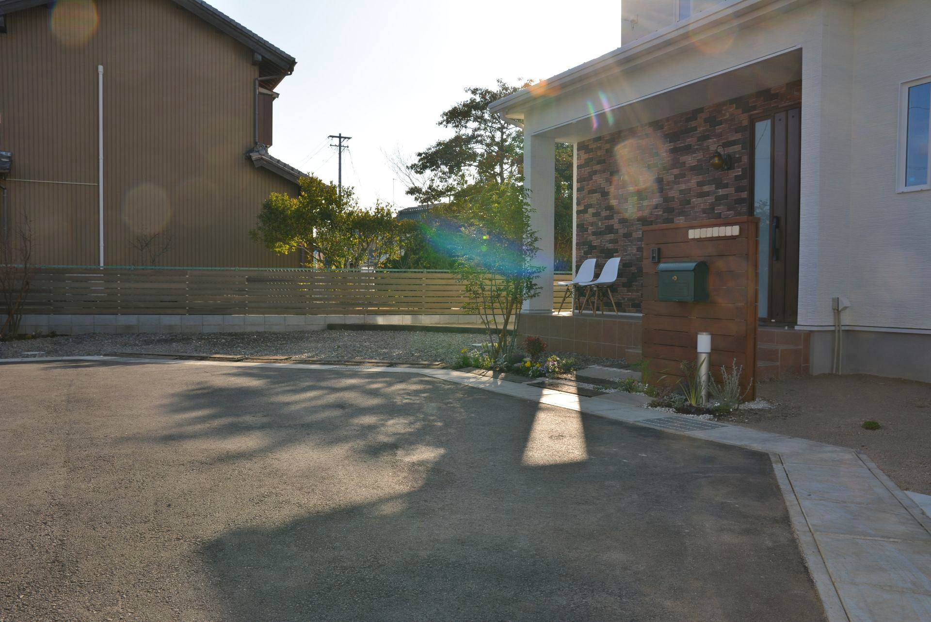 新築したご自宅の四角い外観やタイル壁がおしゃれで、外構についてもこだわりをお持ちだったお客様。耐久性のあるウリン材でできた門柱や天然のヴィンテージの枕木と2種類の石材、国産杉材の目隠しフェンス等、自然素材をあちらこちらに散りばめた、理想のお庭が実現しました。