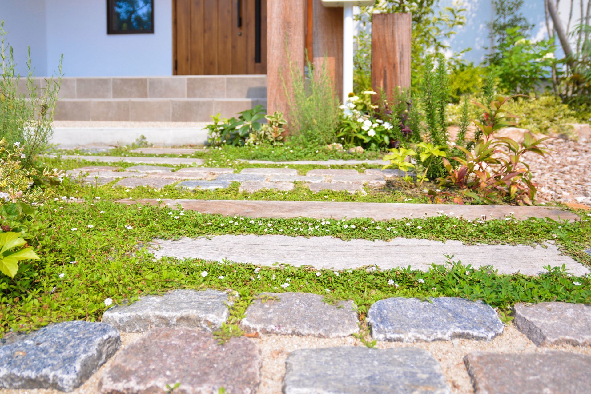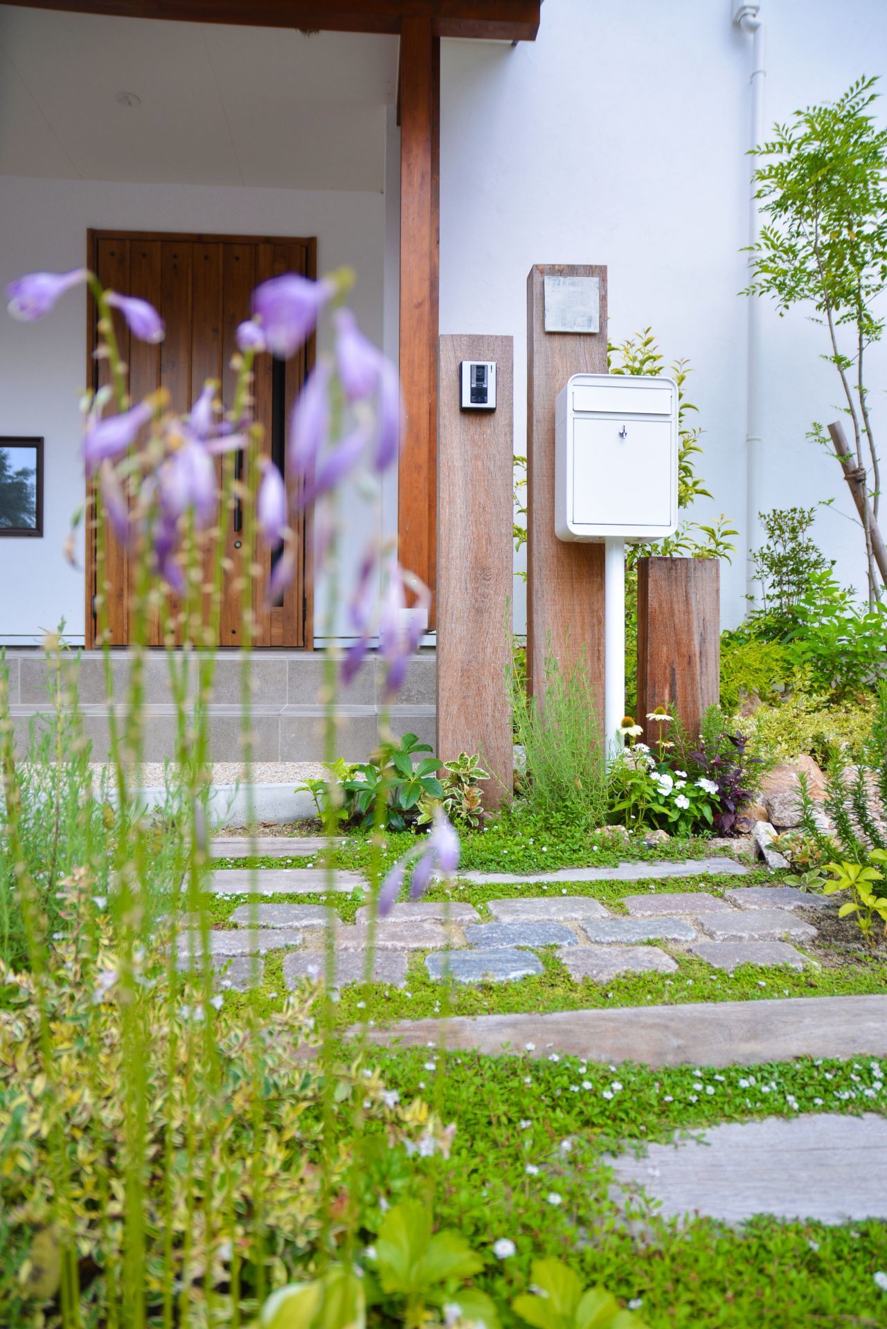 自然な感じのお庭がお好みのお客様。「できるだけ自然な感じにしたい!少し手間がかかってしまっても、草木を植えて、お手入れをする新しい生活を楽しみたい!」というご要望をいただきました。広い敷地の中で、一番のこだわりは、お家の顔であるファサード部分。緑の中を歩くような、心地よいアプローチをつくりました。アンティークの石材や枕木といった天然素材を使用し、周りにはグランドカバーの草花を入れ込むことで、より自然な雰囲気を演出しています。タイルの玄関ポーチの周りには、洗い出しのステップを設けており、スッキリした印象のタイルポーチと、やわらかい印象のアプローチをつなぐ、ワンクッションにもなるように計画しました。植栽スペースの周りには、やさしい色味の甲賀石を配置しています。駐車スペースは、あえて砕石敷きにして、自然な感じに。だんだんと元気に育ってくれる植物たちが、ますますこのお家のファサードを彩ってくれるでしょう。