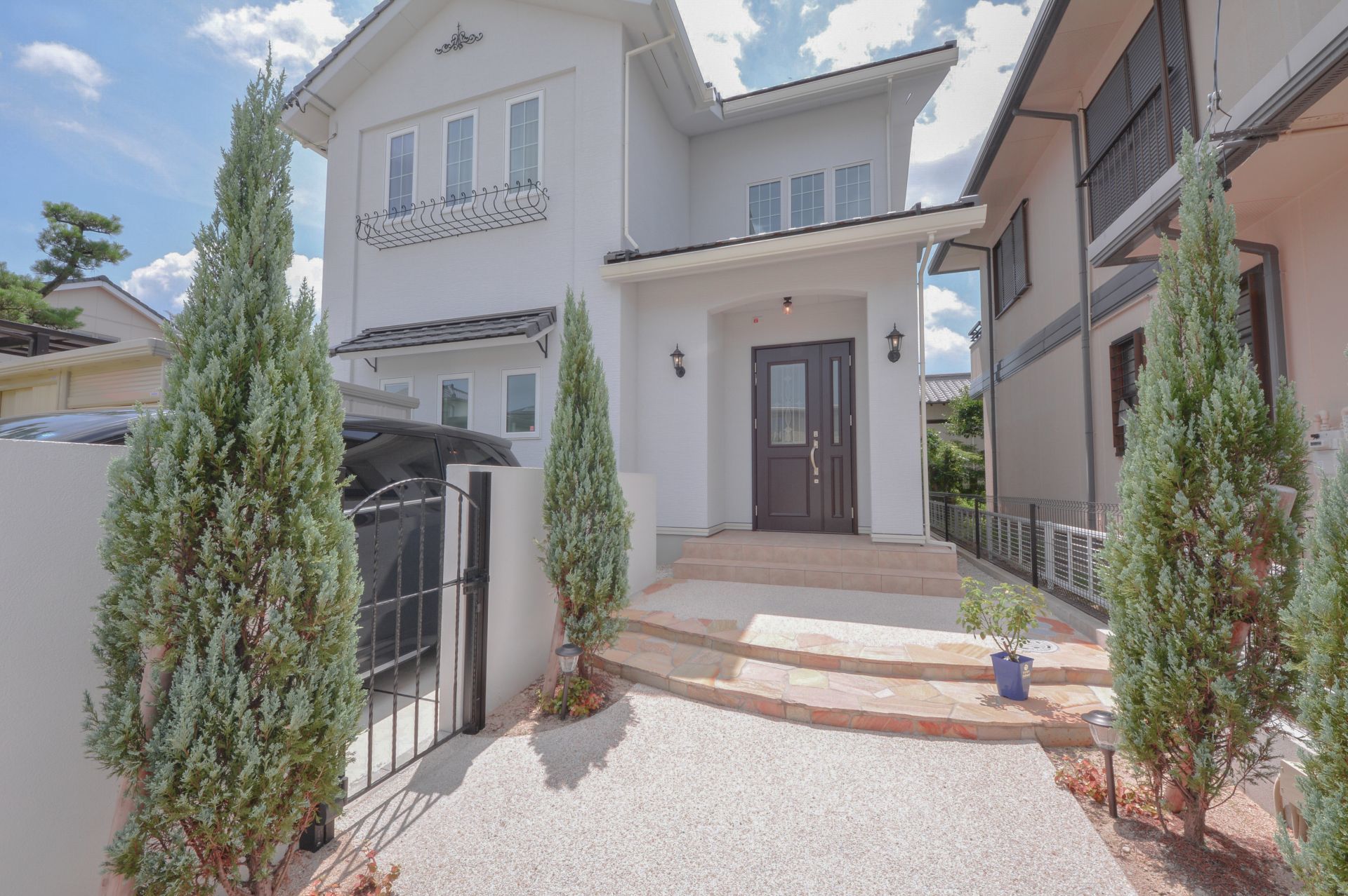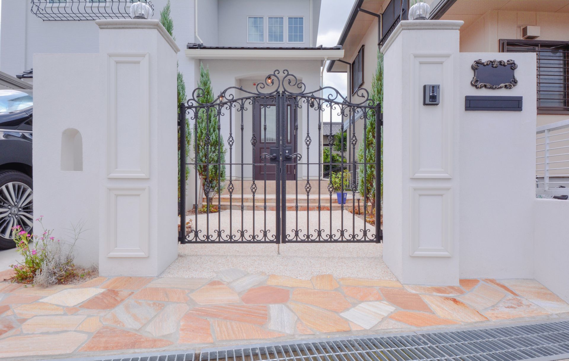 門柱はモールディングをバランス良く配置。中央には鋳物風の門扉を取り付け、白と黒のコントラストがきりっとした品格のある印象を与えてくれます。