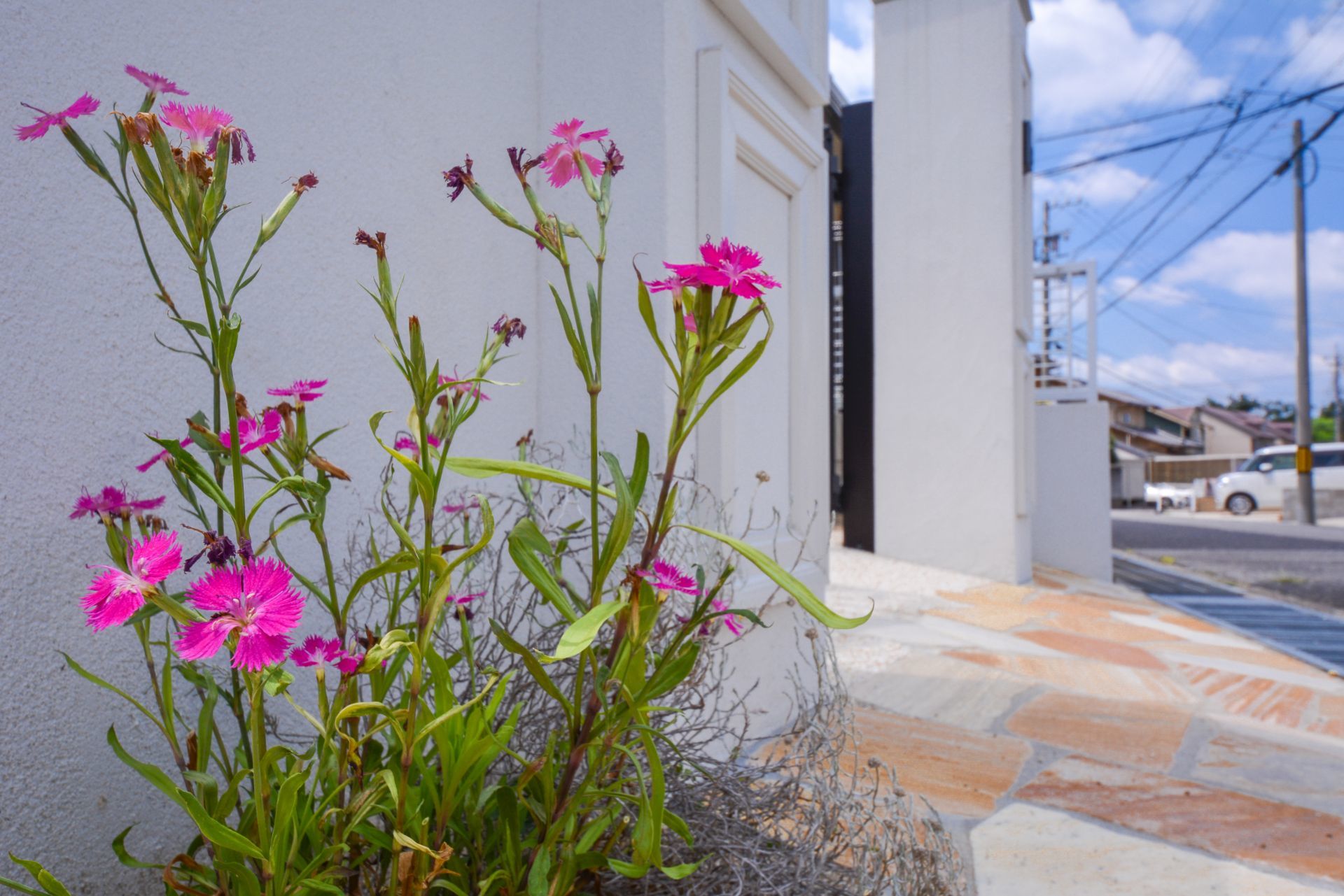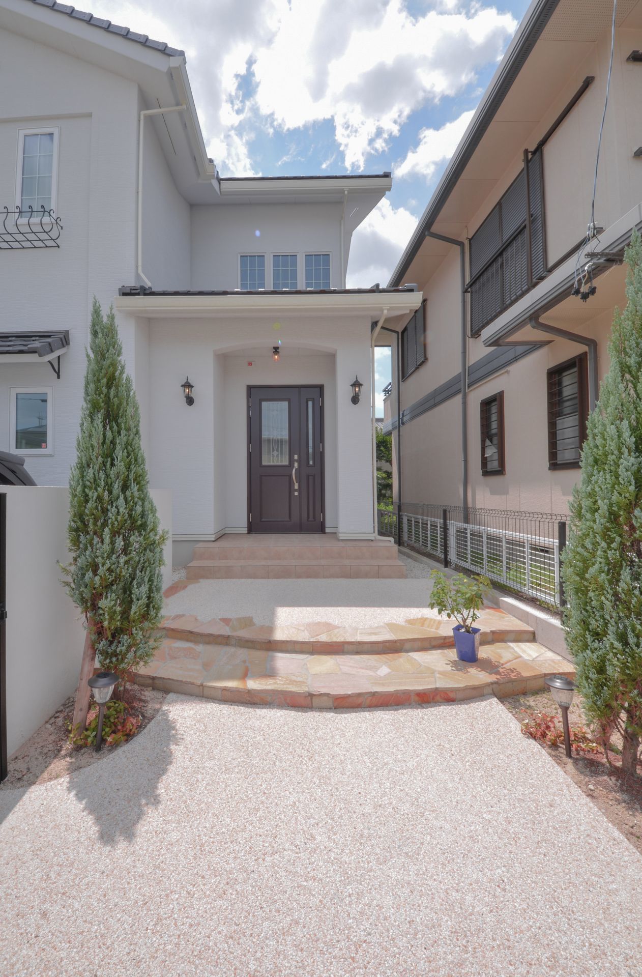 またアプローチには洗い出しと乱形石を使い、両側にコニファーなどの植栽を入れ込むことで、あたたかみを感じるデザインに仕上がりました。