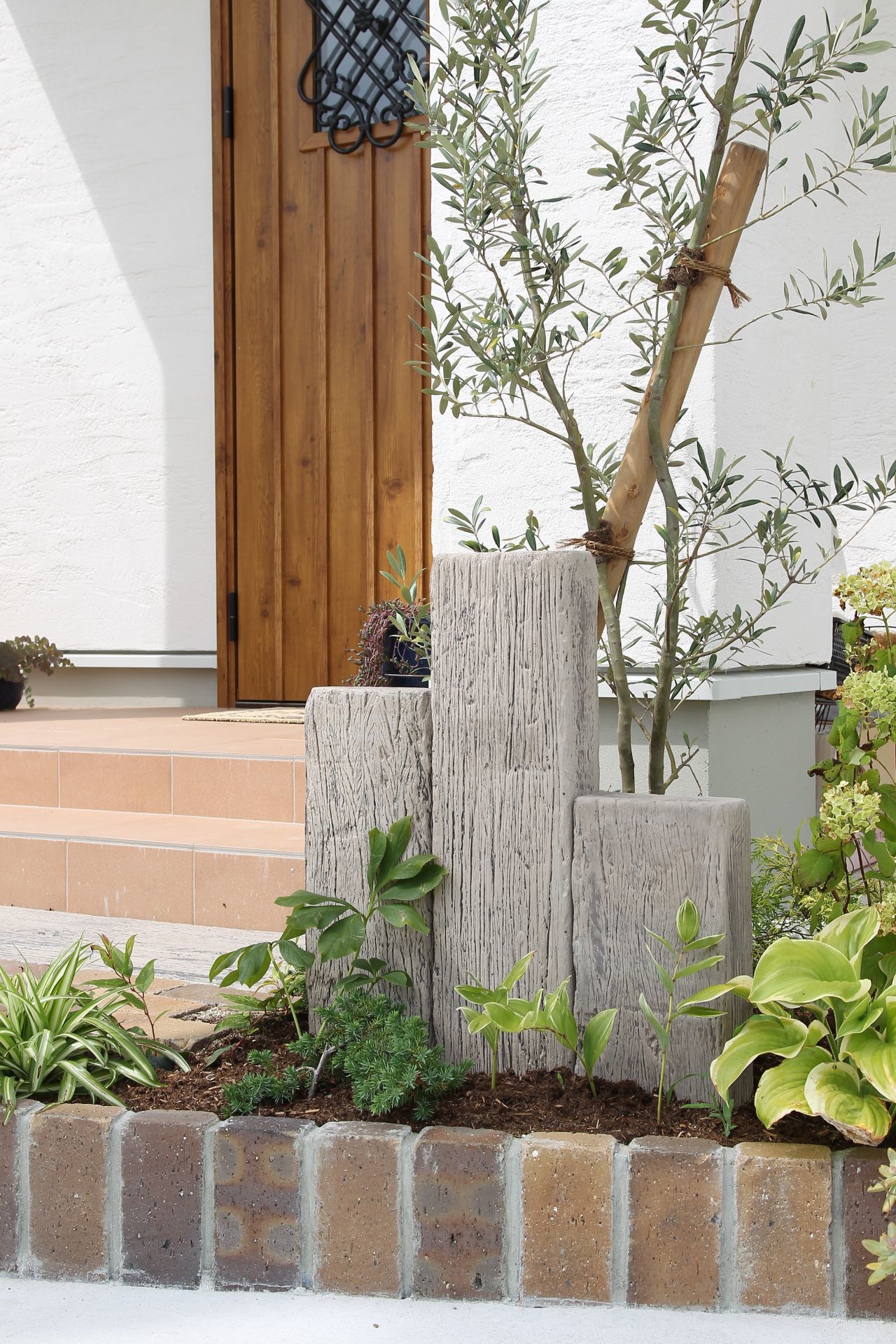 カントリー調の建物の雰囲気に合うお庭をつくりたいというご要望を踏まえてデザインをしました。全体的に一体感が出るようにレンガや枕木、洗い出しを用いてアプローチのデザインをし、2本の木の間を通って玄関への動線をつくりました。また、奥様は多肉植物がご趣味。たくさんお庭で育てられるよに、建物回りは全て多肉植物スペースとし、白い樹脂フェンスにも多肉植物が掛けられるようにしました。白い塗り壁やレンガを使用したデザインにすることで、建物のかわいらしい雰囲気とマッチしたあたたかみのある色合いのカントリー調ファサードになりました。