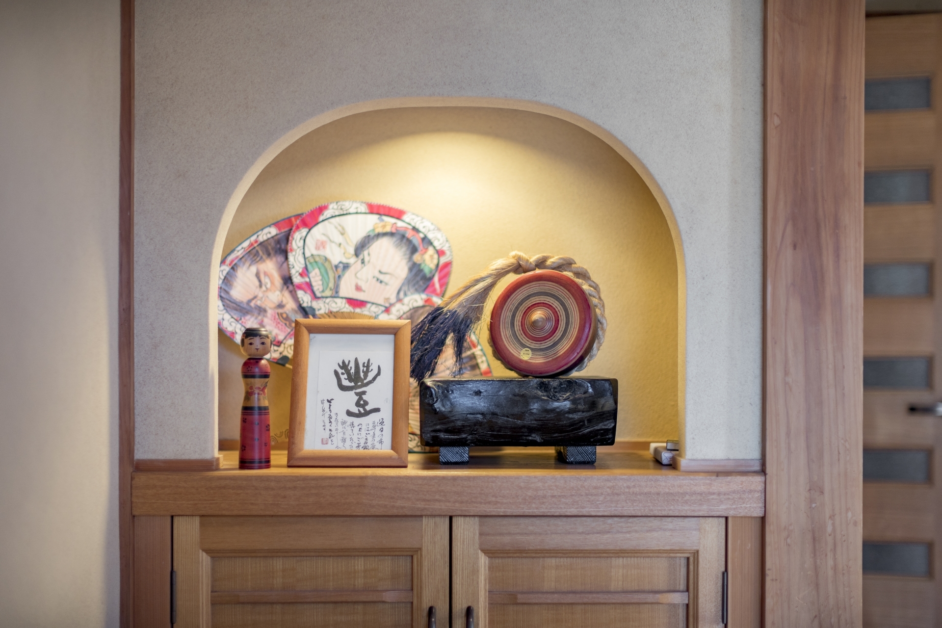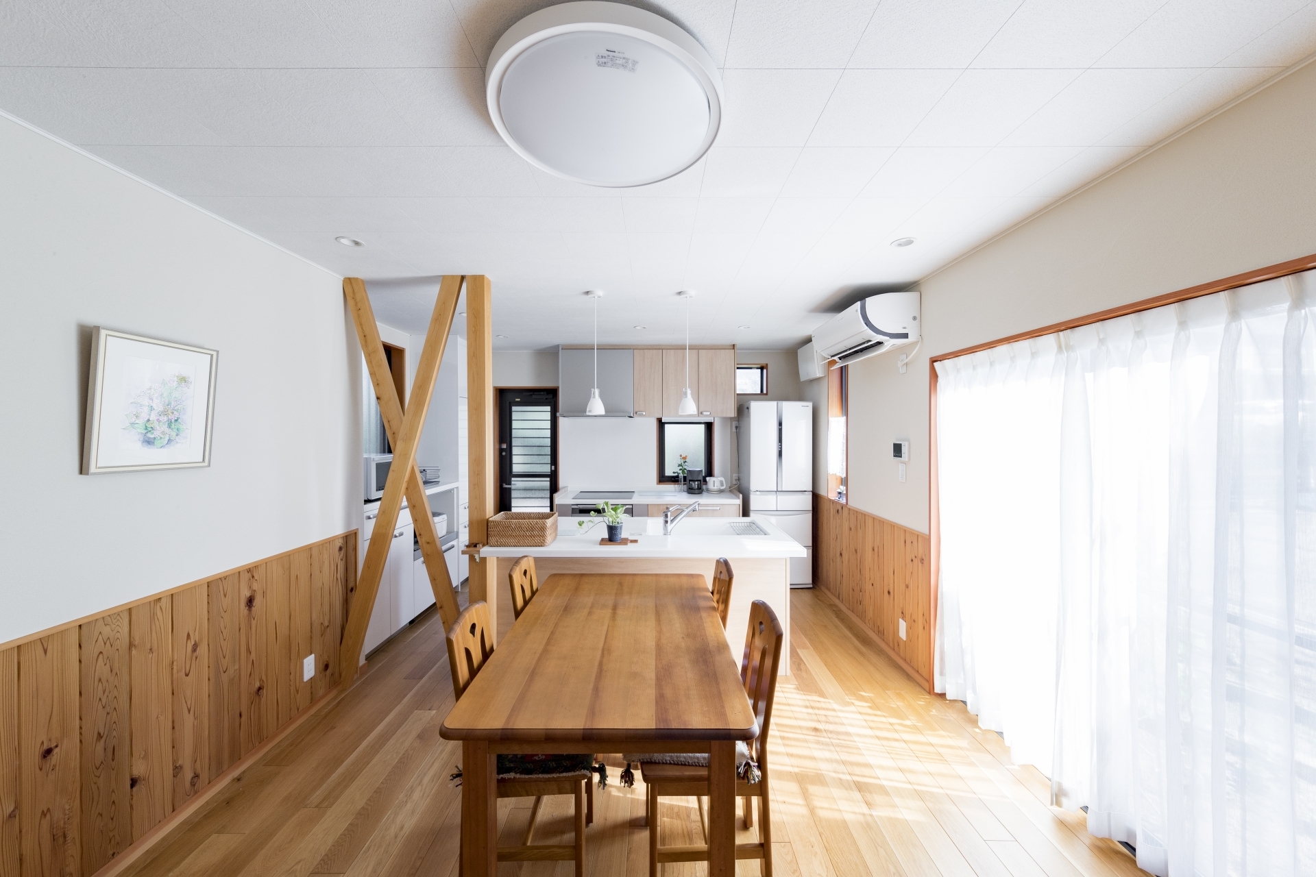 一番のお気に入りスペースは『キッチン』! T様のお宅は、室内のリフォームを数回に分けて、順番に工事をさせて頂きました。4度目のリフォームでは、キッチンに手をつける事に。以前はあまり光の入らない位置にあったキッチンを、一番明るい位置に移動させることにしました。今のキッチンは、日中晴れていれば、どこかからいつも光が差すそうで、喜んでいただいているご様子。明るいところでの、夕食の準備はとても快適だそうです。お客様を迎えた時に、キッチンでお茶をすることがあり、対面式キッチンにしたので「話をしながら準備できるのもいいですね」とおっしゃっていました。楽しいティータイムの時間を過ごされているのが目に浮かびます。T様と弊社との出会いは、玄関の床の合板がベコベコになり、無垢板の床にできないものか…と悩んでいた際に、たまたま行ったハウズで相談したところ、親切に教えてもらえたことがきっかけだったそうです。その後、無垢板の良さをしっかり教えてもらえたのが、T様にとっては、弊社にご依頼をいただく決め手となったと教えていただけました。選んで頂いた無垢板の床は「やっぱり良かった!」とのご感想を頂きました。古い柱はそのまま生かし、新しい建具とも自然に調和するように仕上げました。4度のリフォームを通して、同じこだわりを軸に進めることで、一体感のある空間ができ、喜んで頂けているようです。