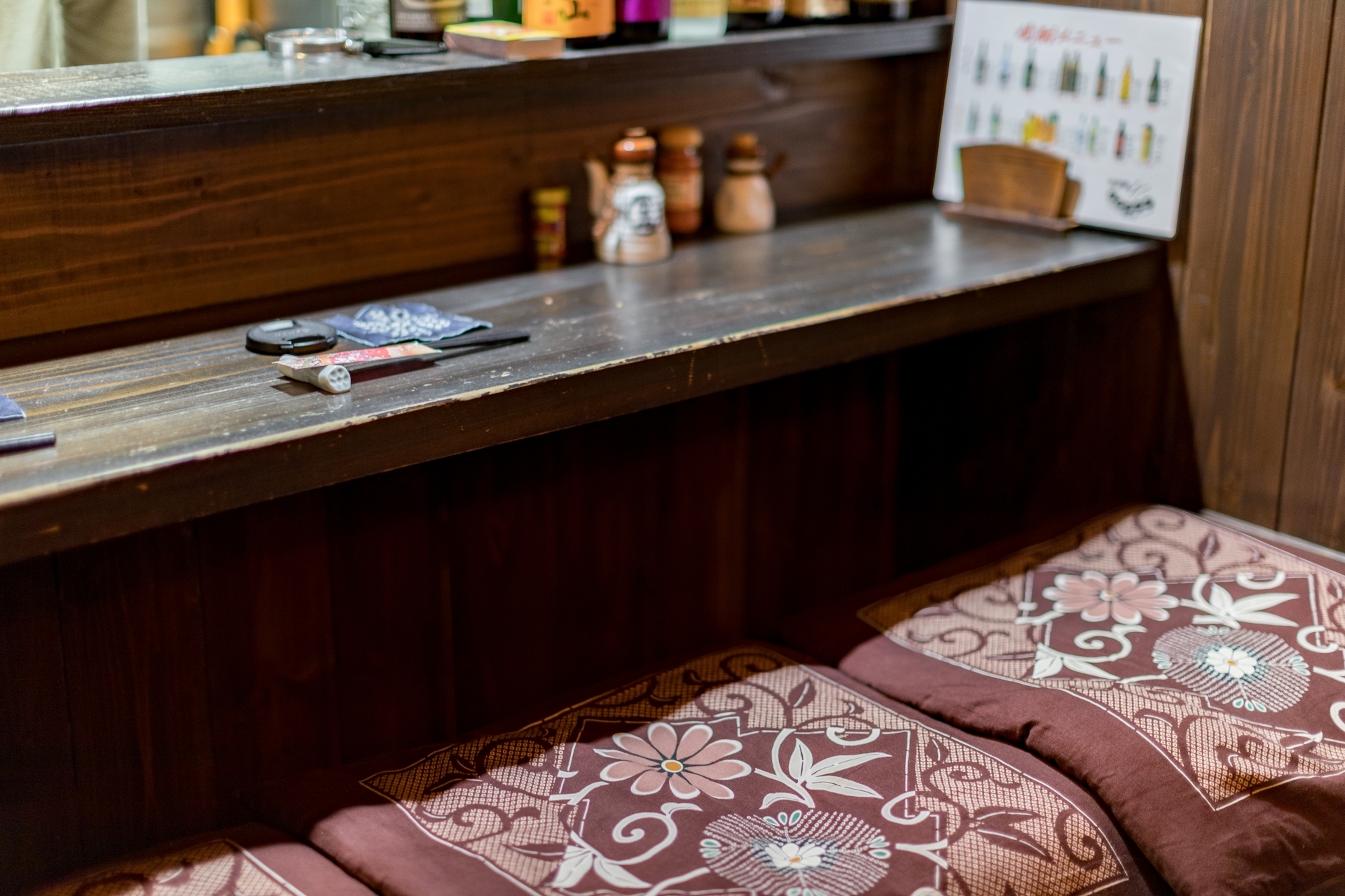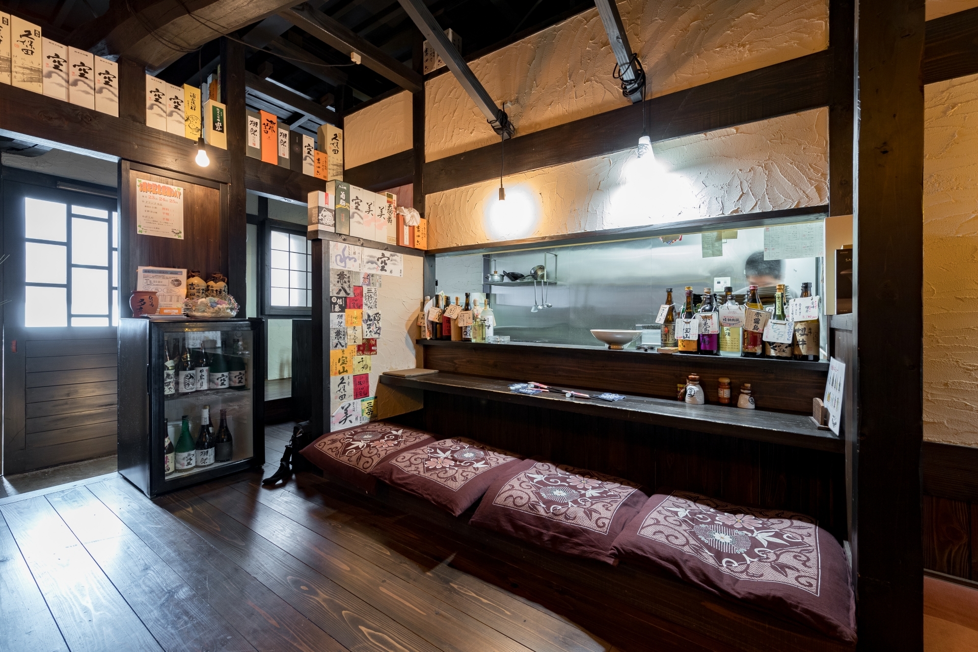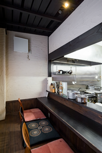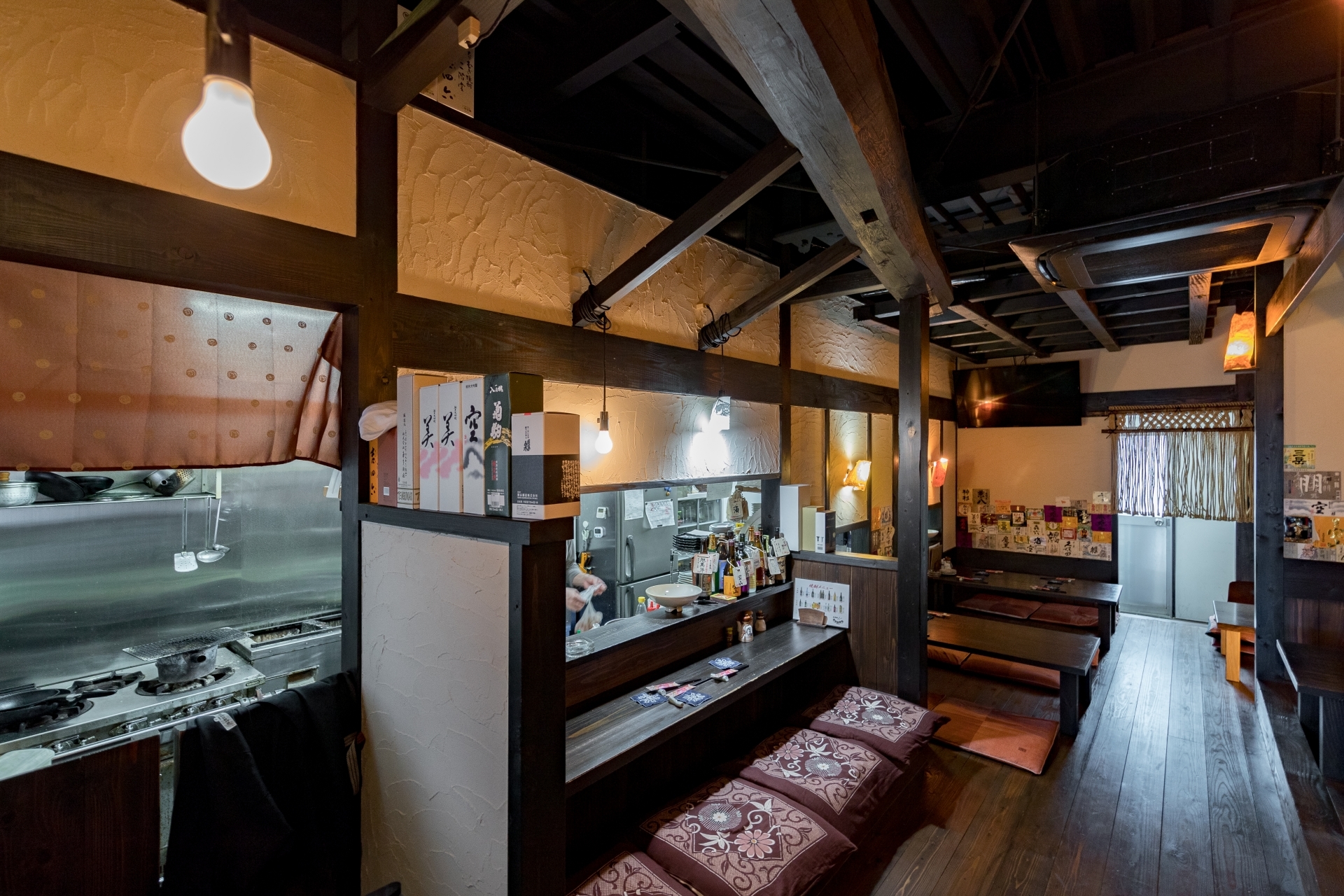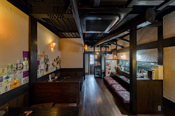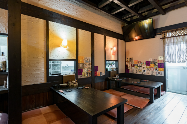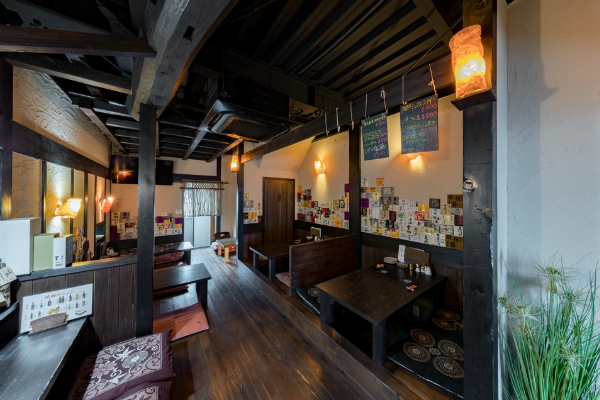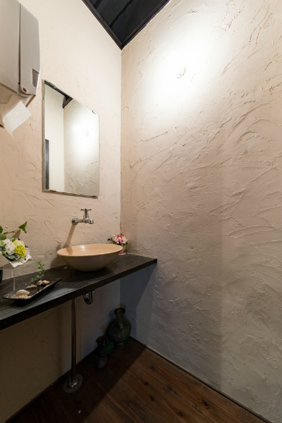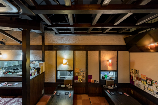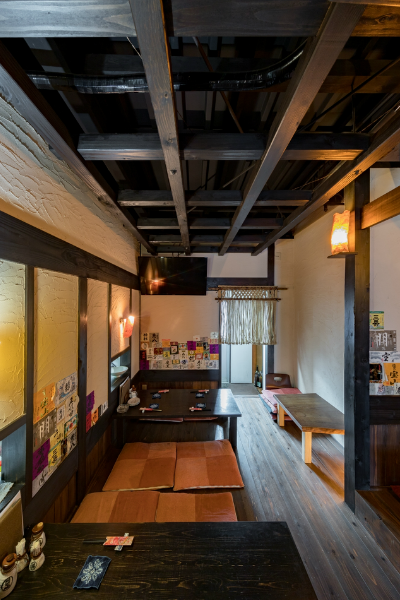 「酒蔵や古民家のような居酒屋」どこか懐かしい空間で、お料理を楽しんでいただく為の、くつろげる空間づくりにこだわりたい!…というのが、オーナー様の思いでした。材木屋が母体の弊社でなら、良質な木材を提供してもらえるのでは?というのが、今回、ご依頼いただくきっかけとなりました。工事過程での一番の思い出を伺うと「壁の珪藻土塗りを行ったこと」と教えていただきました。「大変だ…」と感じたことも「楽しい!」と感じたことも、この壁塗り体験だったそうです。初めは慣れない作業に苦戦された事と思いますが、全ての壁が塗り終わる頃には、とても上手く壁が塗れるようになっていたのではないでしょうか。オーナー様ご自身にも、頑張って頂いた店内の仕上がりは「全て気に入っている」とのうれしいお言葉をいただきました。なかでも一番のお気に入りは天井の太い梁だそうです。この材は、担当者が奈良県まで古材を探しに行って、運び入れた物です。この古材の梁が、お店の雰囲気づくりのベースにもなっています。あたたかい色味の照明や、壁、木材の色味・質感など、細部へのこだわりが、落ち着いた雰囲気のくつろげる空間を演出しています。