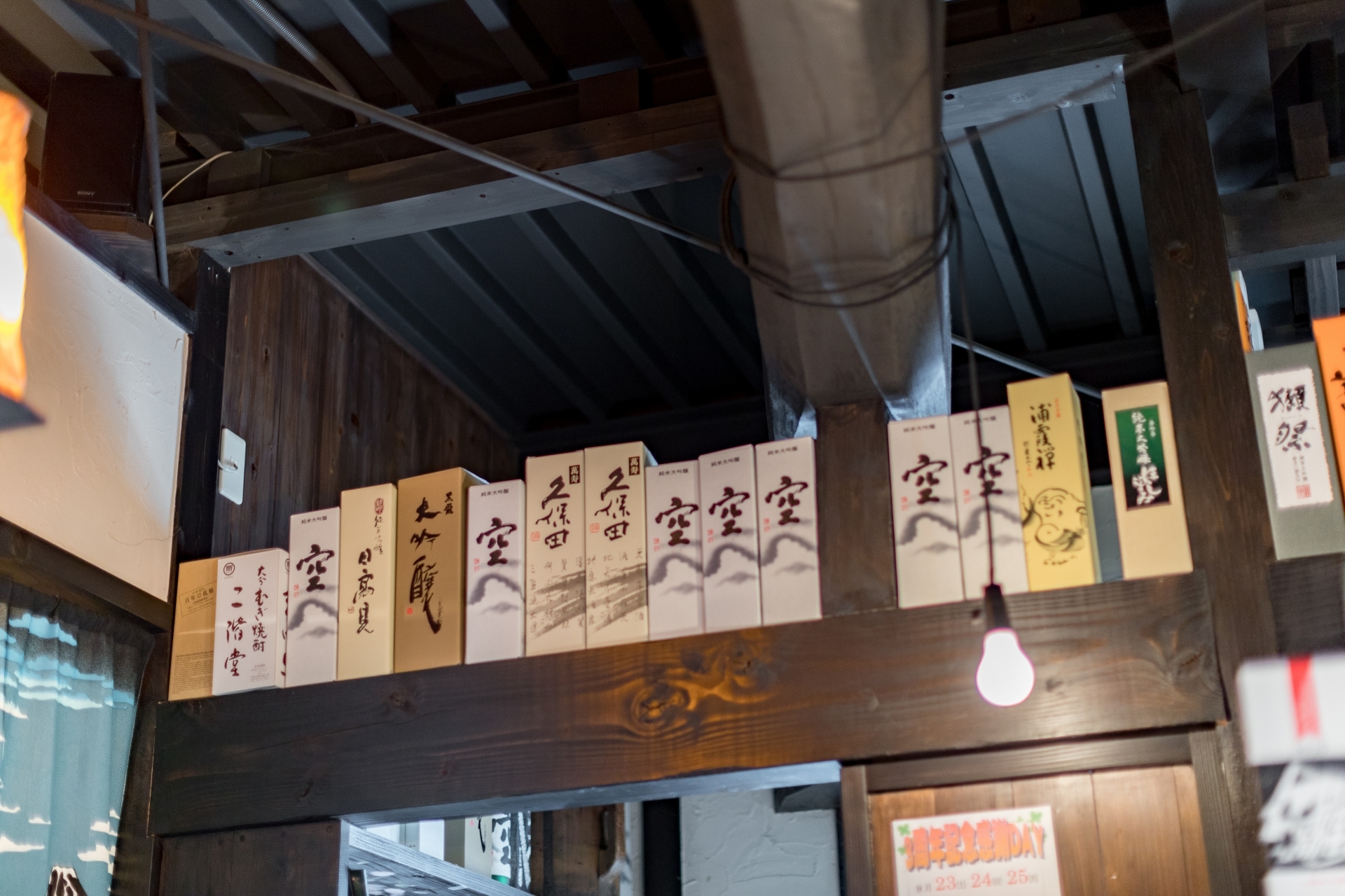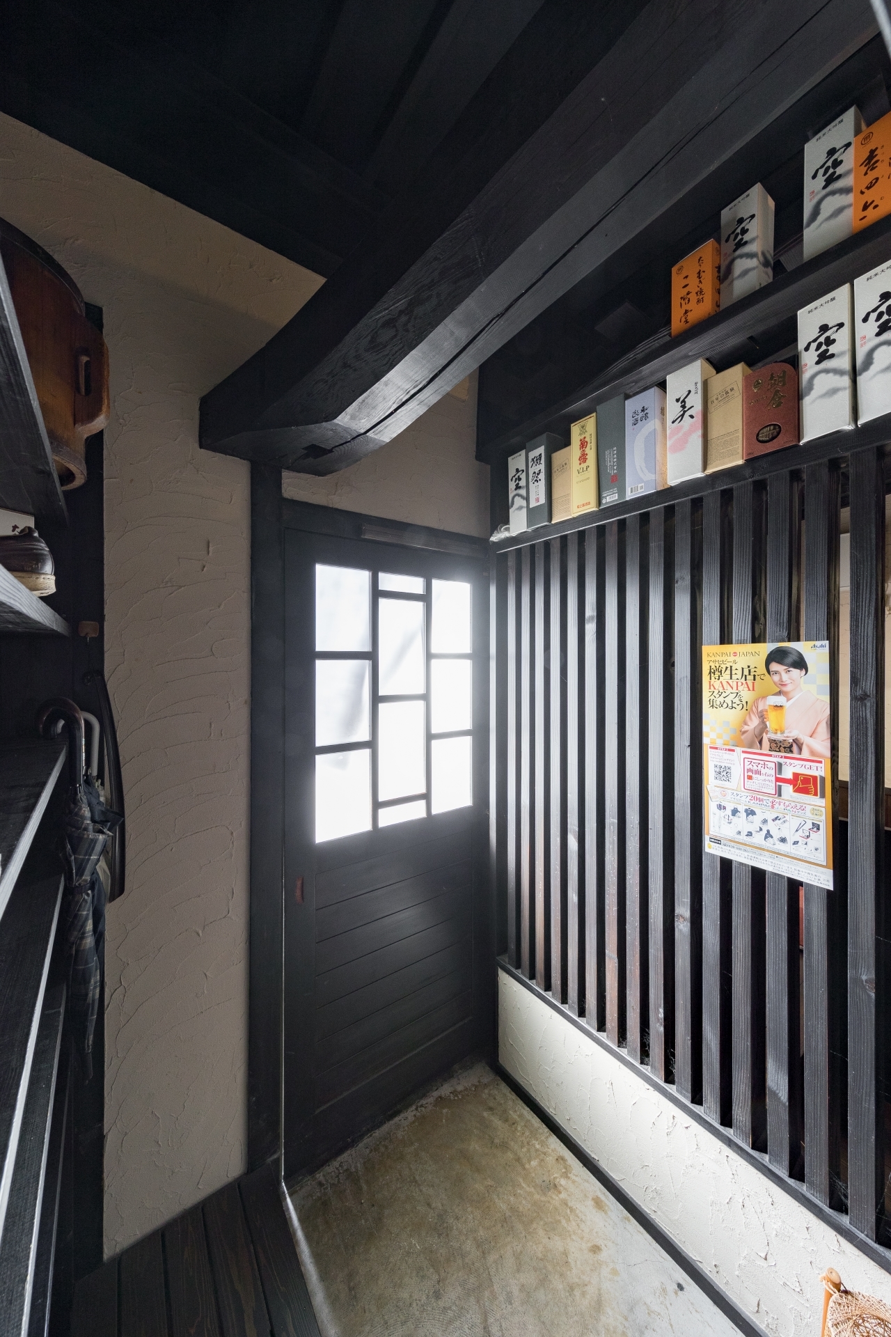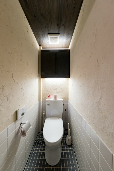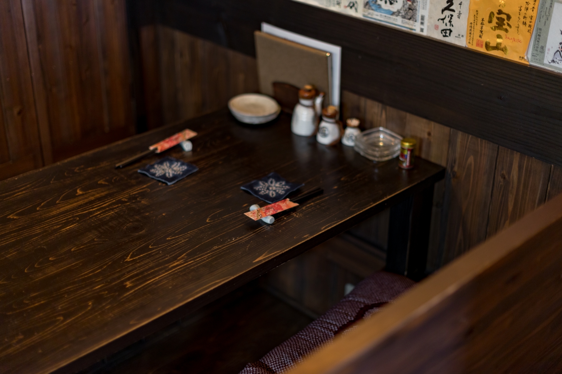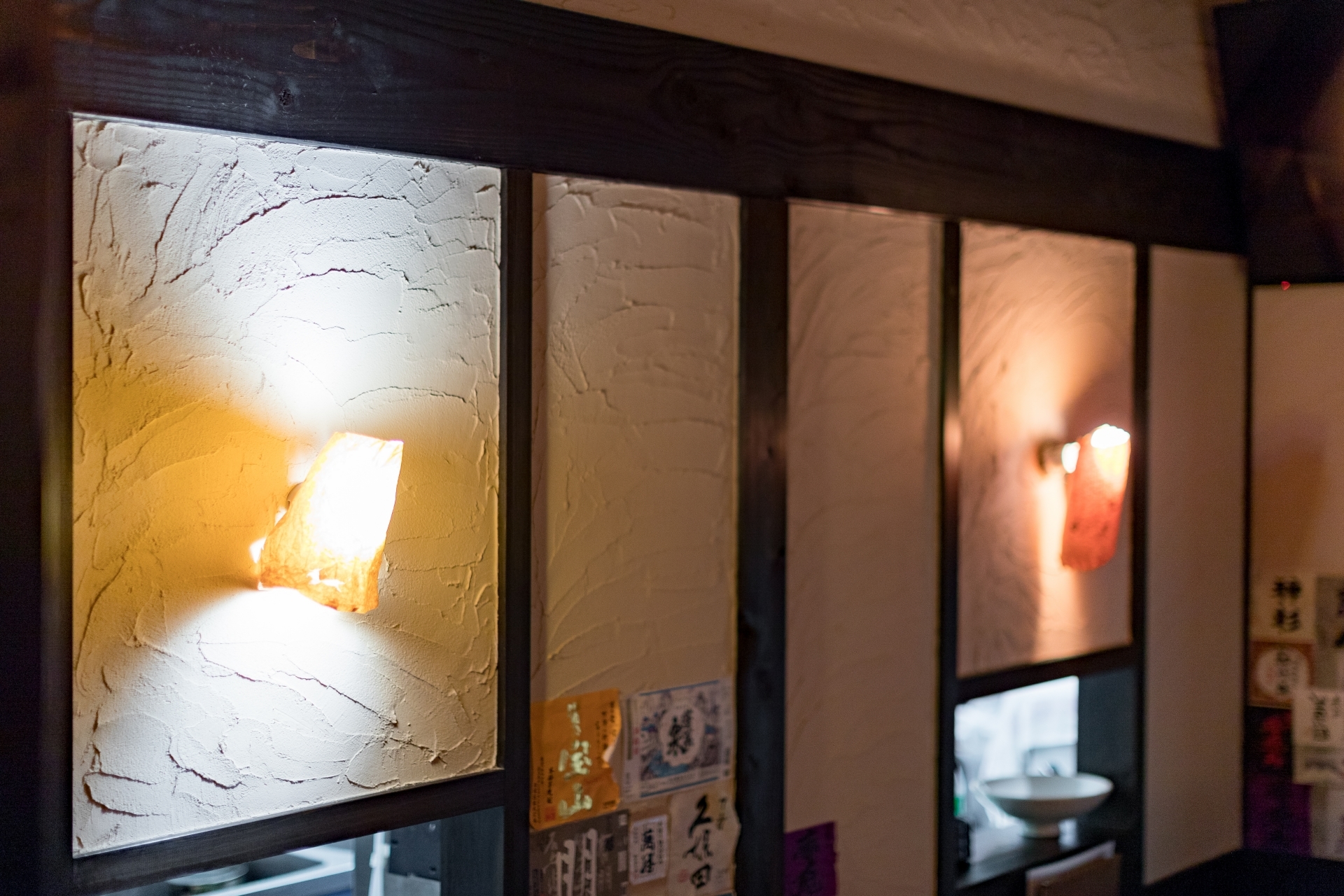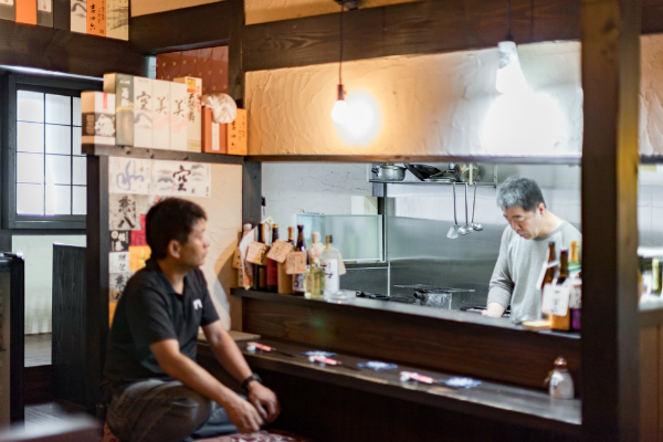 「酒蔵や古民家のような居酒屋」どこか懐かしい空間で、お料理を楽しんでいただく為の、くつろげる空間づくりにこだわりたい!…というのが、オーナー様の思いでした。材木屋が母体の弊社でなら、良質な木材を提供してもらえるのでは?というのが、今回、ご依頼いただくきっかけとなりました。工事過程での一番の思い出を伺うと「壁の珪藻土塗りを行ったこと」と教えていただきました。「大変だ…」と感じたことも「楽しい!」と感じたことも、この壁塗り体験だったそうです。初めは慣れない作業に苦戦された事と思いますが、全ての壁が塗り終わる頃には、とても上手く壁が塗れるようになっていたのではないでしょうか。オーナー様ご自身にも、頑張って頂いた店内の仕上がりは「全て気に入っている」とのうれしいお言葉をいただきました。なかでも一番のお気に入りは天井の太い梁だそうです。この材は、担当者が奈良県まで古材を探しに行って、運び入れた物です。この古材の梁が、お店の雰囲気づくりのベースにもなっています。あたたかい色味の照明や、壁、木材の色味・質感など、細部へのこだわりが、落ち着いた雰囲気のくつろげる空間を演出しています。