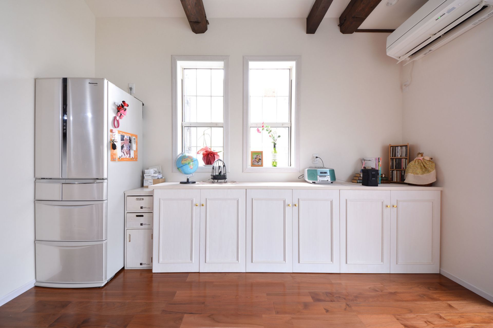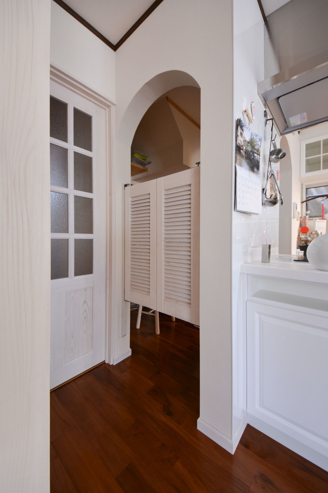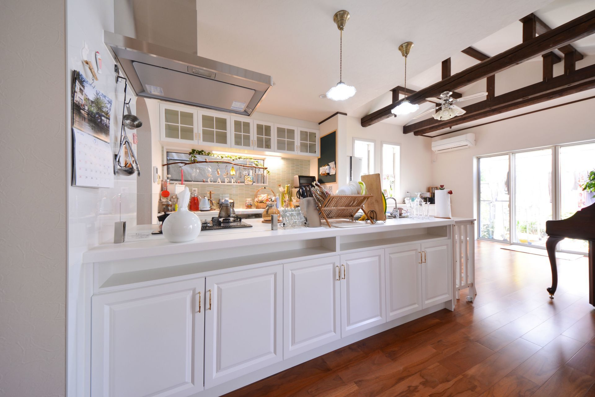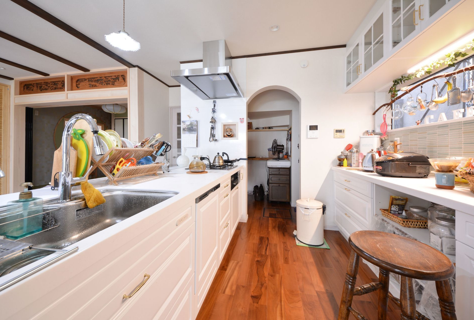 6年前、洗面台リフォームをさせていただいたことがきっかけで、当時できなかったキッチンリフォームを6年越しにさせていただきました。奥様がメルヘンでナチュラルな感じにしたいというご要望でしたので、キッチンや建具をホワイト基調で揃え、木材をポイントとして仕上げました。